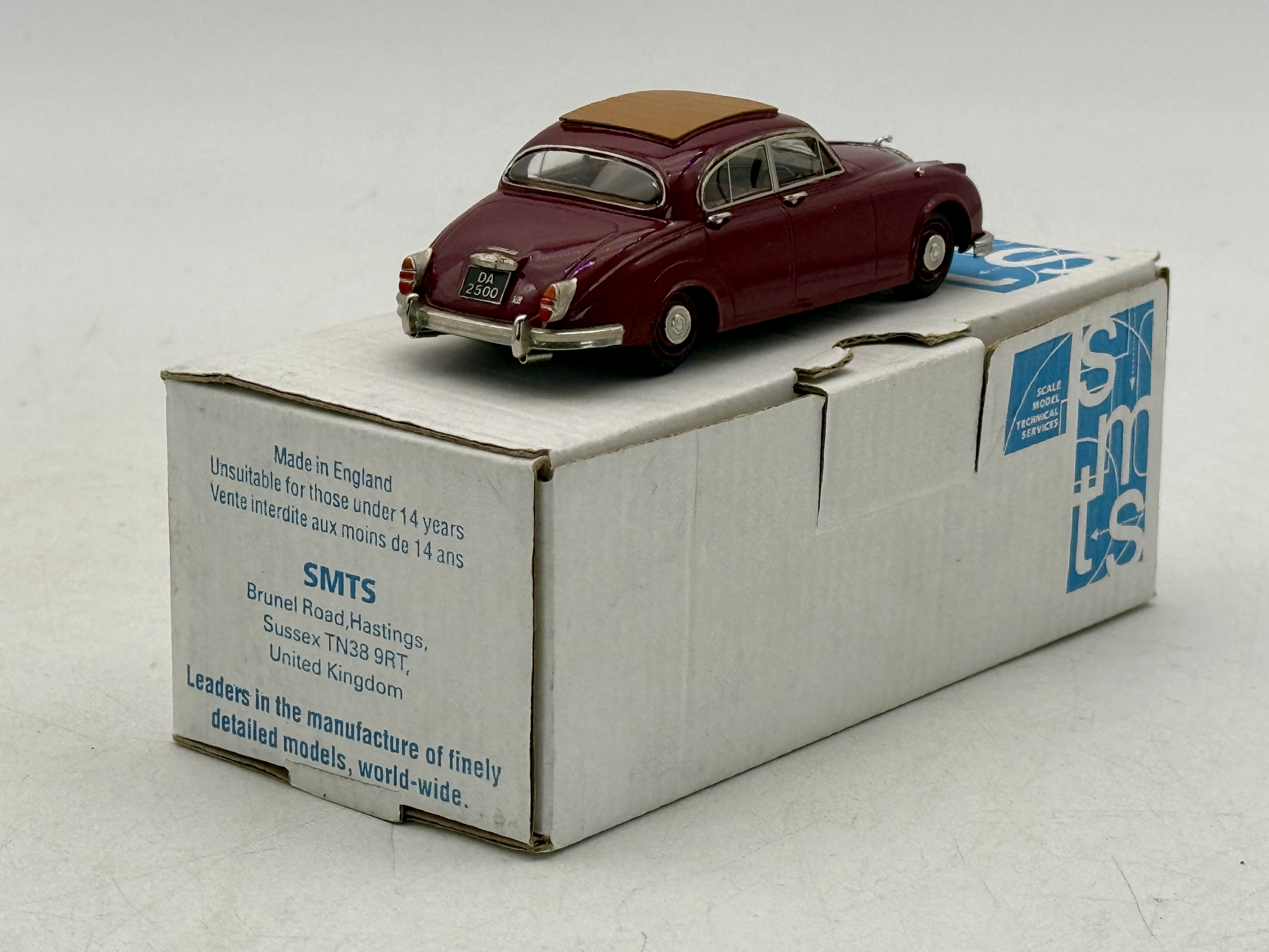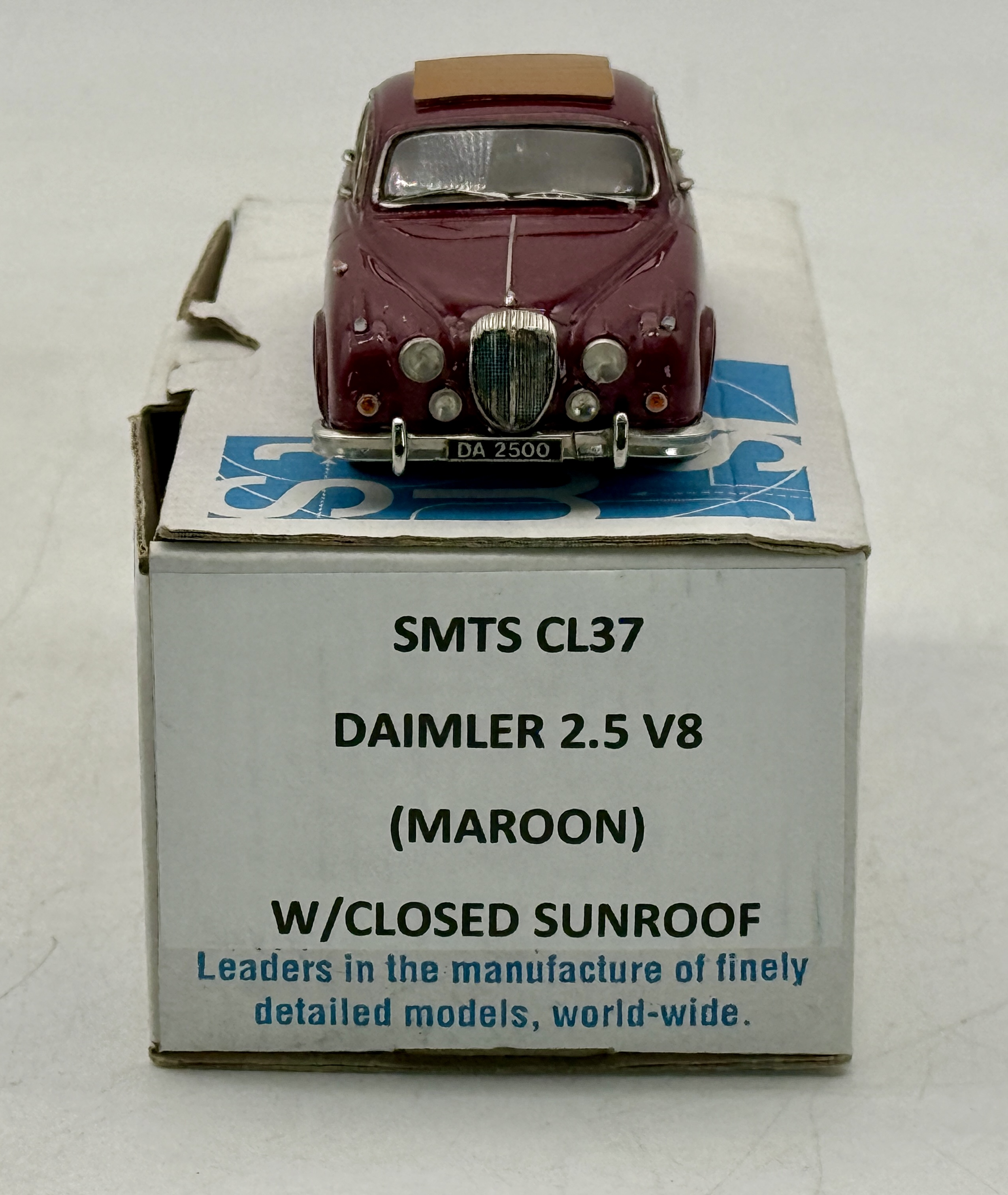 A maroon SMTS CL37 Daimler 2.5 V8 model car featuring a closed sunroof and its original manufacturer box from Hastings, England. white metal, 1:43 scale OB C9.