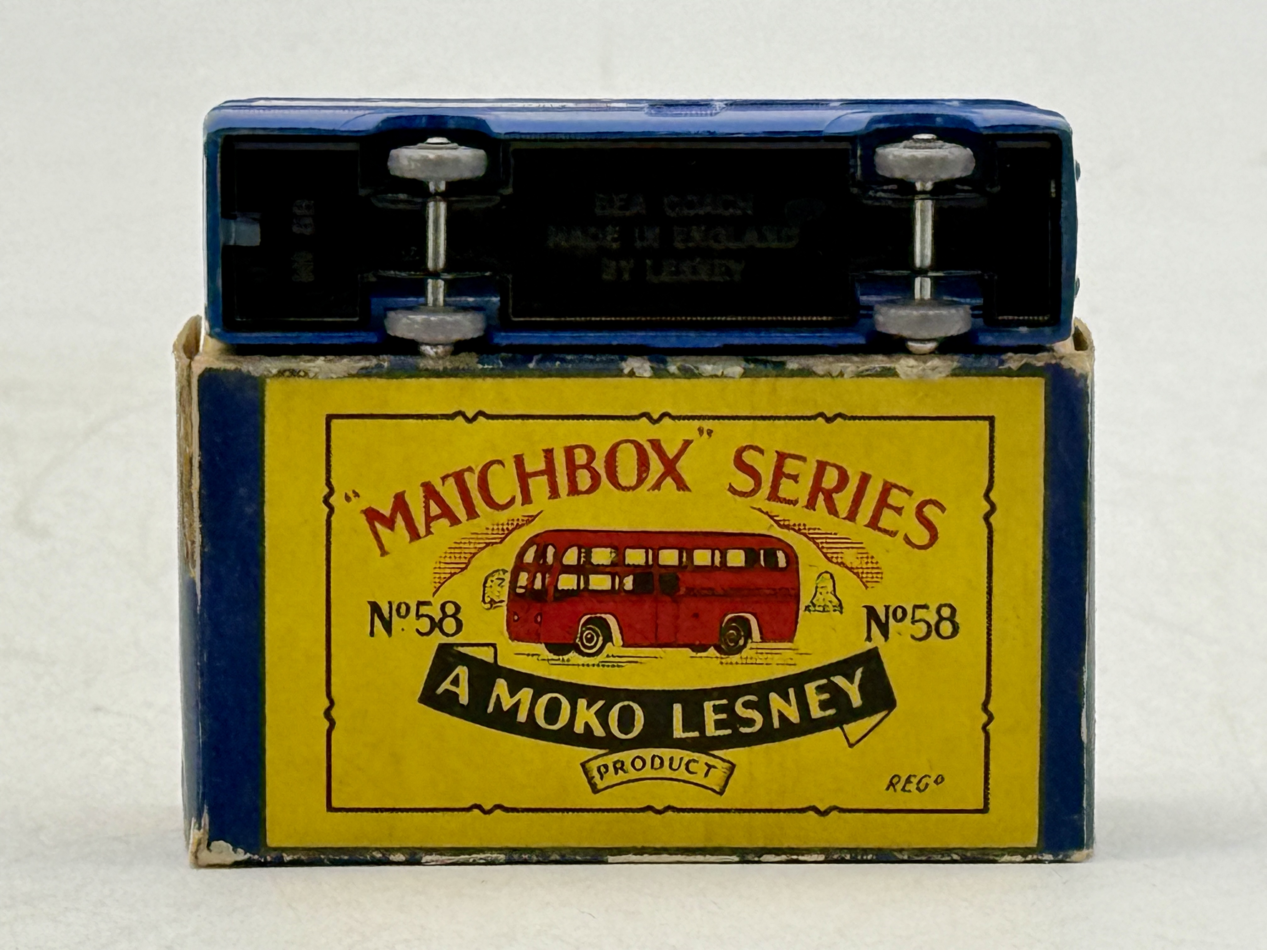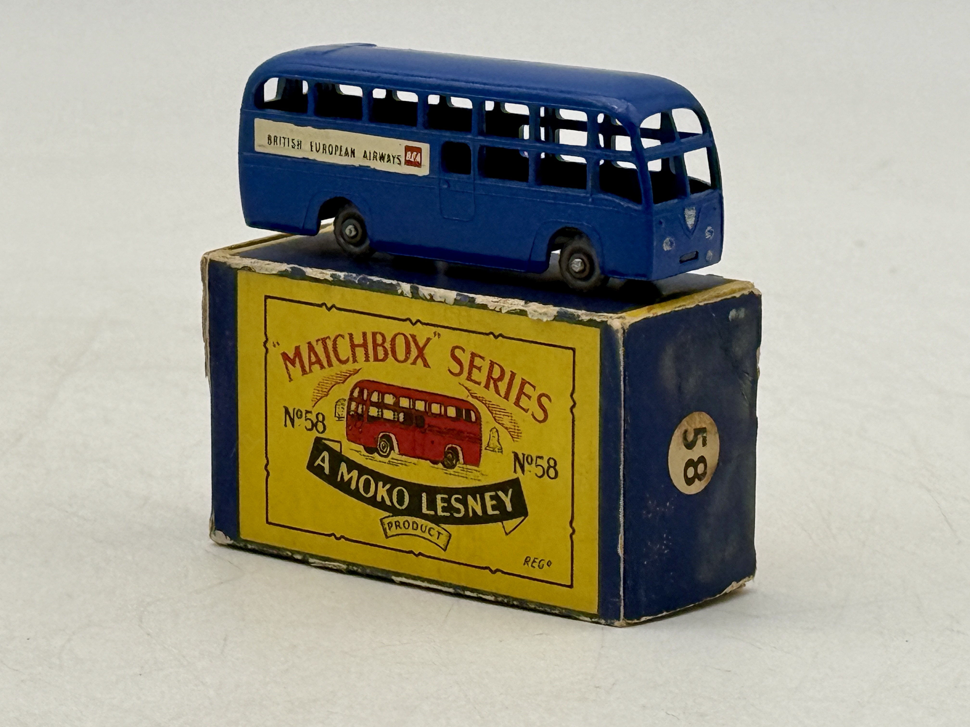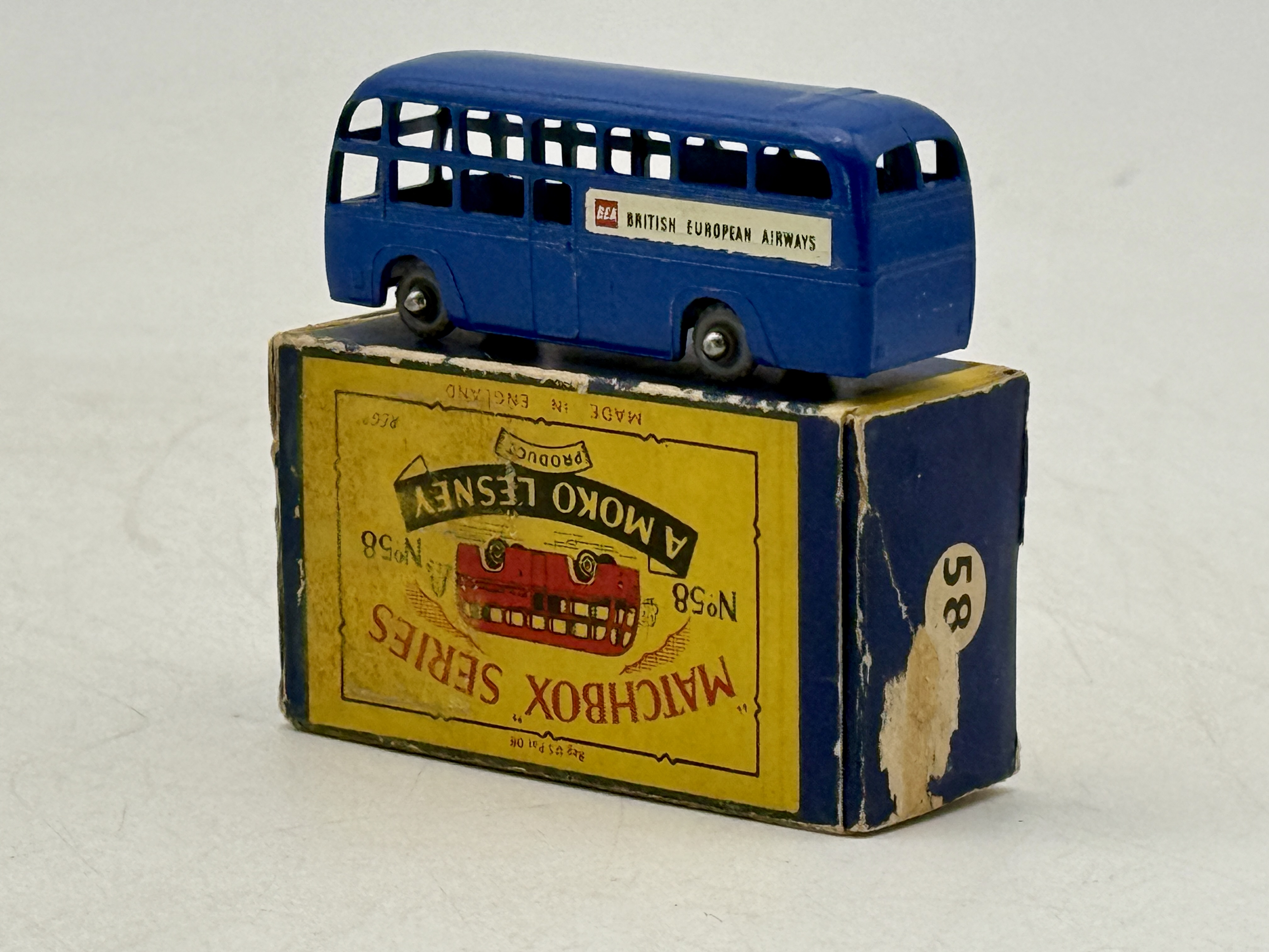 A blue die-cast BEA coach toy vehicle featuring British European Airways decals and its original Moko Lesney Matchbox Series No. 58A1 box. OB mw C8-9.