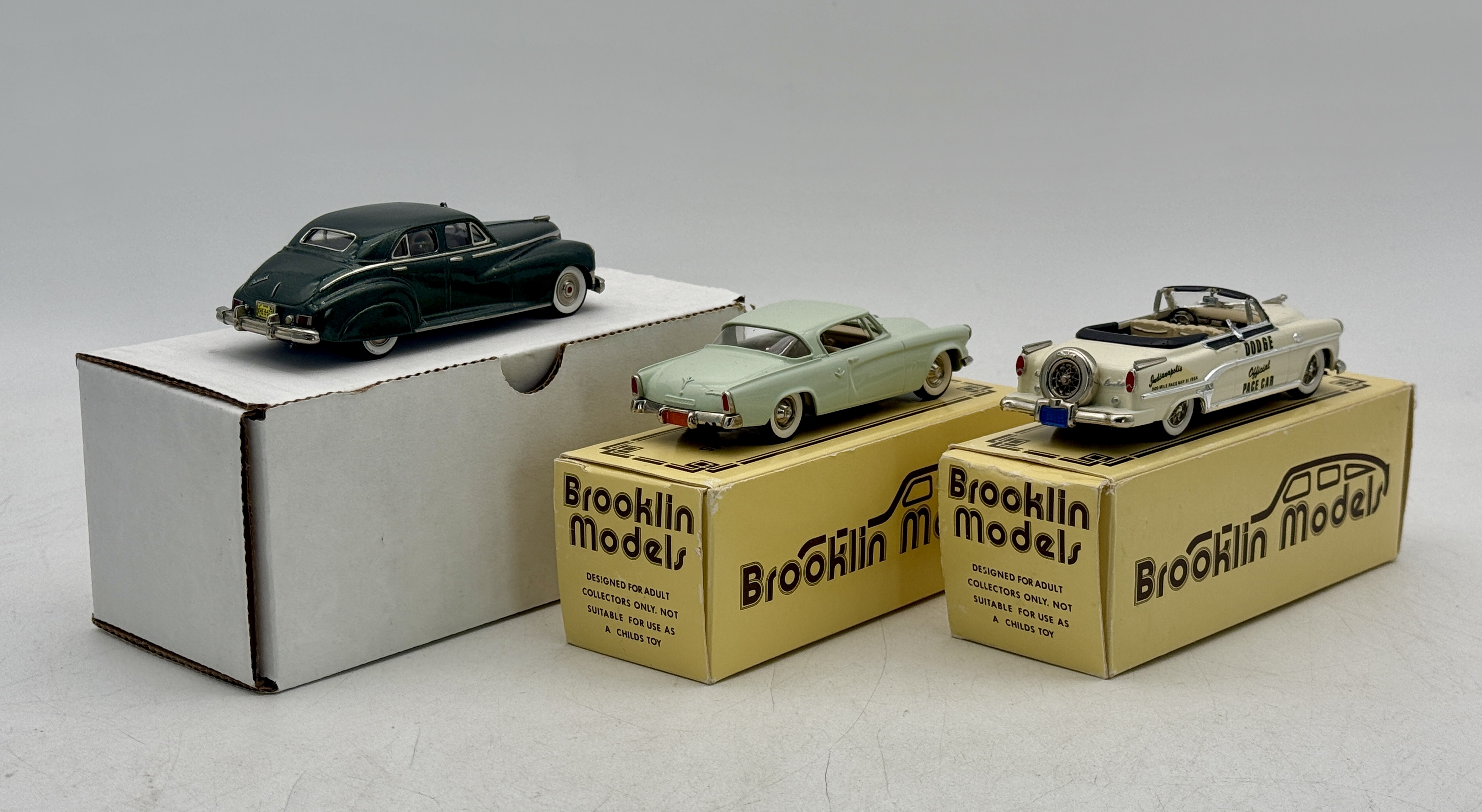 3 Brooklin models, White metal, 1:43 scale, BRK30X 1954 Dodge base car, BRK32 1953 Studebaker, BRK18a 1947 Packard with custom details, OB’s mw C8–9