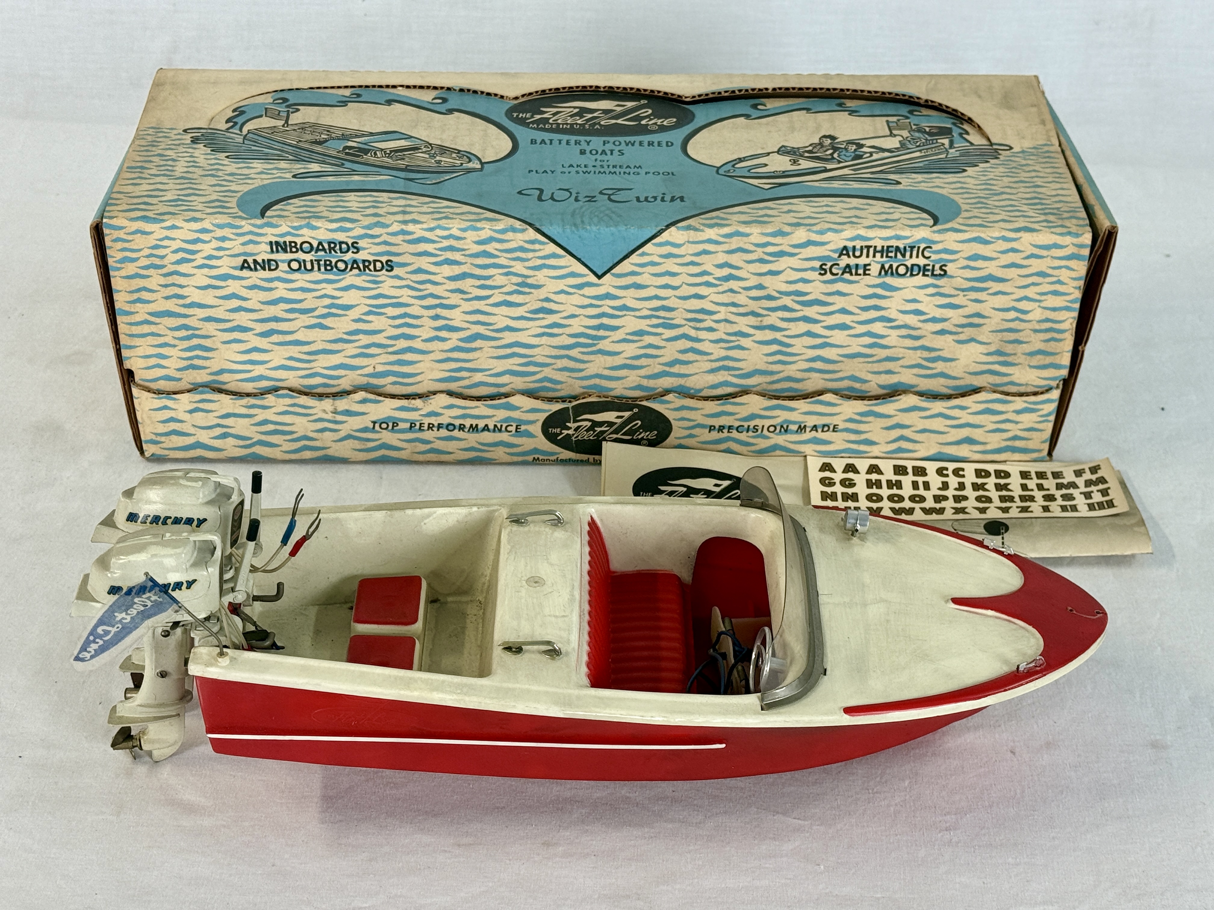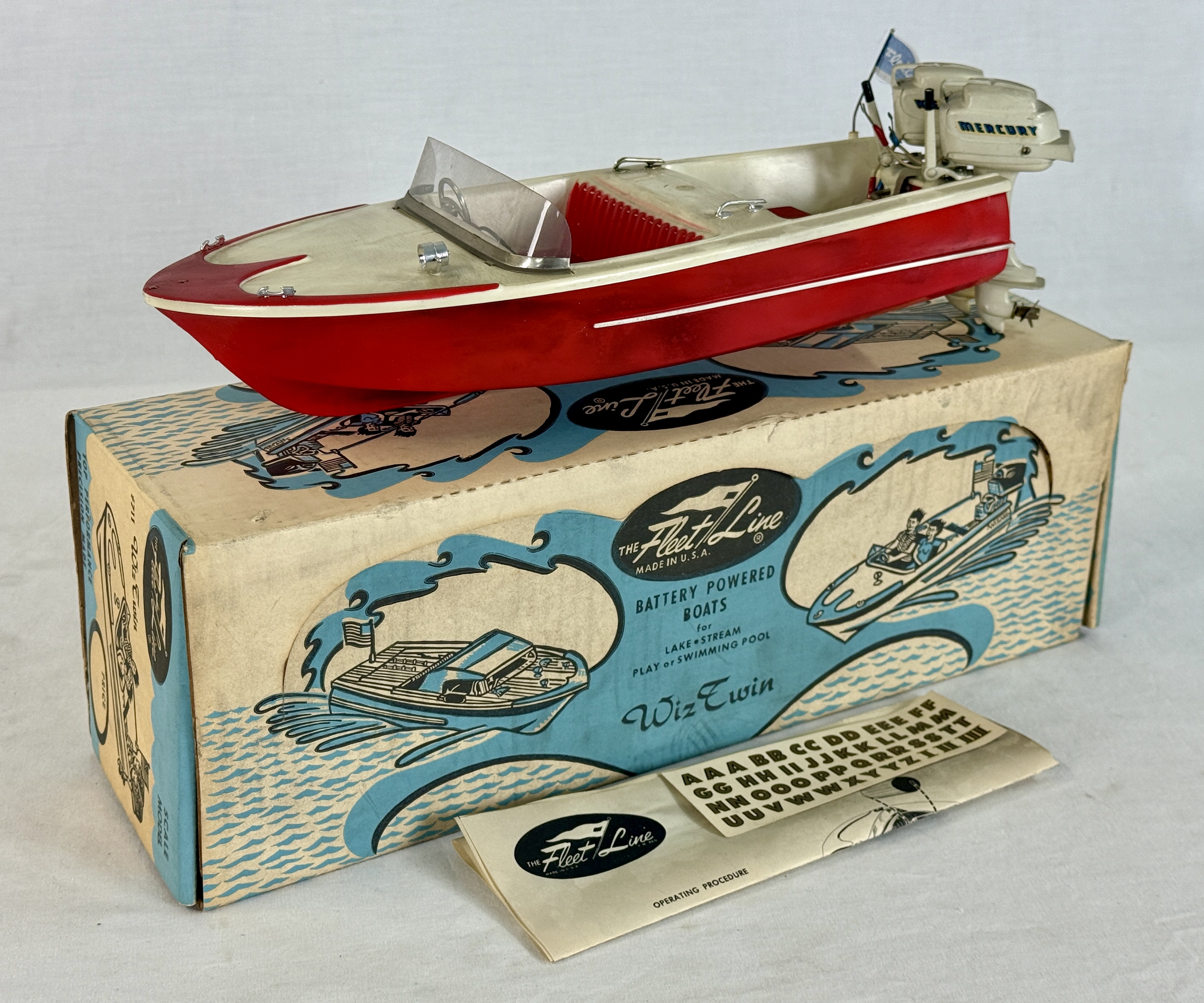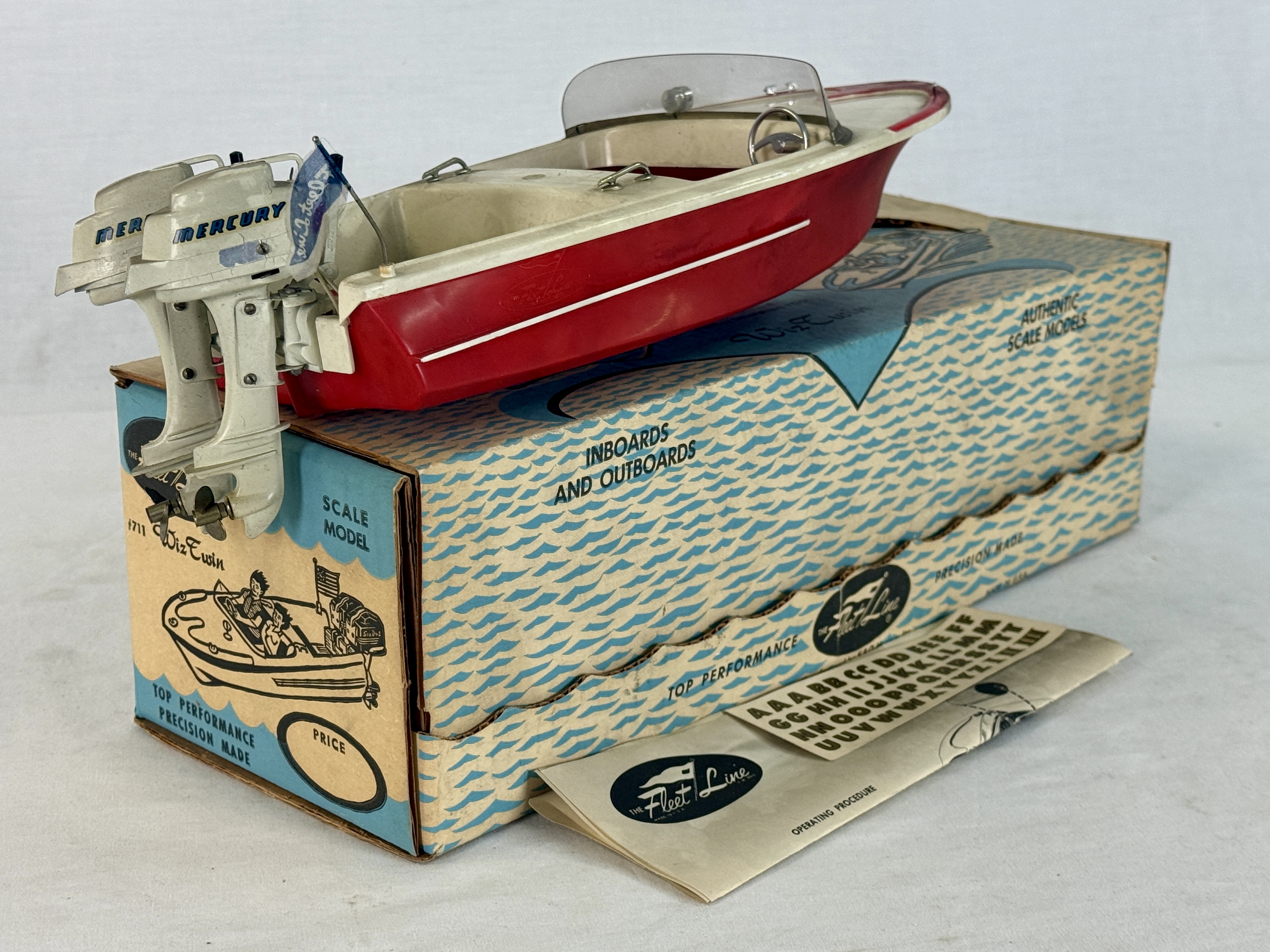 A red and white Fleet Line Wiz Twin battery-powered toy boat featuring dual Mercury outboard motors 14 inches long, accompanied by its original illustrated box, operating instructions, and a sheet of dry transfer lettering, one outboard motor has a paint chip, This toy has not been used, C10.