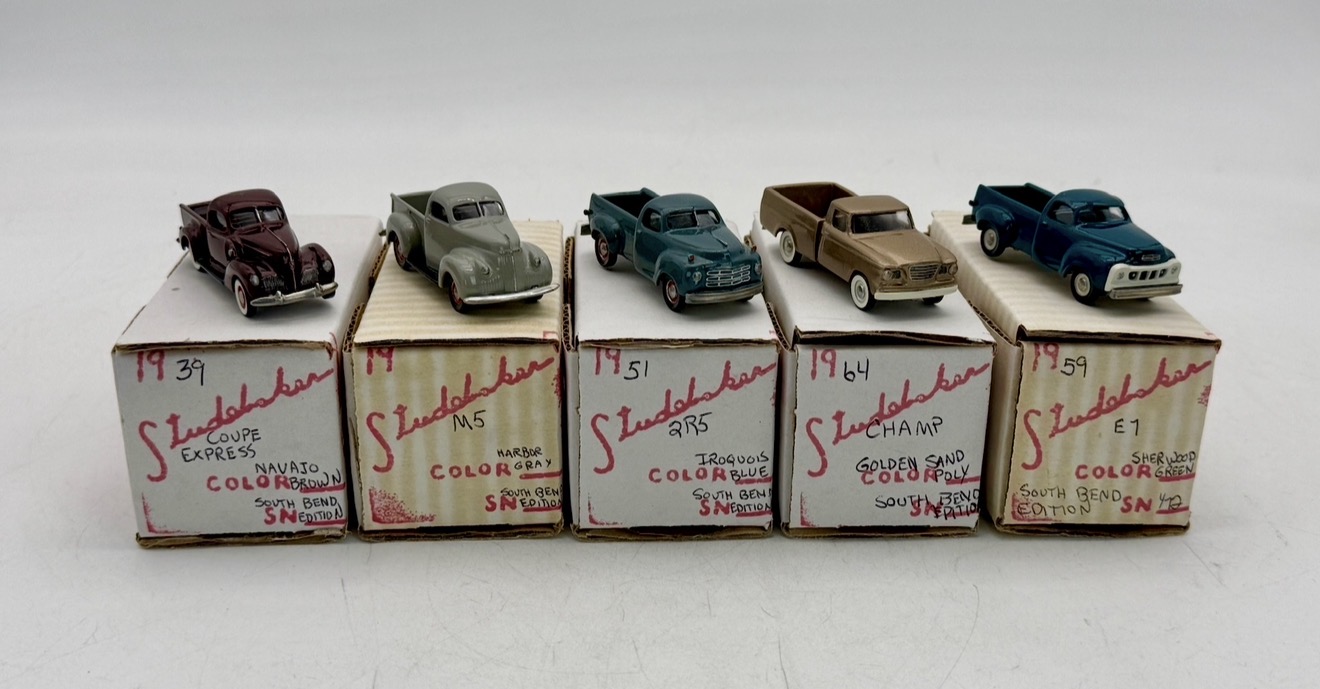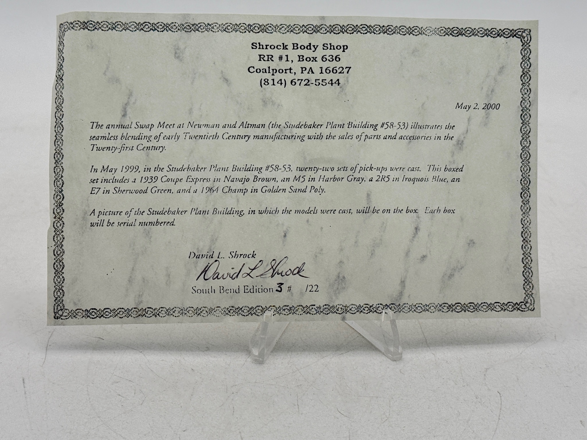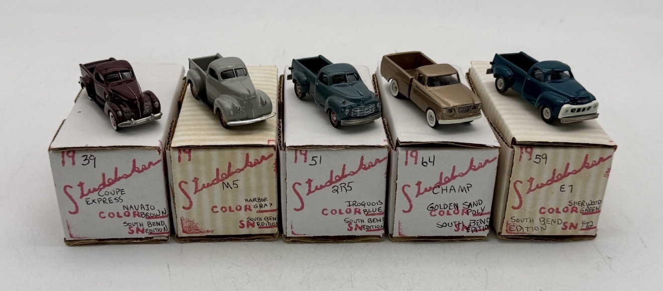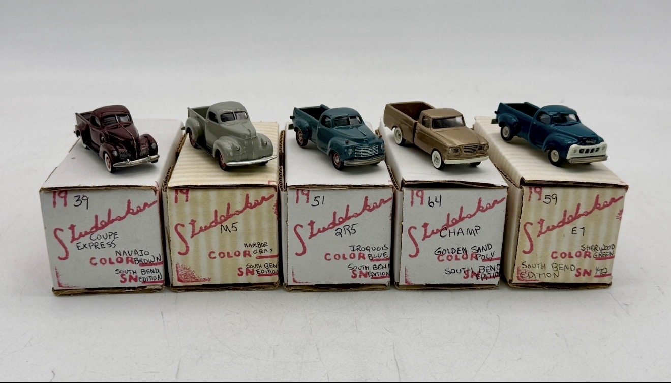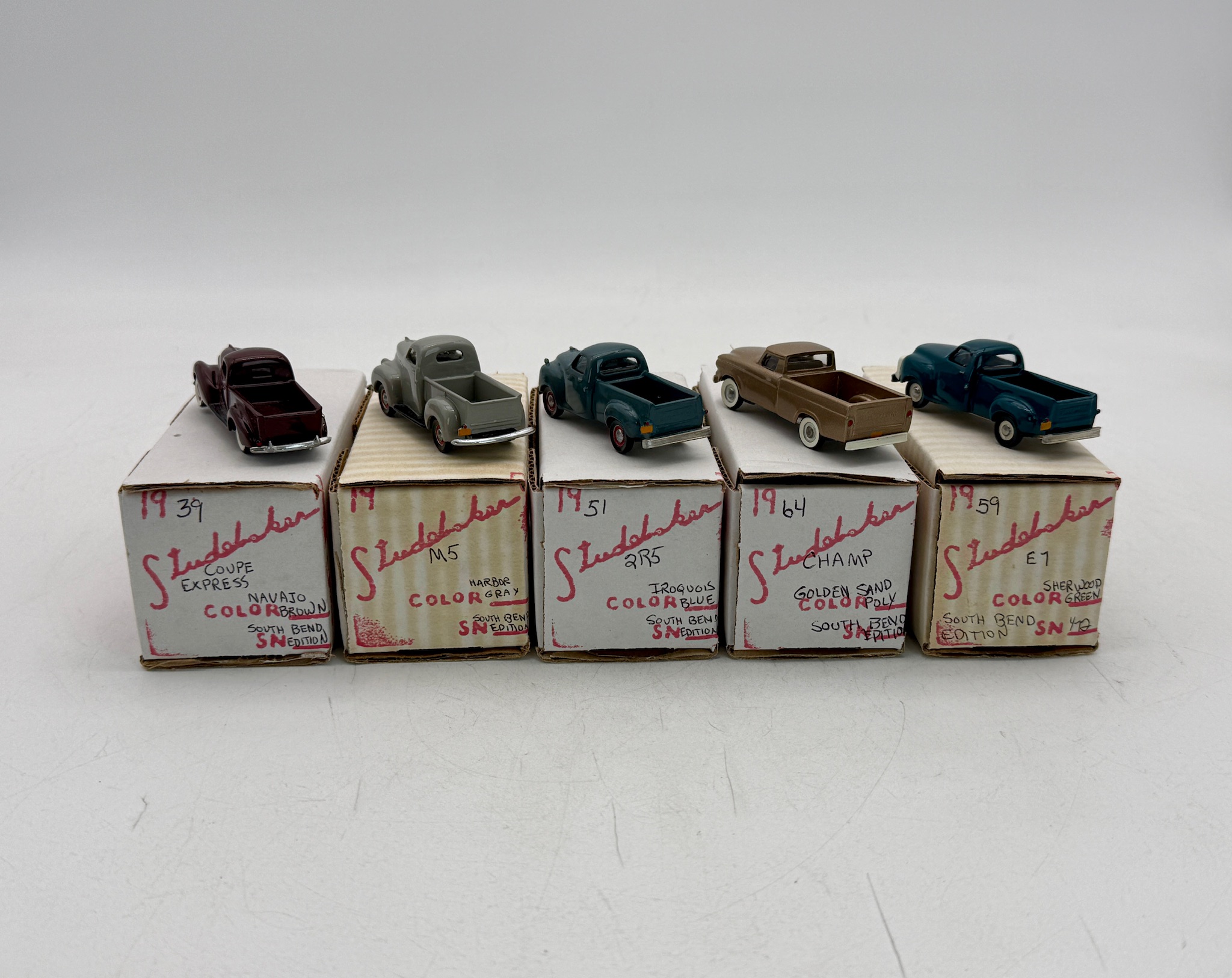 Five Shrock South Bend Edition Studebaker model pickup trucks in various colors, 1:72 scale. Contains 1939 coupe Express, M5 pick up, 1951 2R5 pick up. 1959 E7 pick up, 1964 champ, all are marked south bend edition was certificate dates May 2000 signed by David Schrock. OBS MW C9