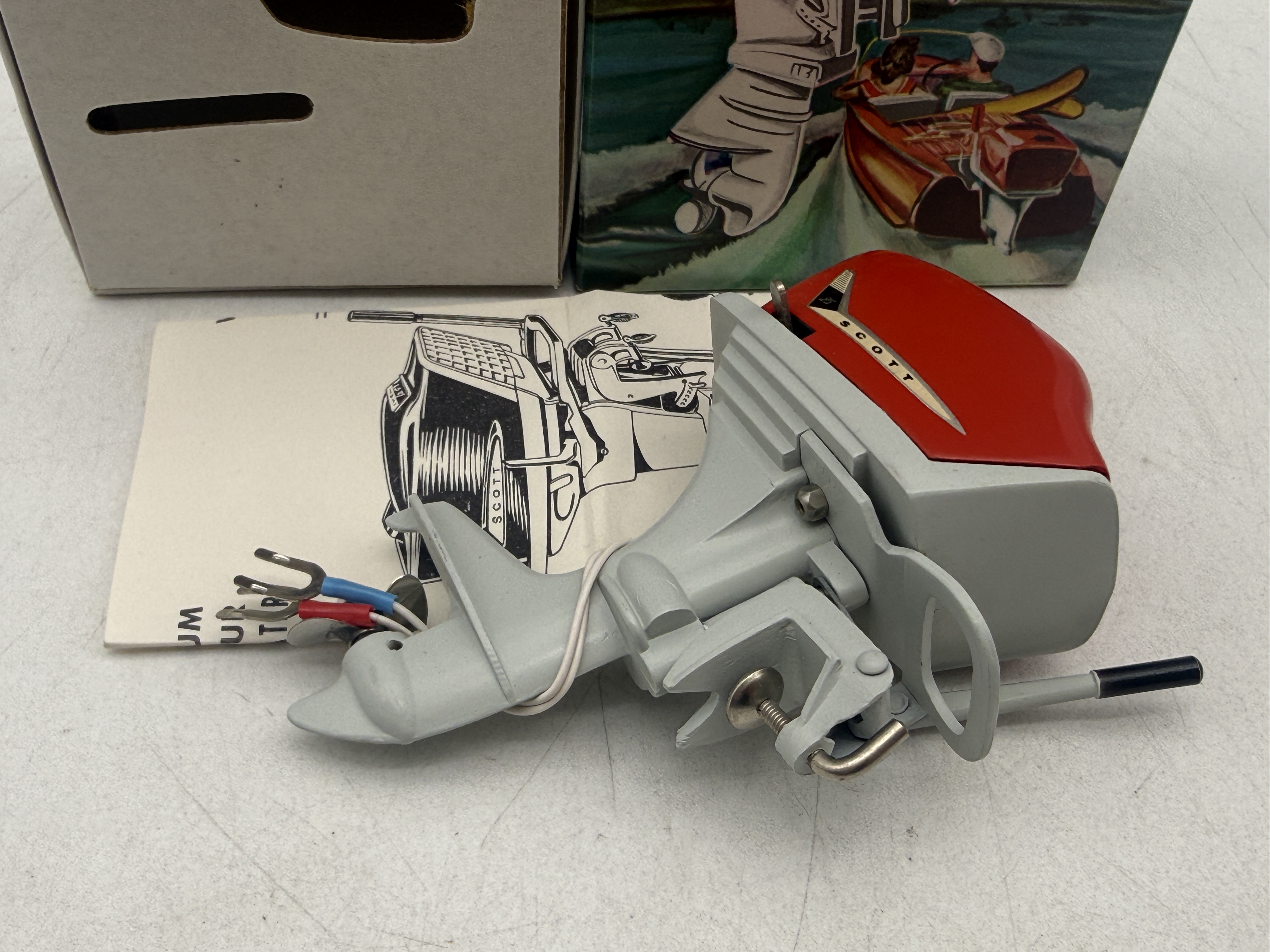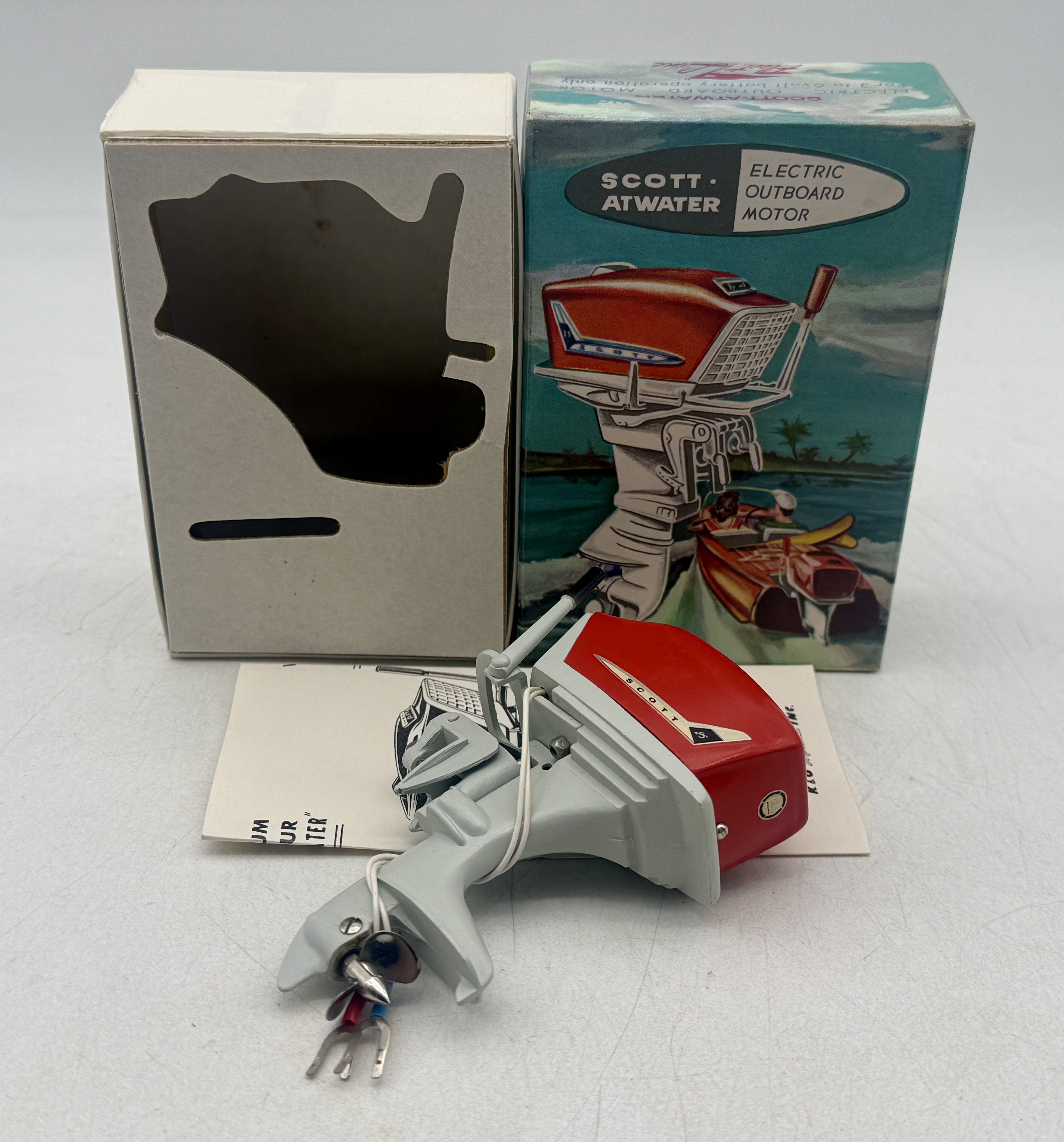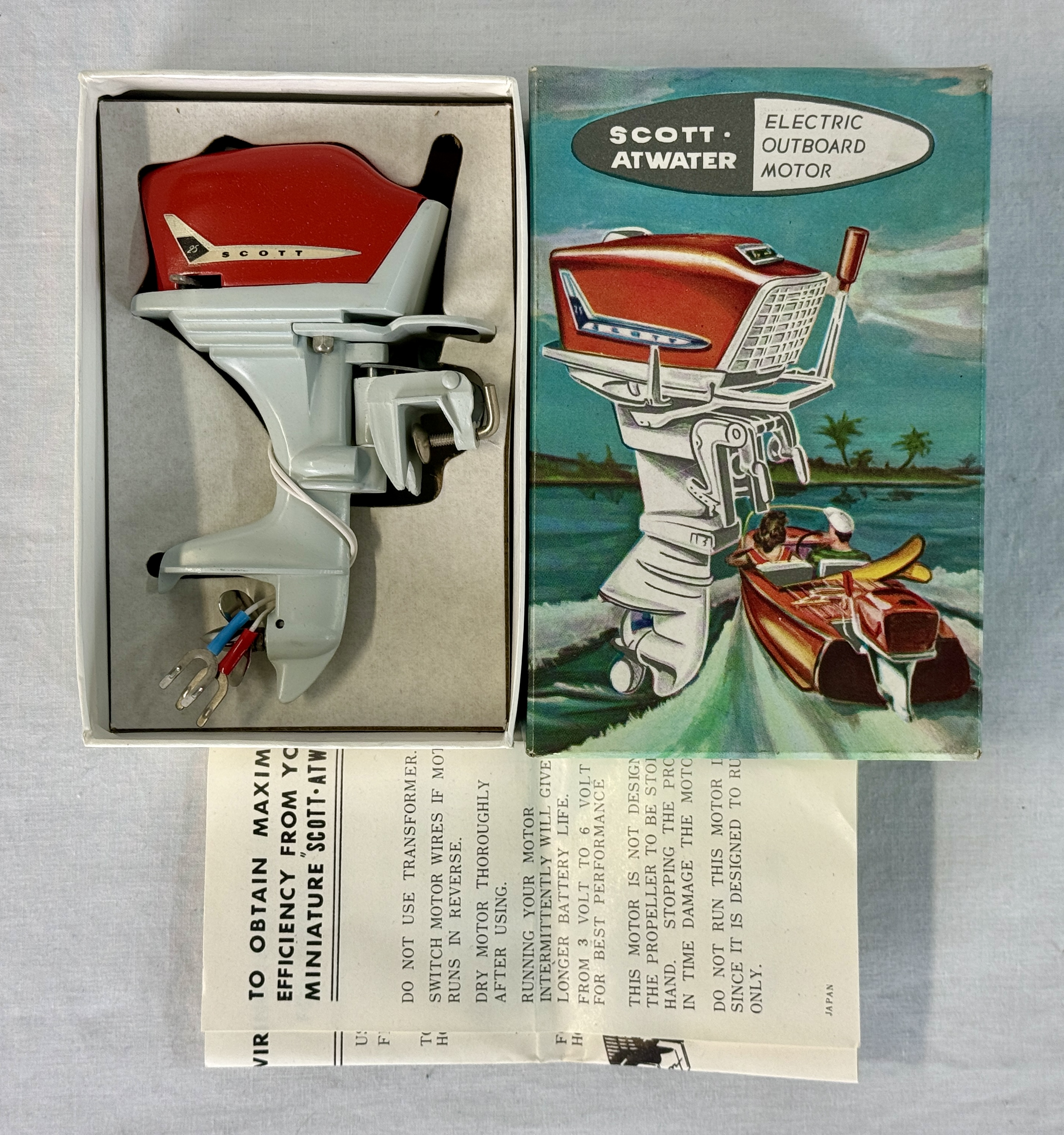 A vintage red and light gray #36 Scott-Atwater Fleet Line miniature electric outboard motor with its original decorative box and an instruction sheet marked Japan, C10.