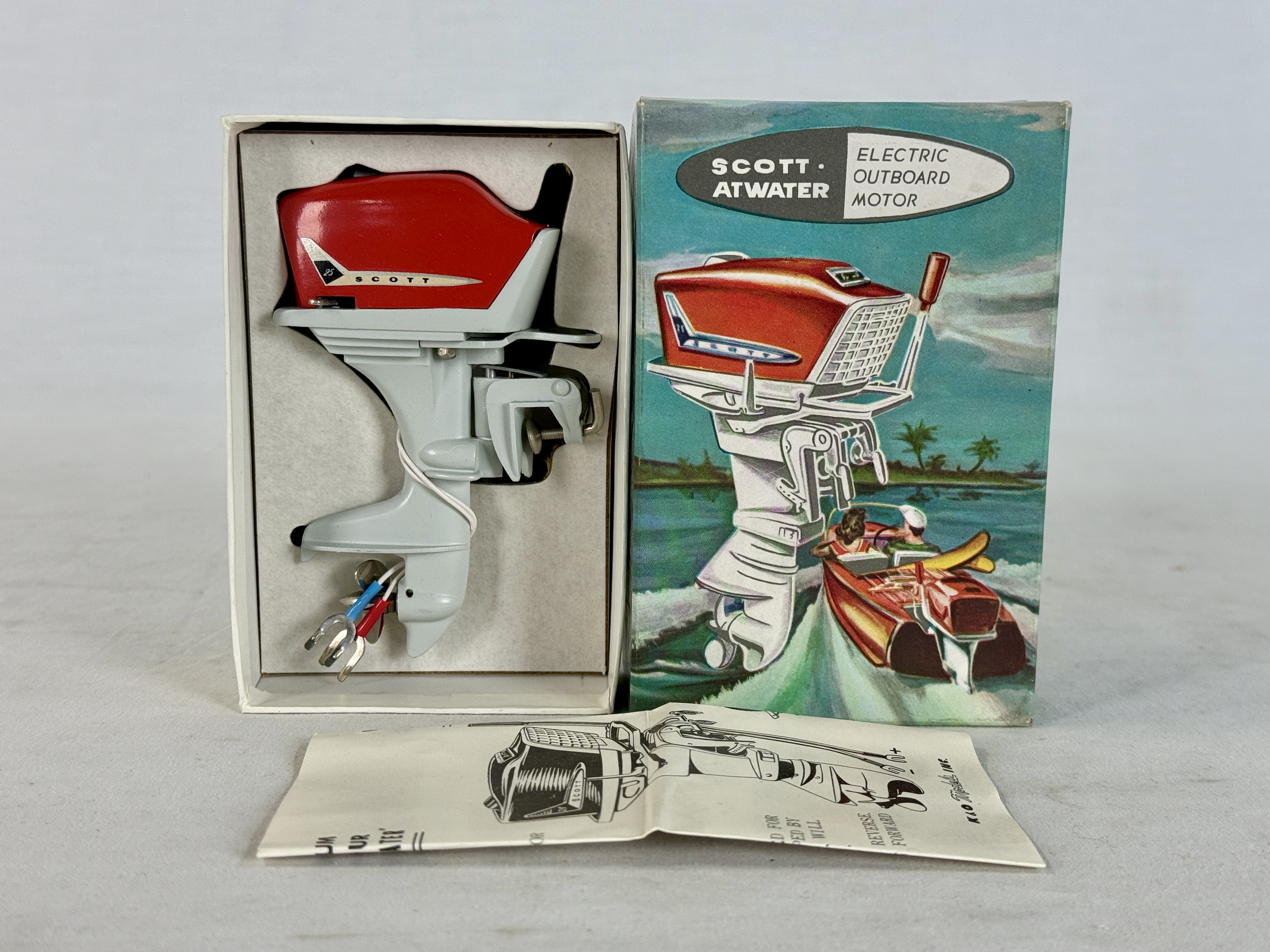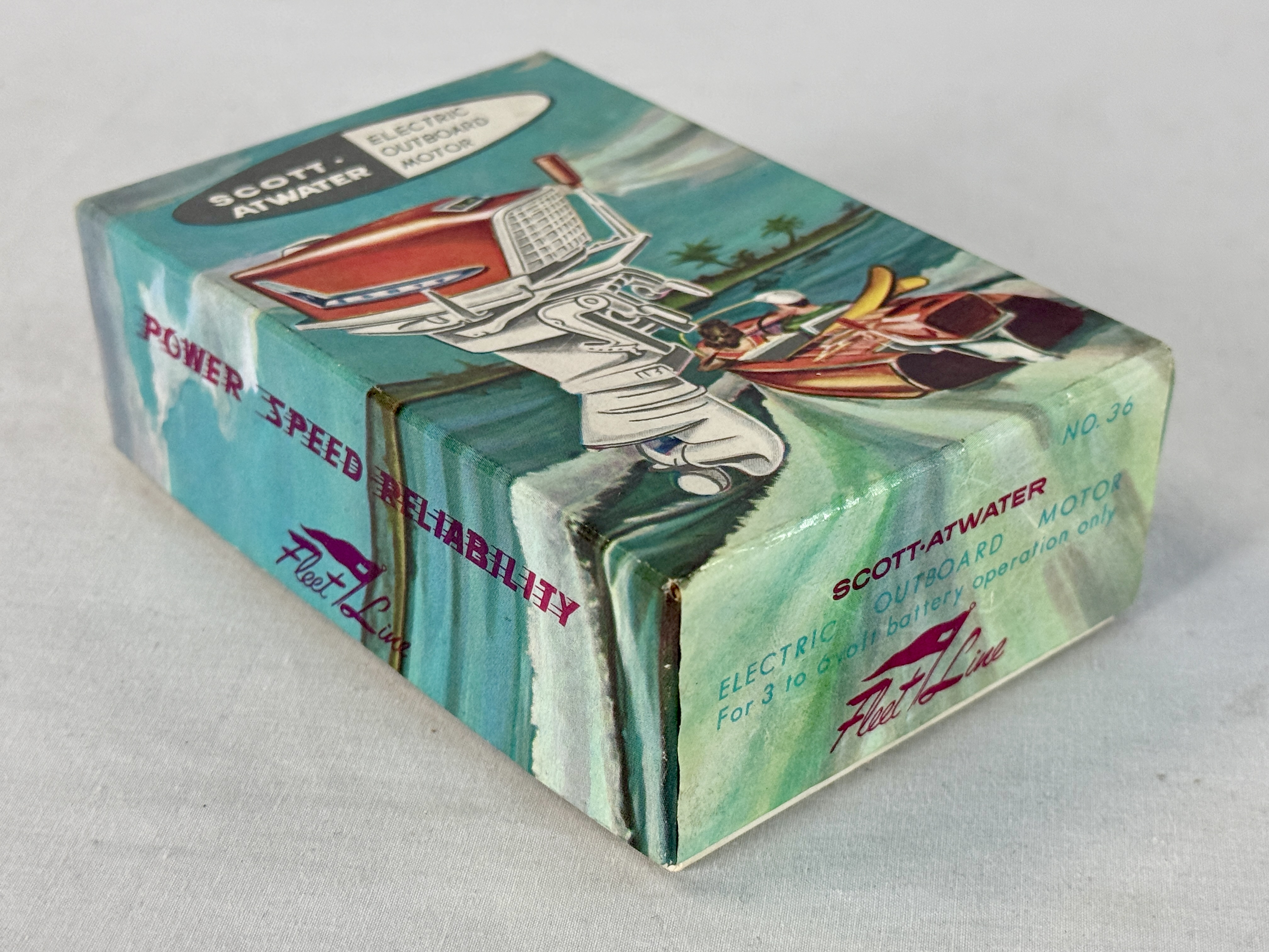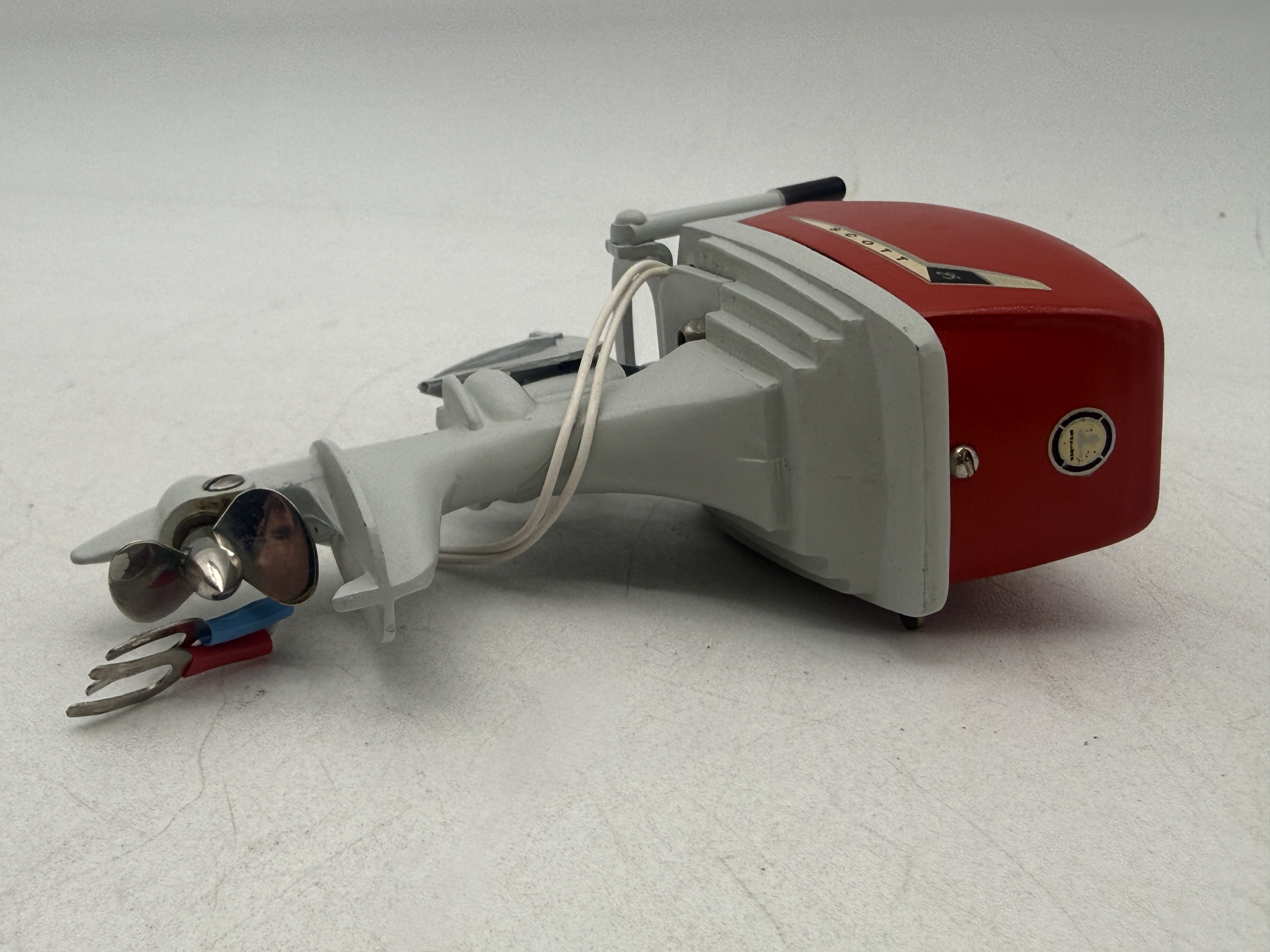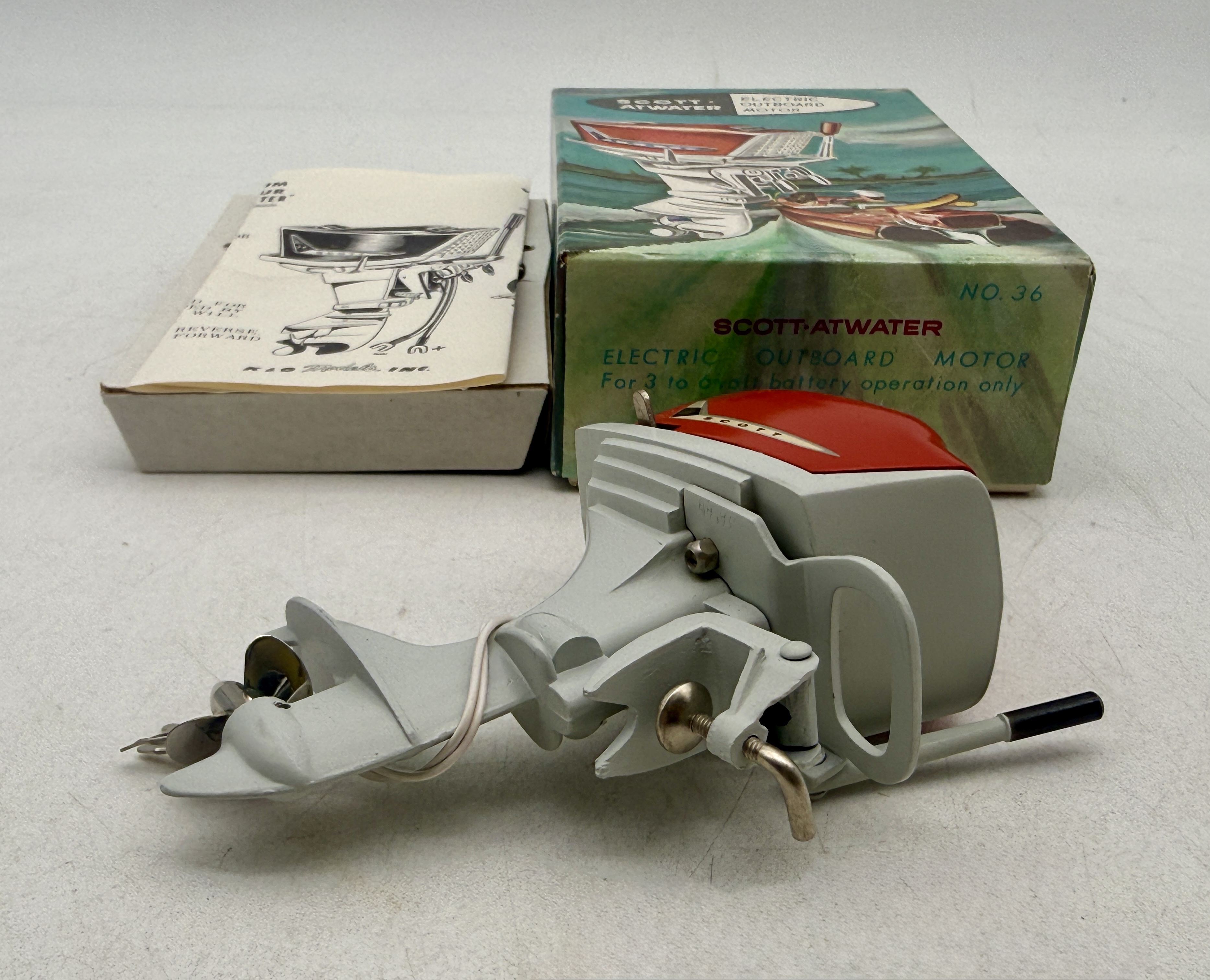 A vintage red and light gray #36 Scott-Atwater Fleet Line miniature electric outboard motor with its original decorative box and an instruction sheet marked Japan, C10.