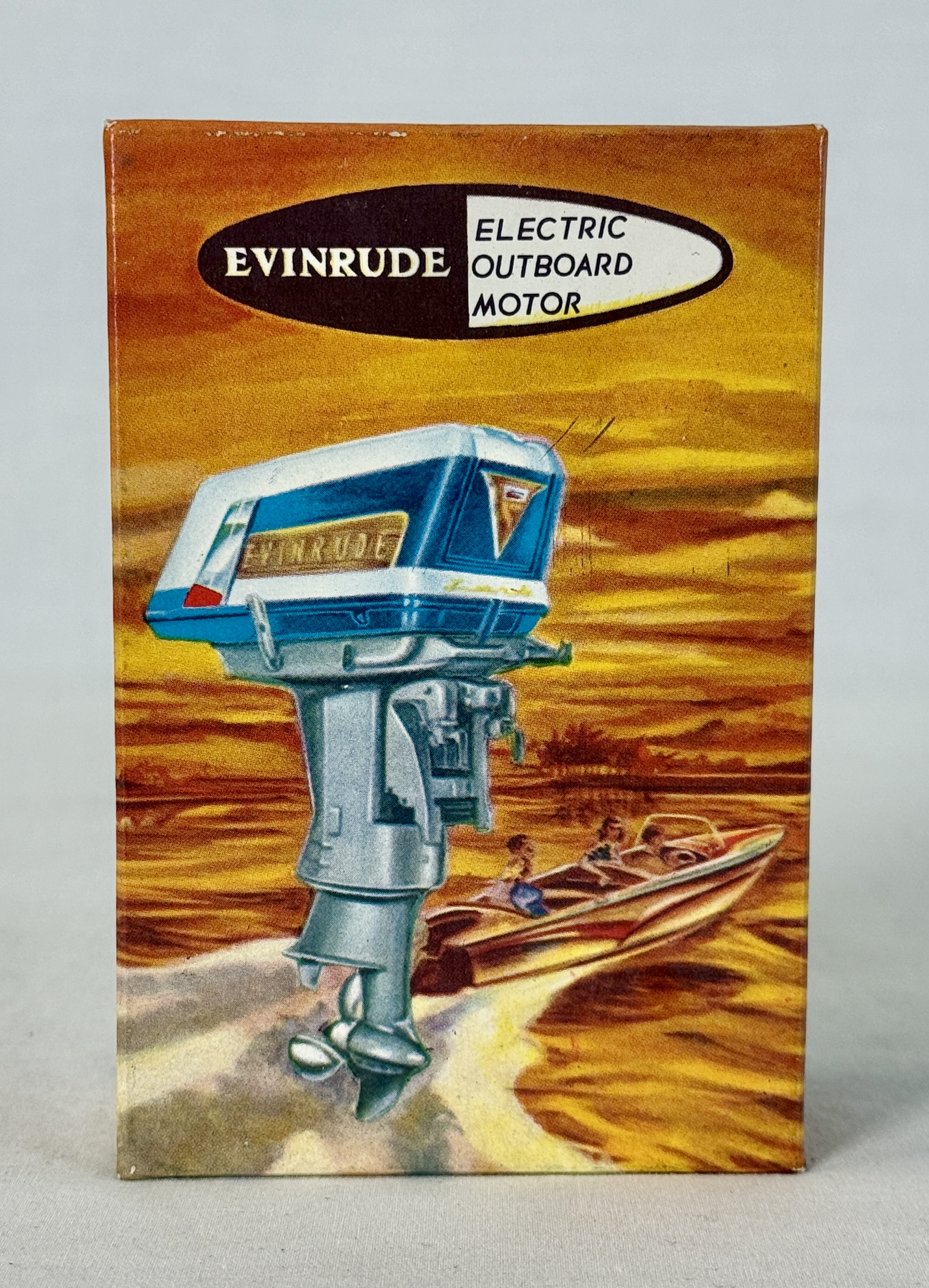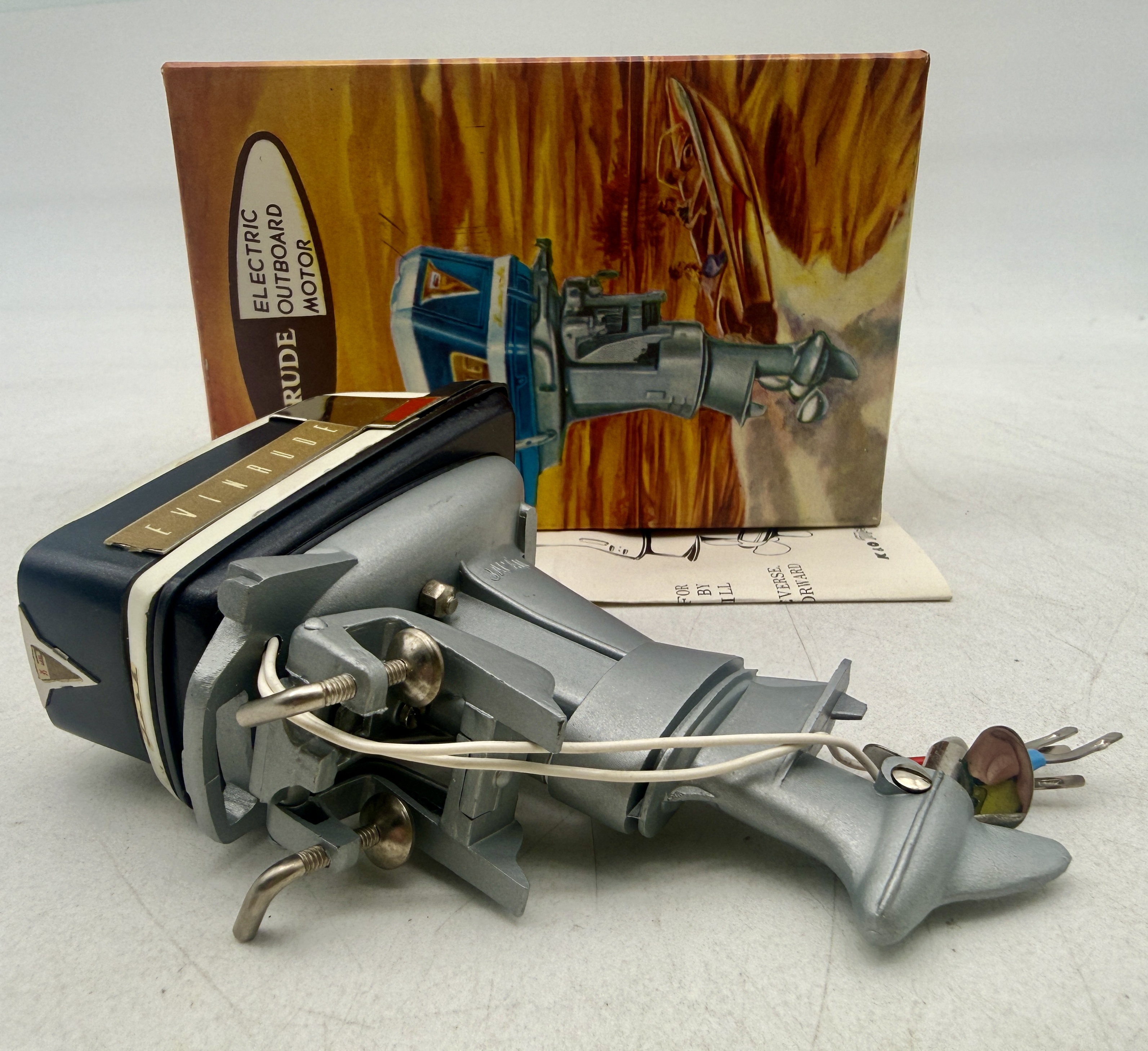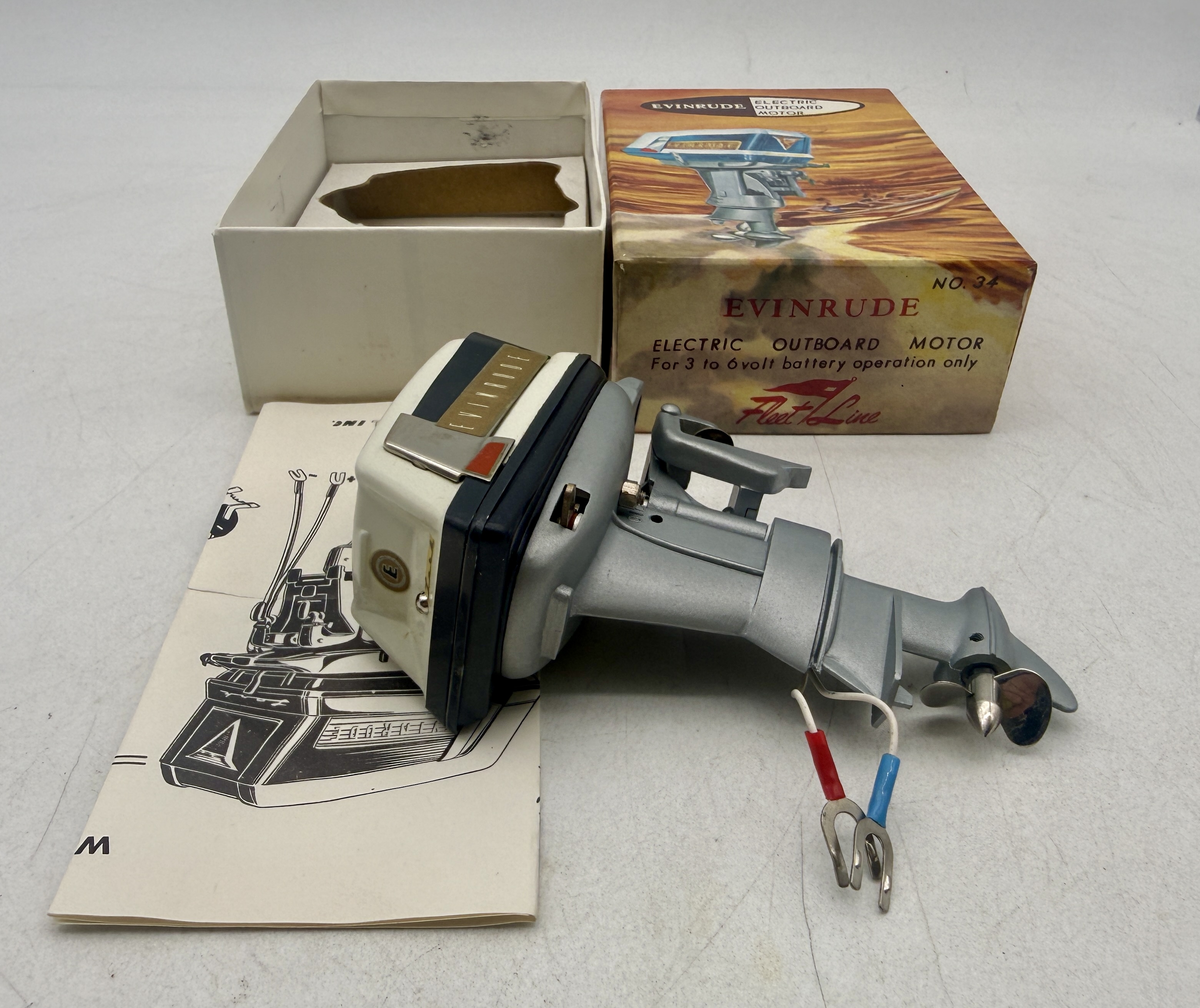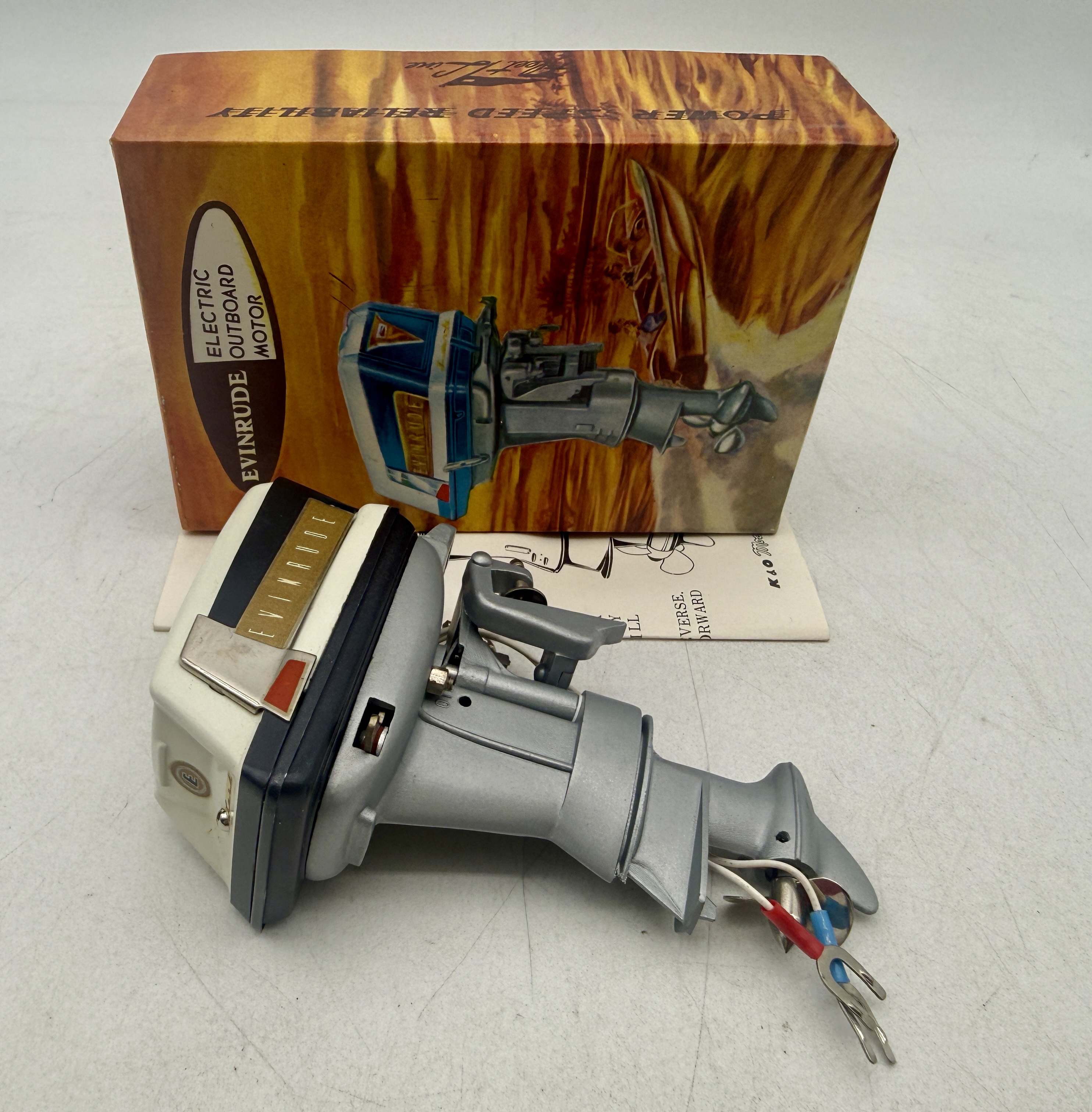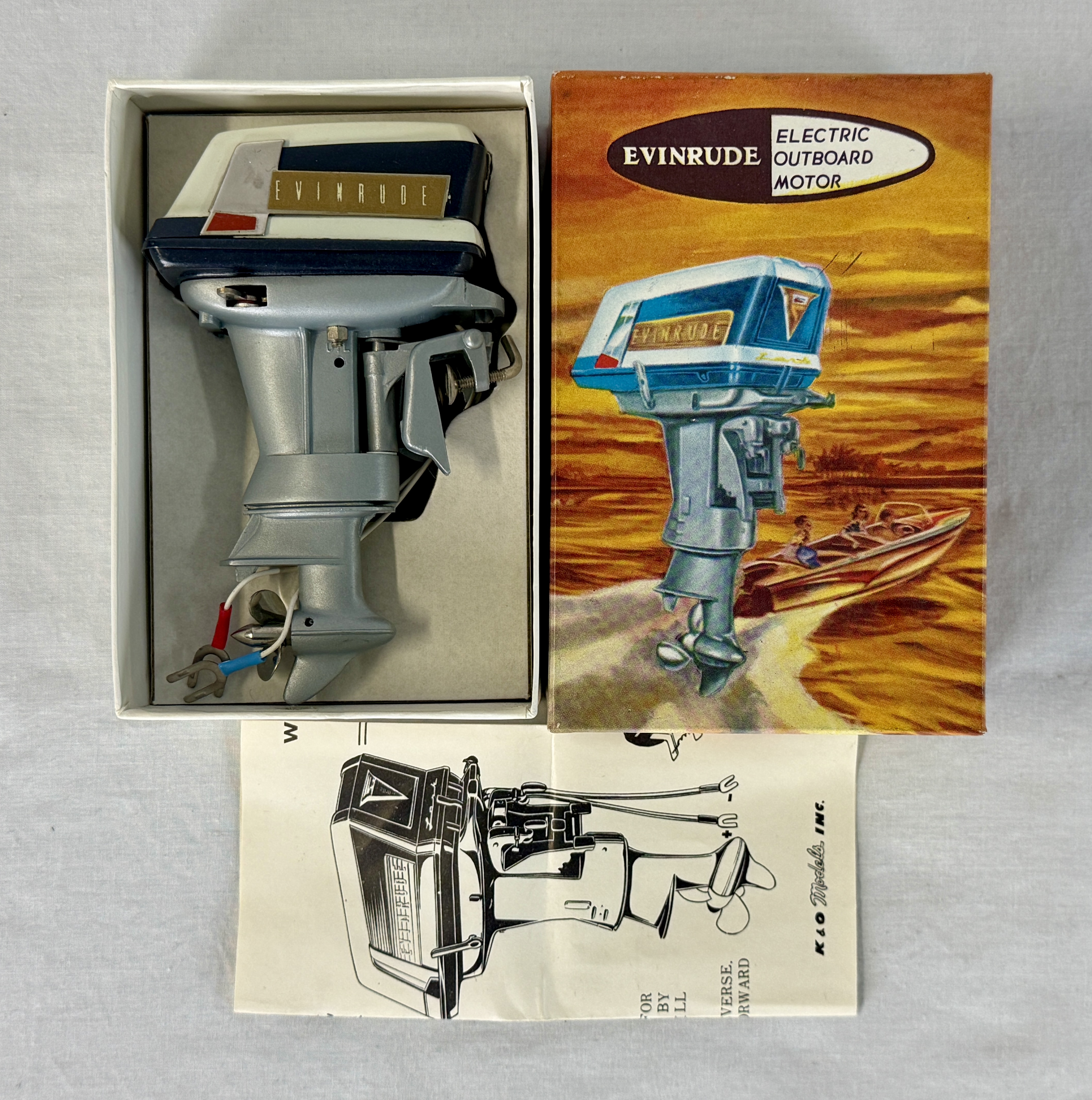 A blue, white, and silver #34 Evinrude Lark 35 HP electric outboard model motor accompanied by its original Fleet Line illustrated box and a K & O Models, Inc. instruction manual, C10.