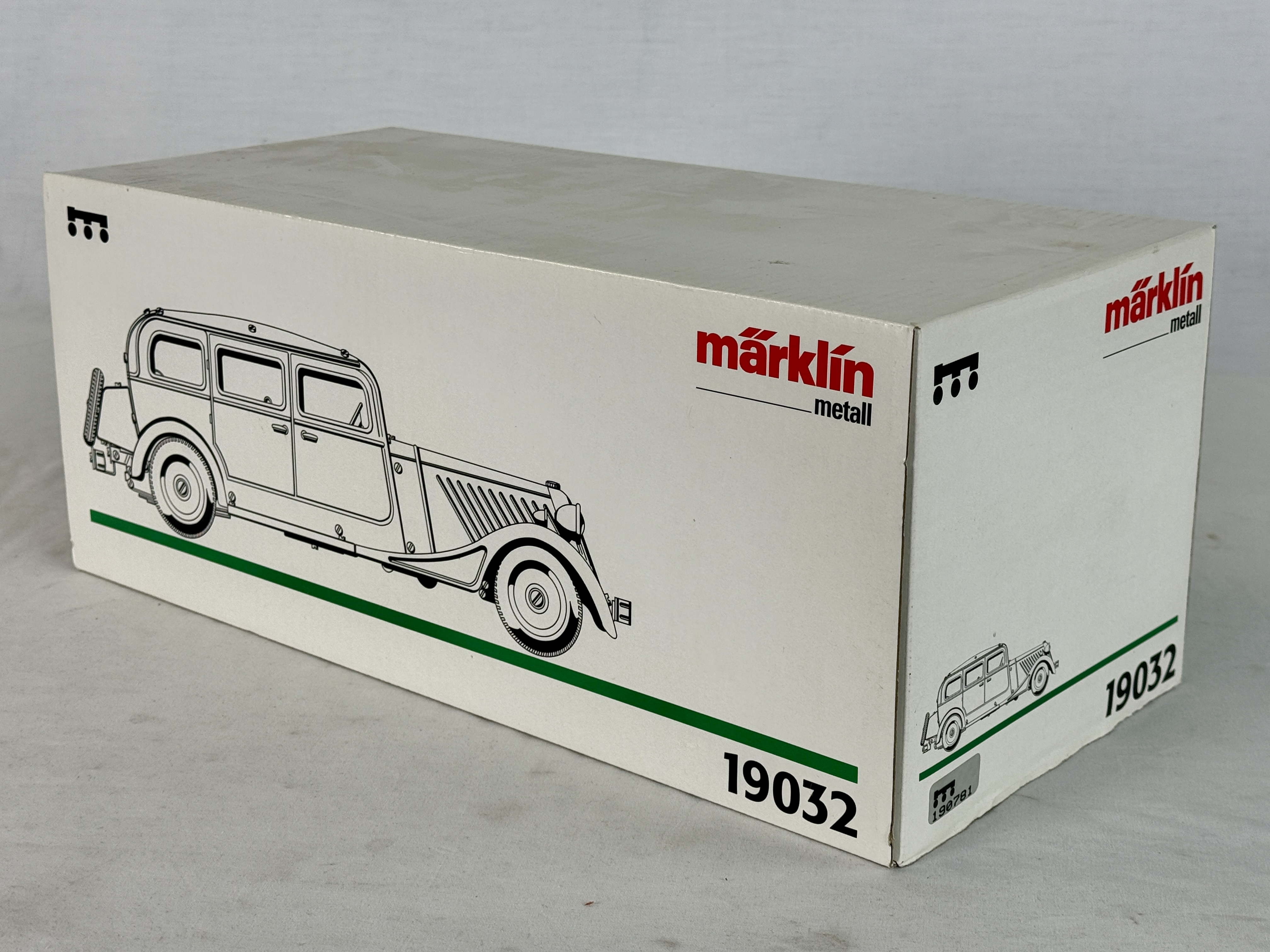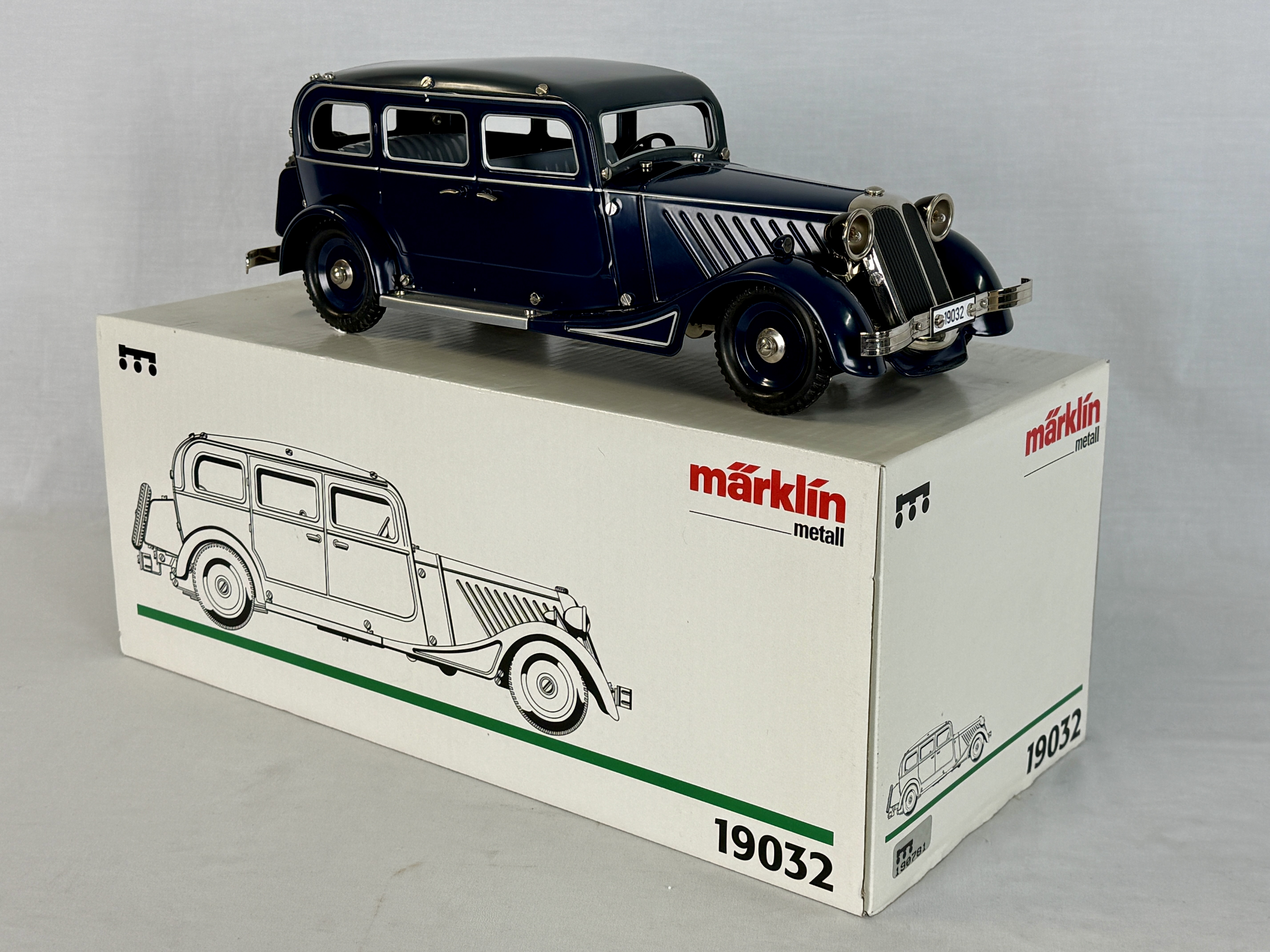 A dark blue Märklin Metall model 19032 Pullman Limousine with a clockwork mechanism, original white box, and metal winding key, working with electric headlights, C9.