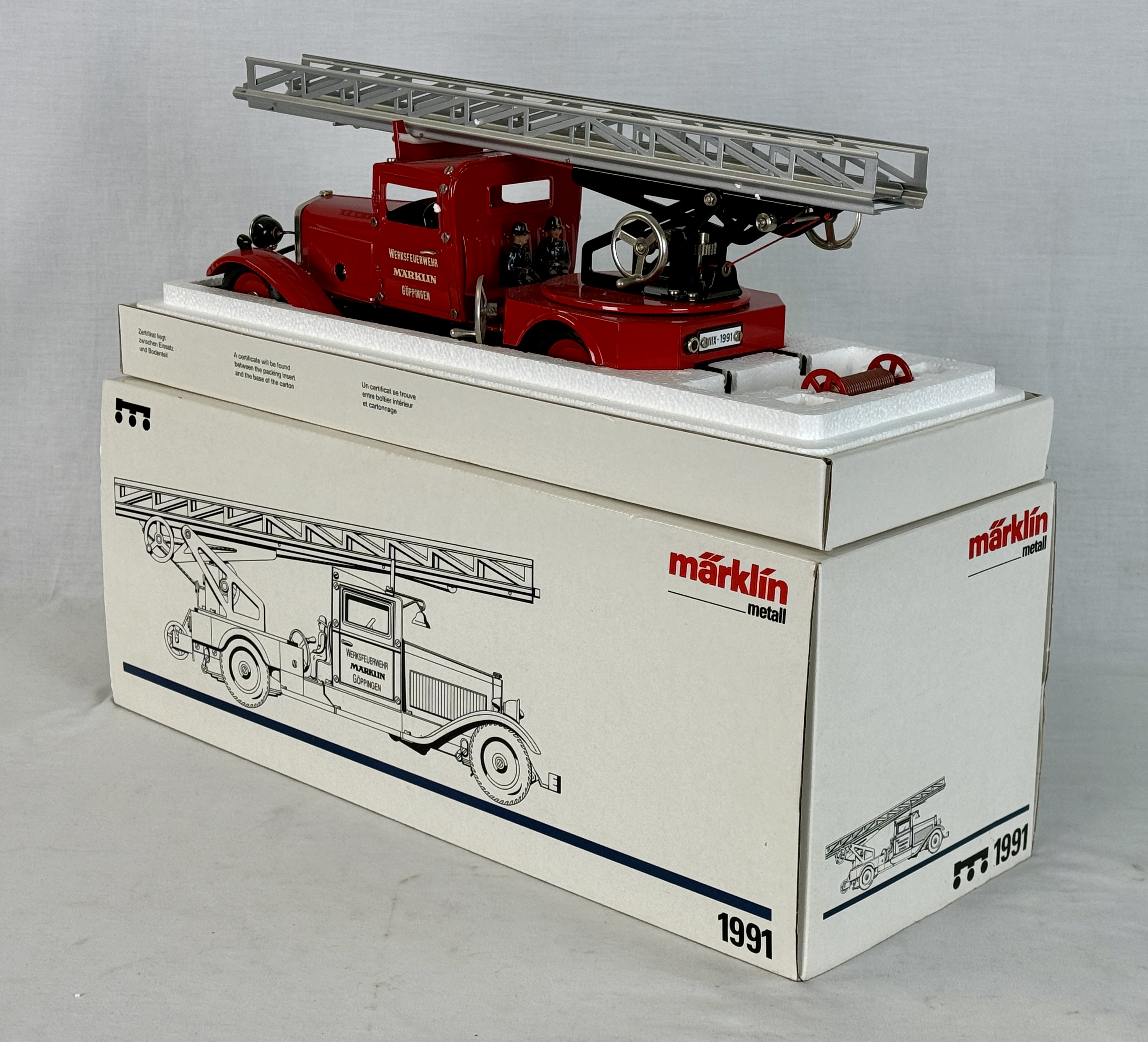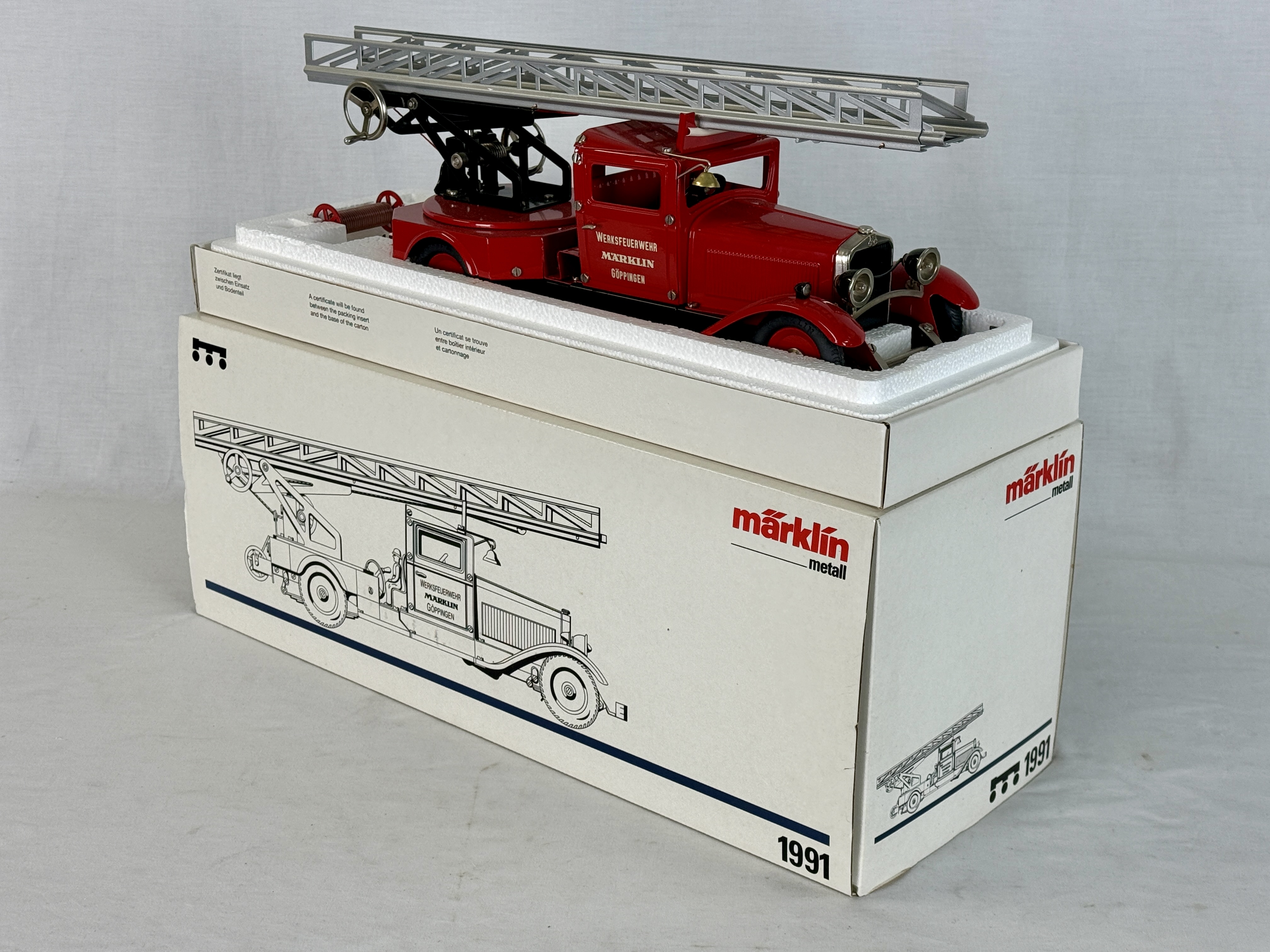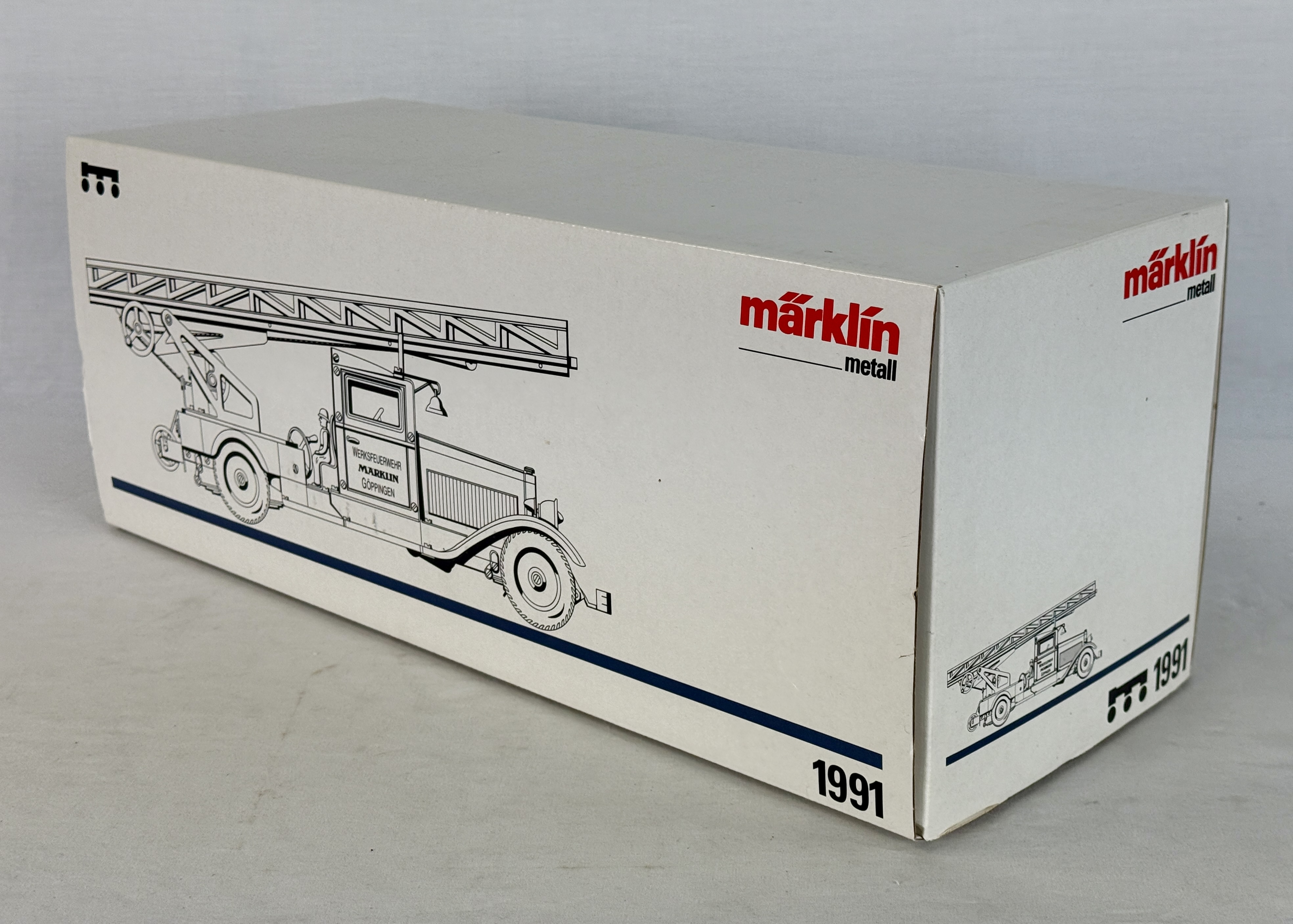 A red and silver Märklin metal fire truck model 18 inches long featuring an extendable ladder and Werksfeuerwehr Märklin Göppingen door markings, presented in its original 1991 packaging, working with electric headlights, C9.