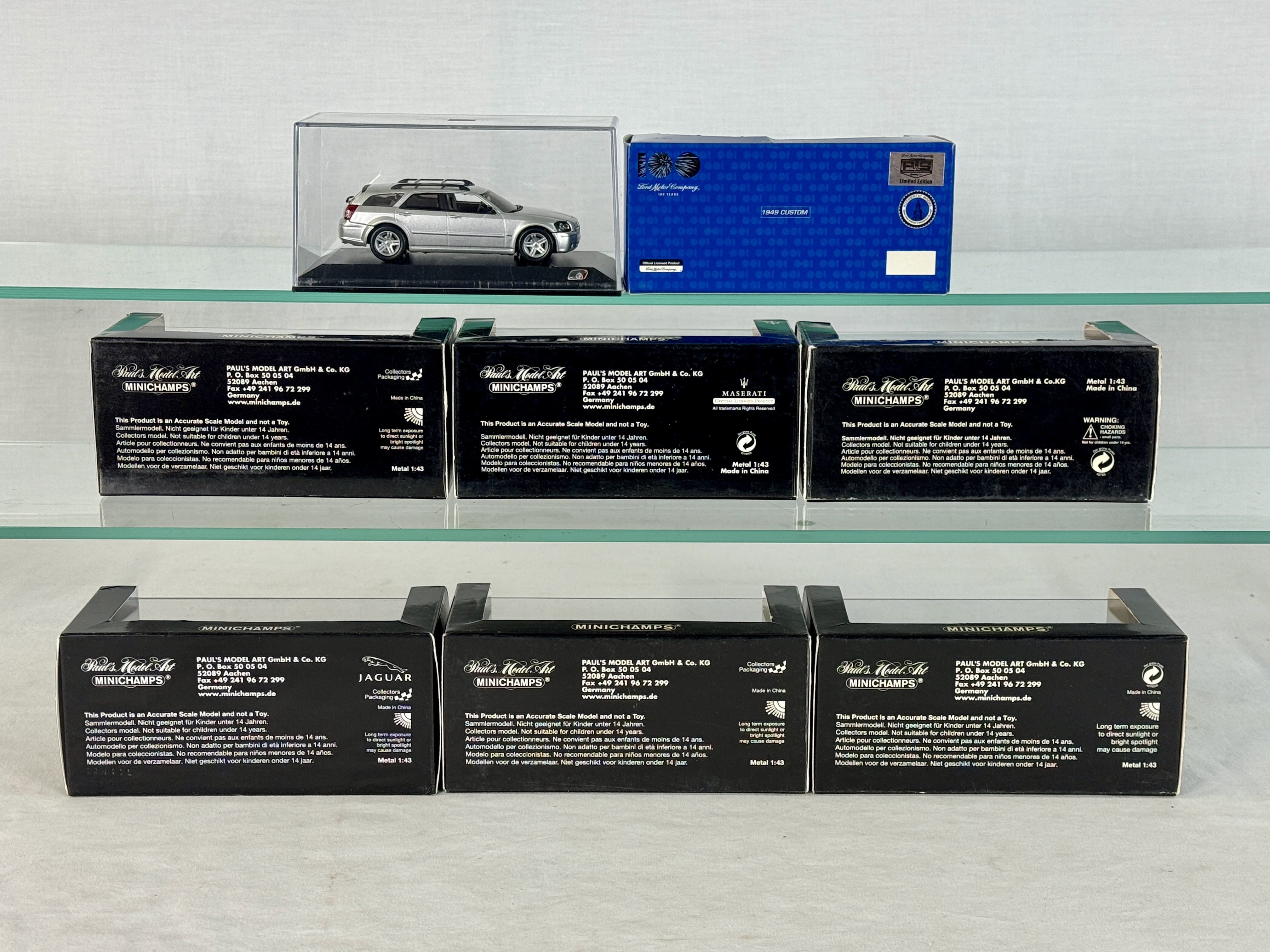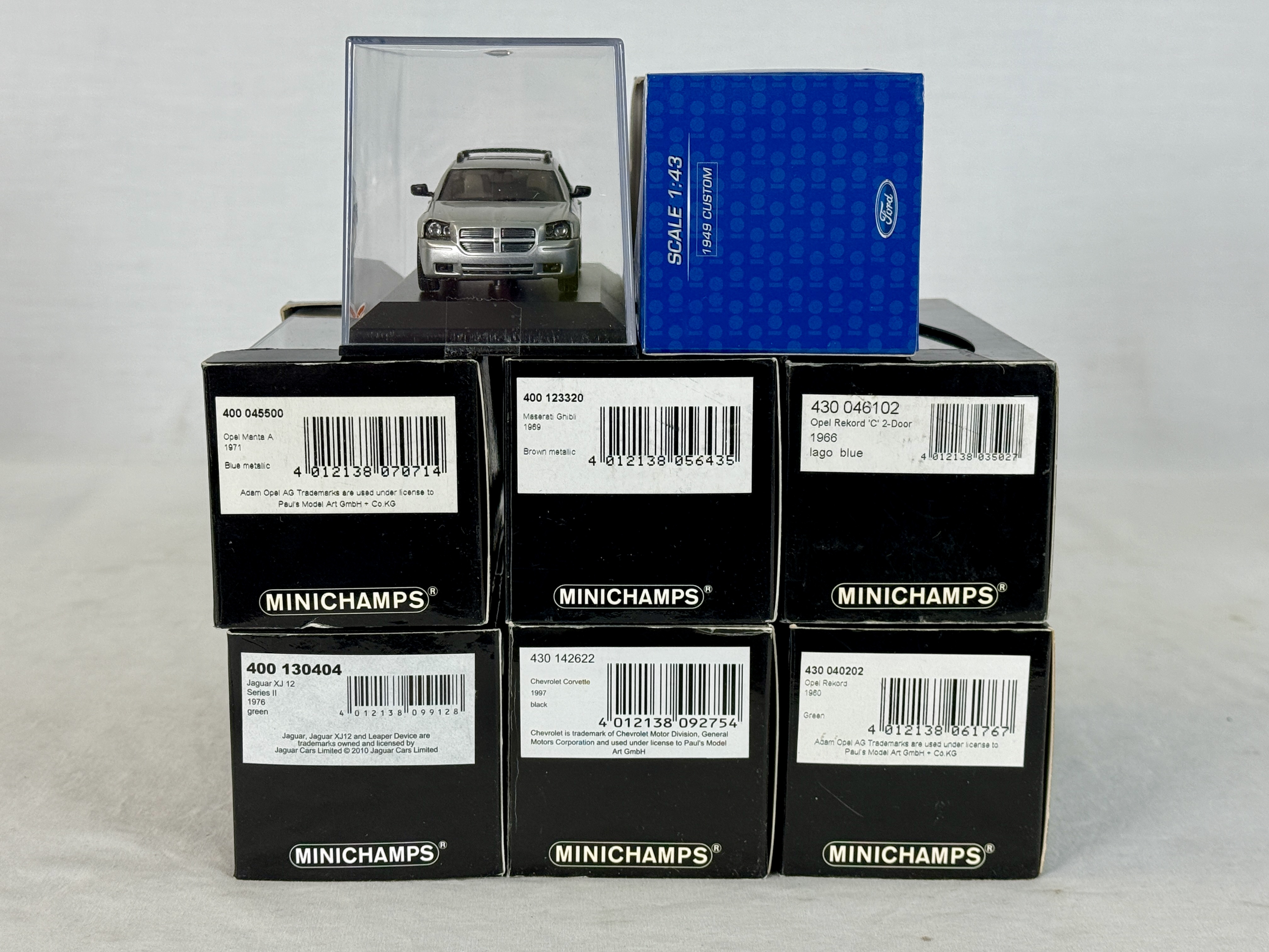 A collection of boxed 1:43 scale die-cast model cars by Paul’s Model Art including a 2006 Dodge Magnum R/T, 1949 Custom, 1971 Opel Manta A, 1969 Maserati Ghibli, 1966 Opel Rekord ‘C’, 1976 Jaguar XJ 12, 1997 Chevrolet Corvette, and 1960 Opel Rekord, C9.