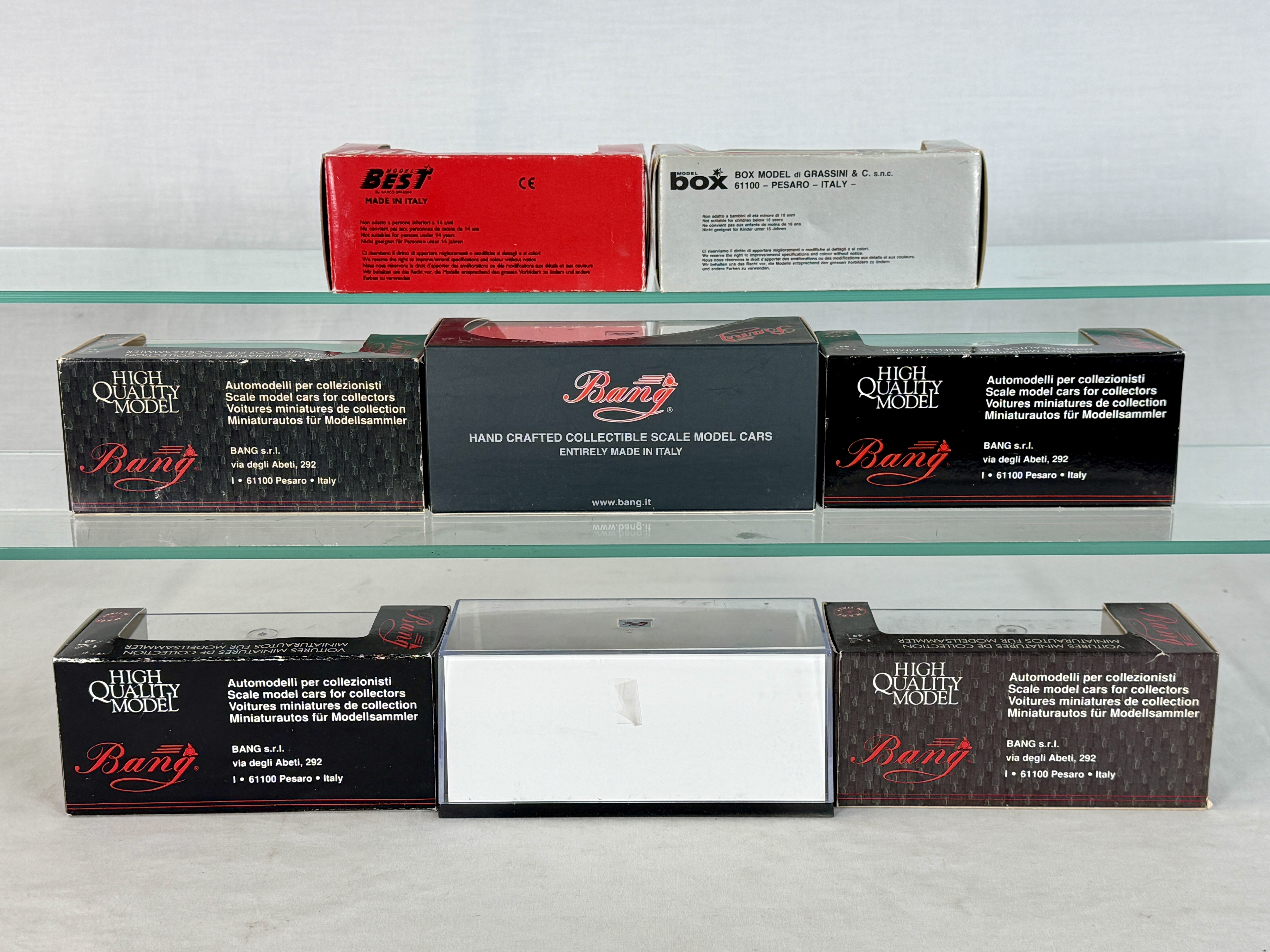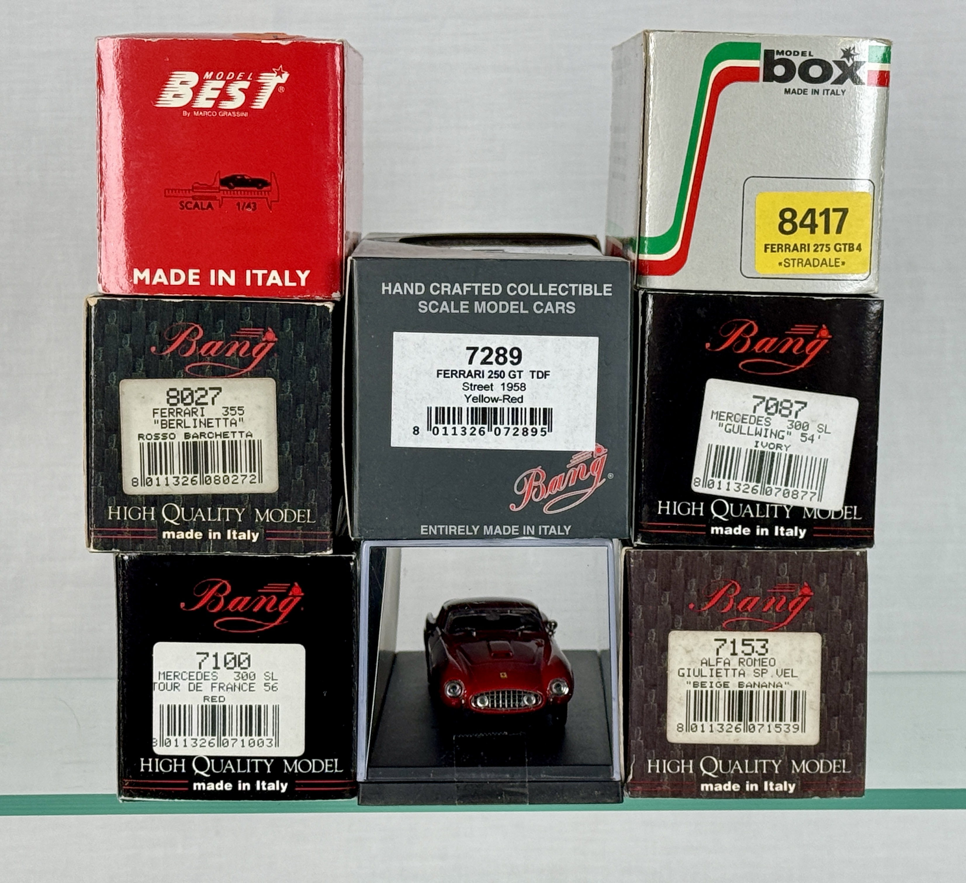 Bang 7087 Mercedes, 7153 Alfa Romeo, 7100 Mercedes, 8027 Ferrari, 7289 Ferrari, Box 8417 Ferrari, Best Ferrari, original boxes minor wear C 8–9.