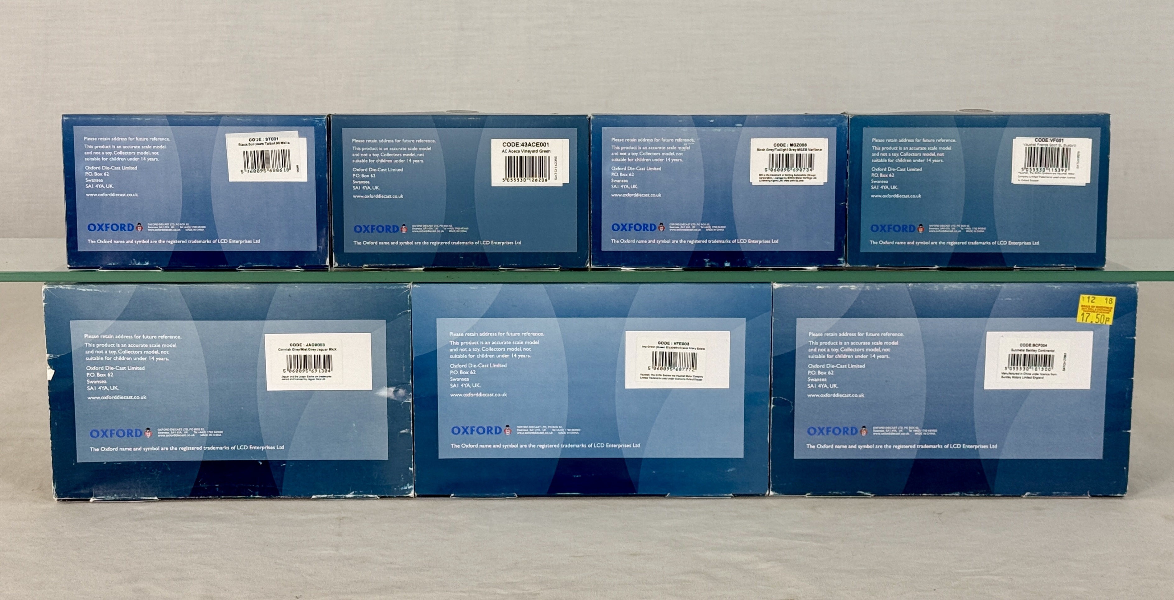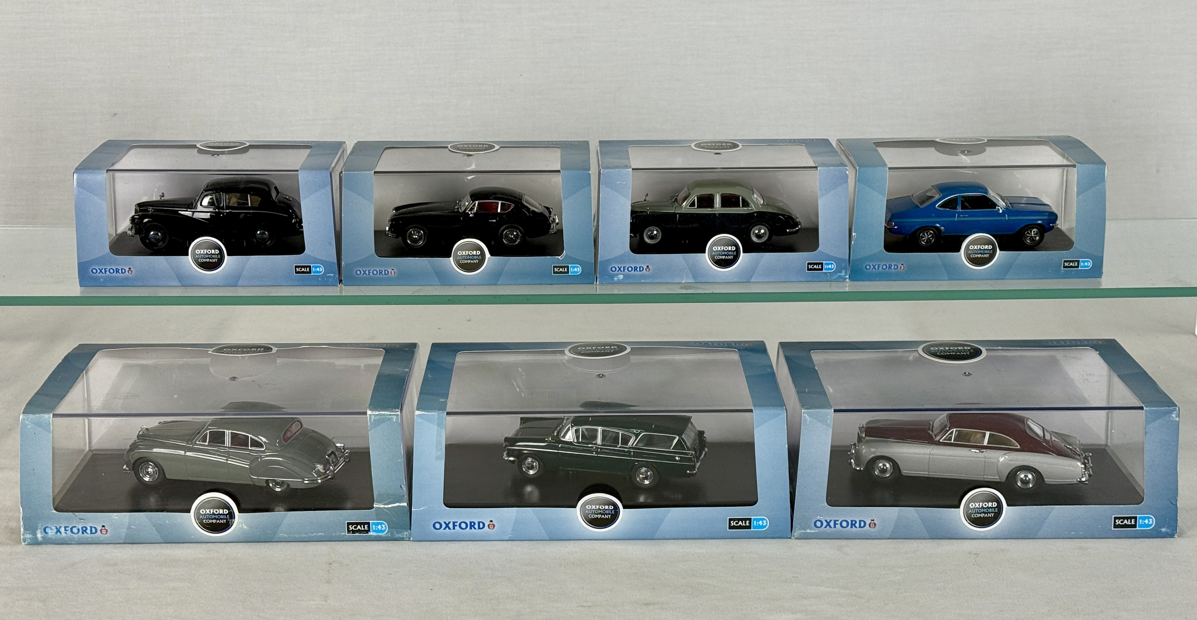 A collection of 1:43 scale die-cast model cars in various colors including Sunbeam Talbot, AC Aceca, MGZB Varitone, Vauxhall Firenza, Jaguar MkIX, and Bentley Continental in original window boxes, C9.