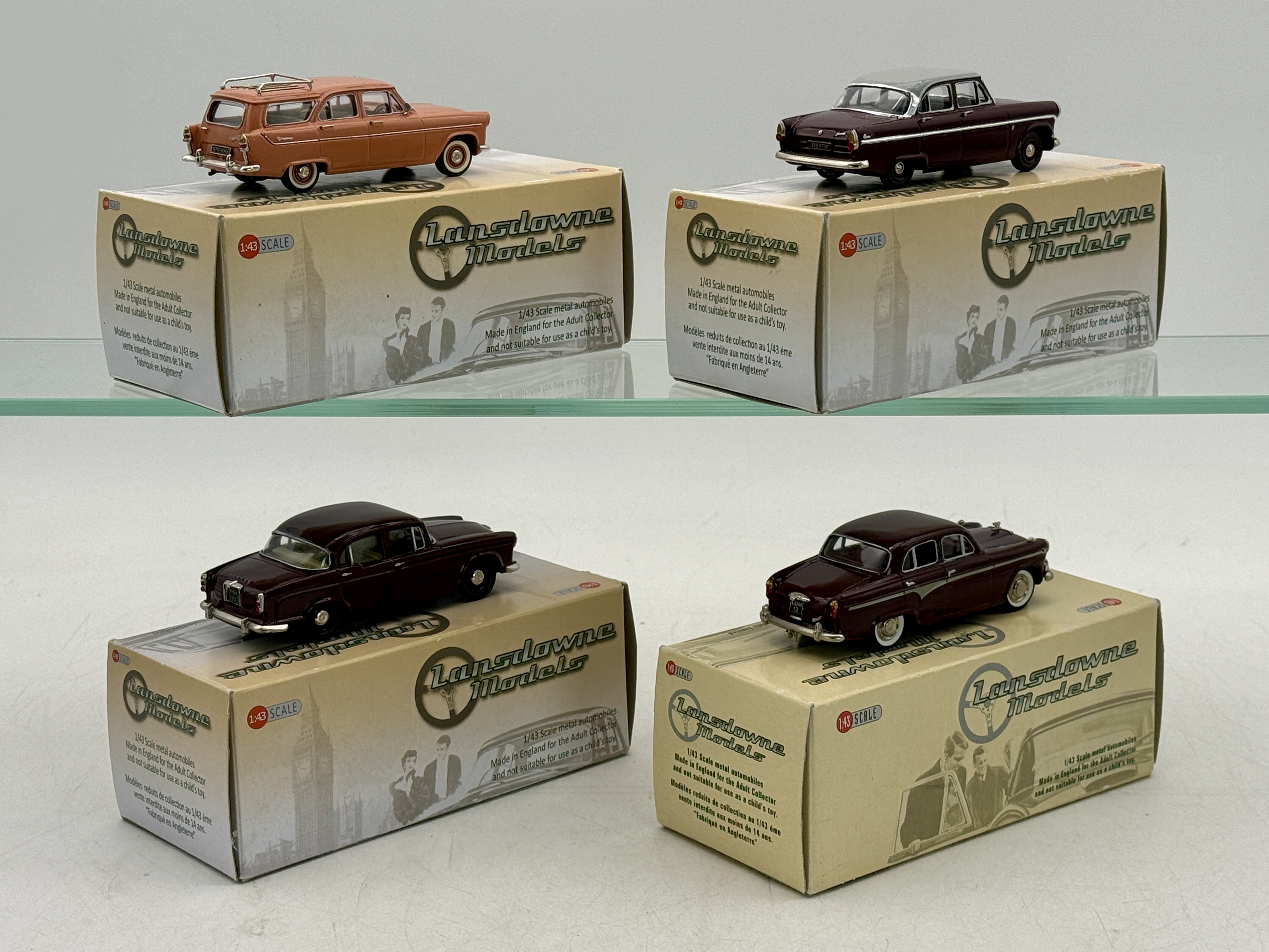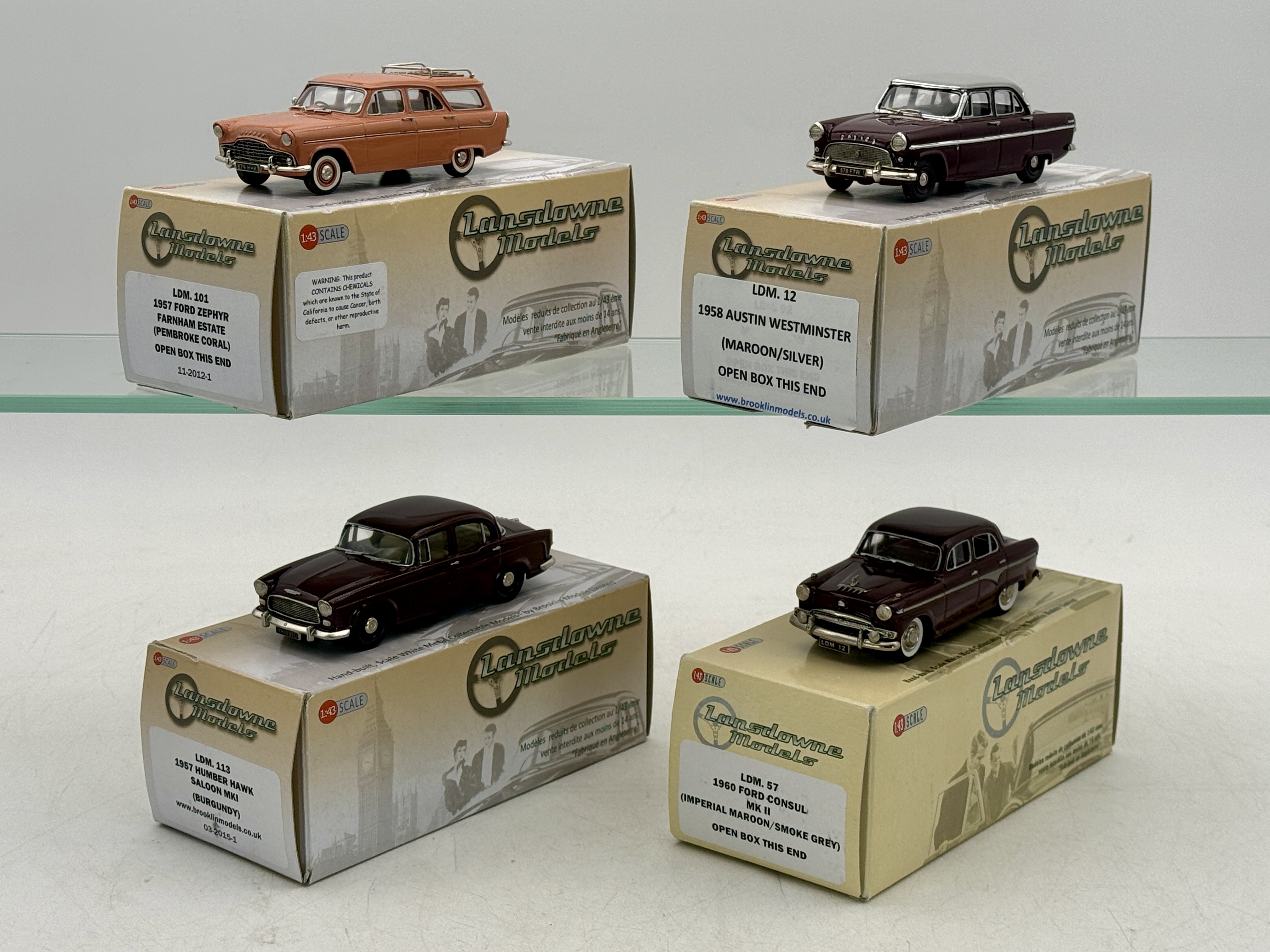 A collection of four Lansdowne Models 1:43 scale white metal vehicles including a 1957 Ford Zephyr Farnham Estate, 1958 Austin Westminster, 1957 Humber Hawk Saloon MKI, and 1960 Ford Consul MK II, housed in original labeled boxes, C9.