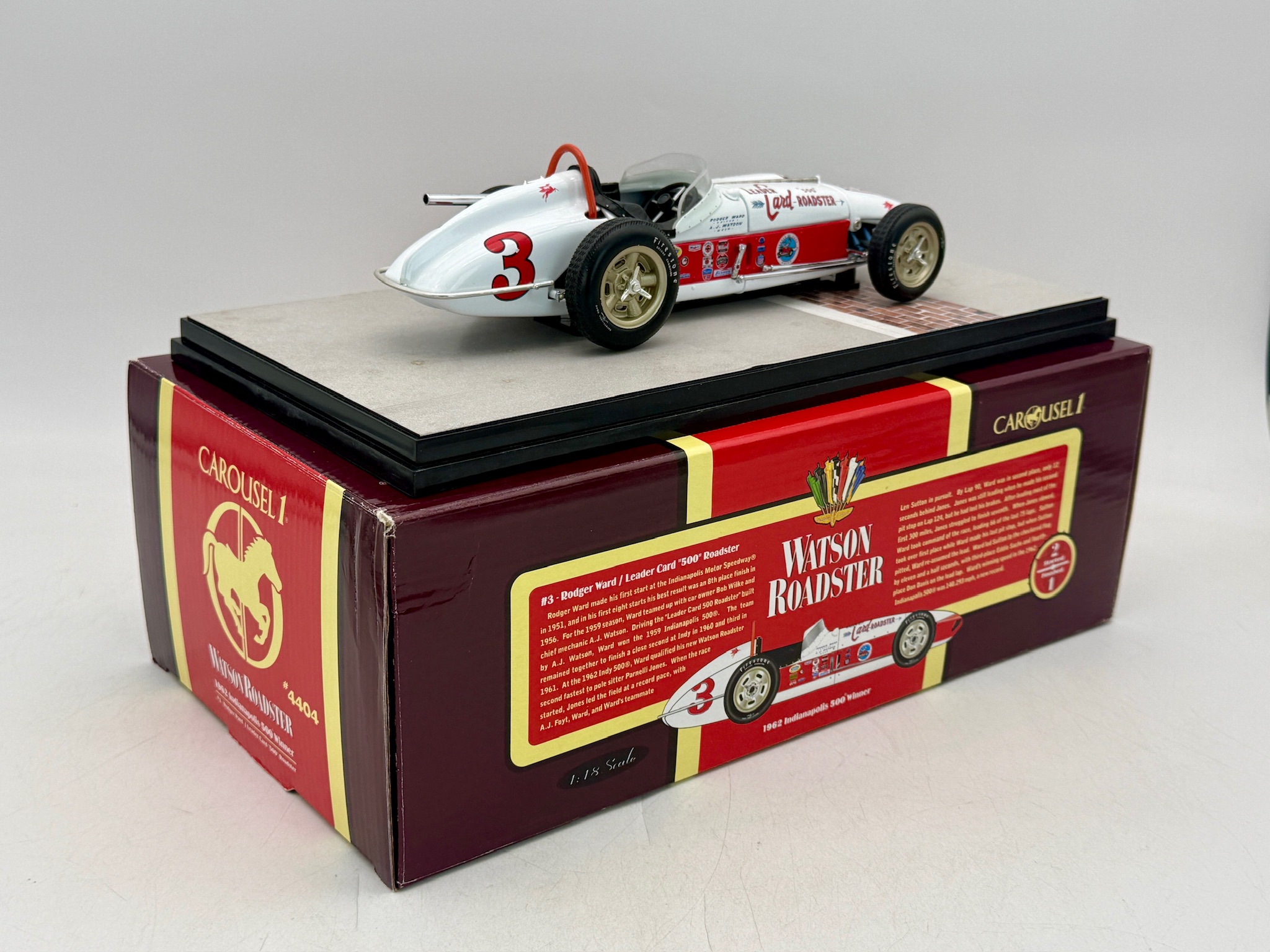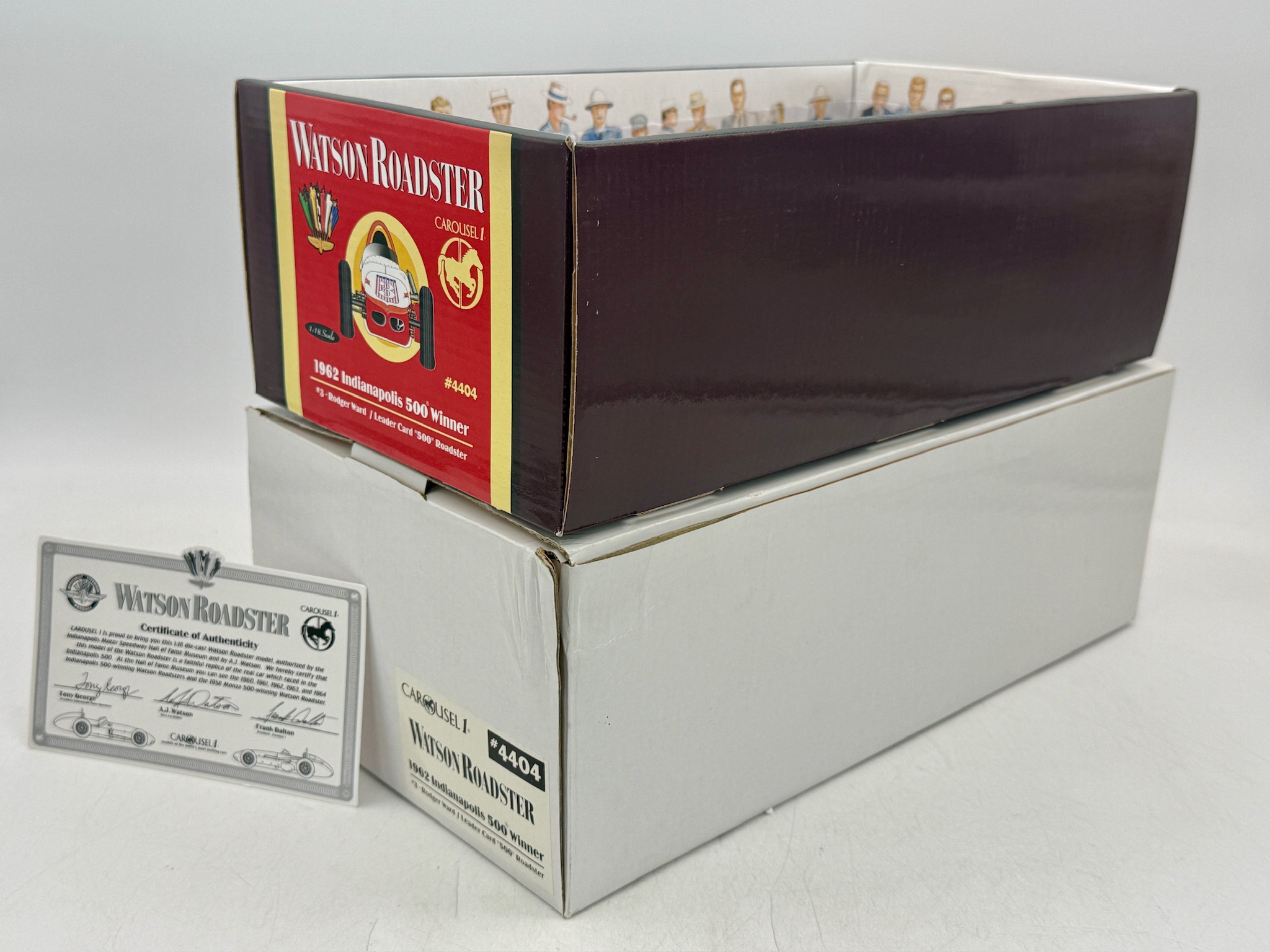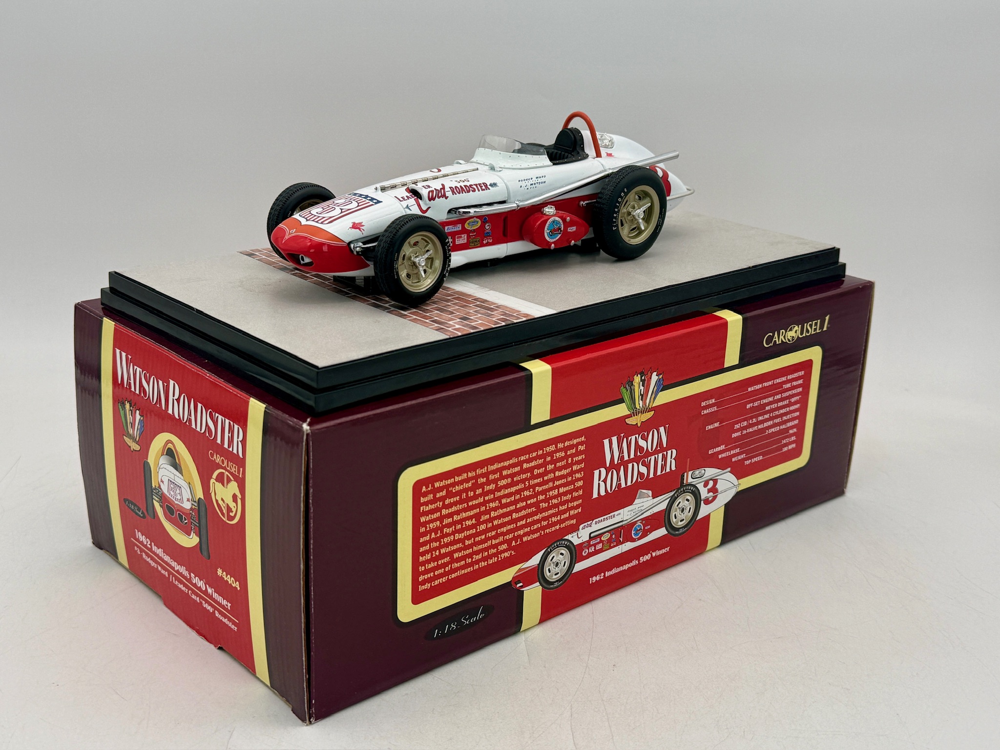 A 1:18 scale Carousel 1 #4404 die-cast Watson Roadster in white and red representing the 1962 Indianapolis 500 winner driven by Rodger Ward, including original packaging and a Certificate of Authenticity. 9 inches long, shipping box, OB, and inserts and certification C9