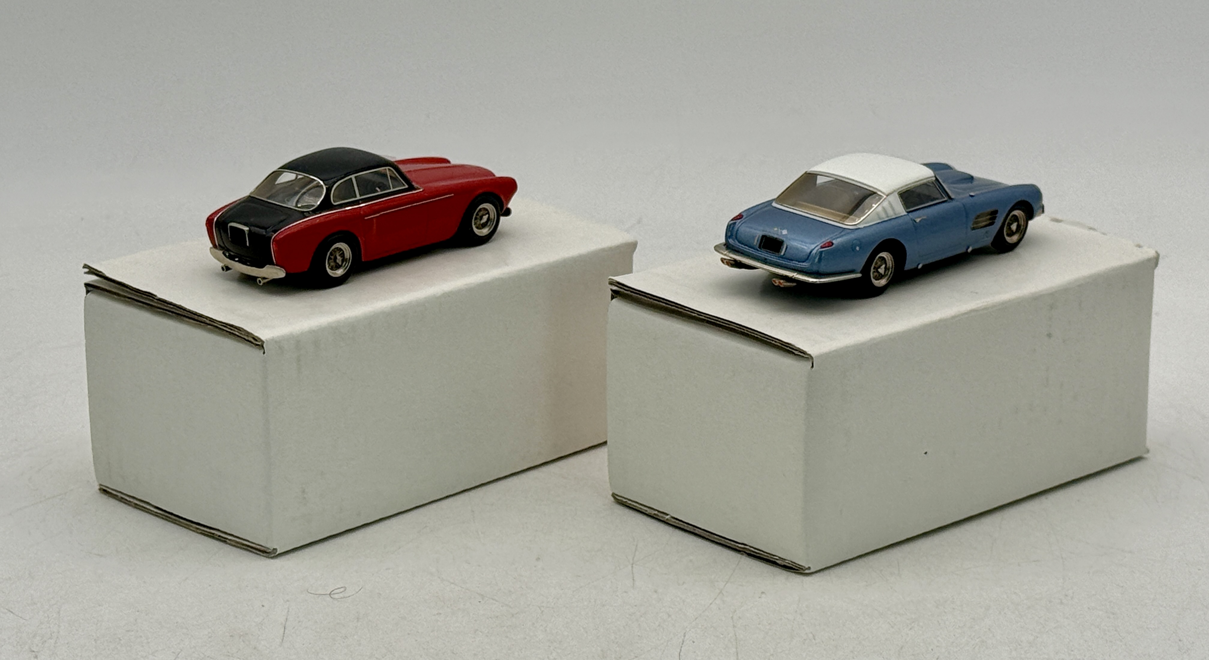 Two 1/43 scale model cars including a red and black Ferrari 212 Inter Vignale and a blue and white Ferrari Superfast 4.9 with original boxes, C9