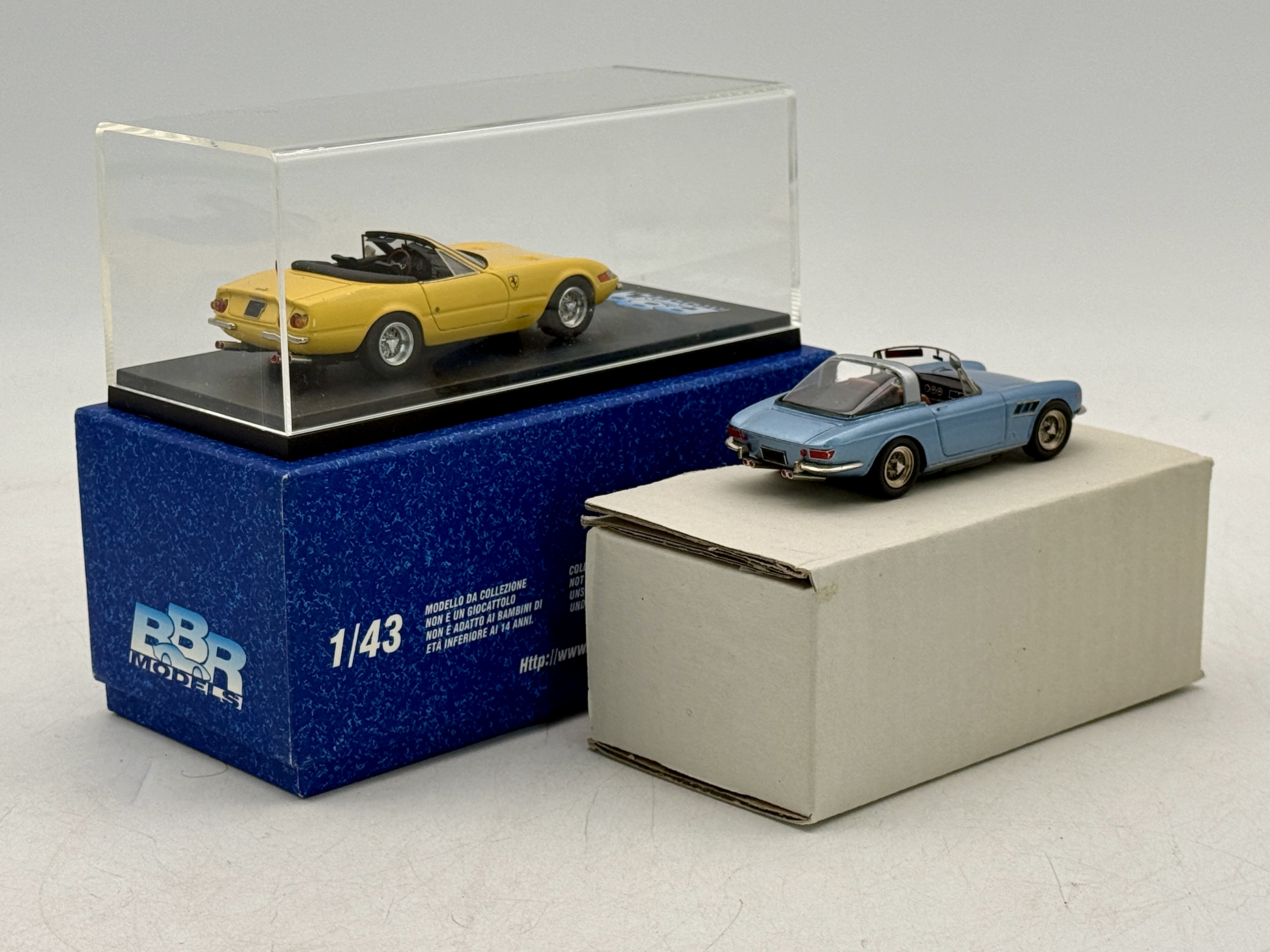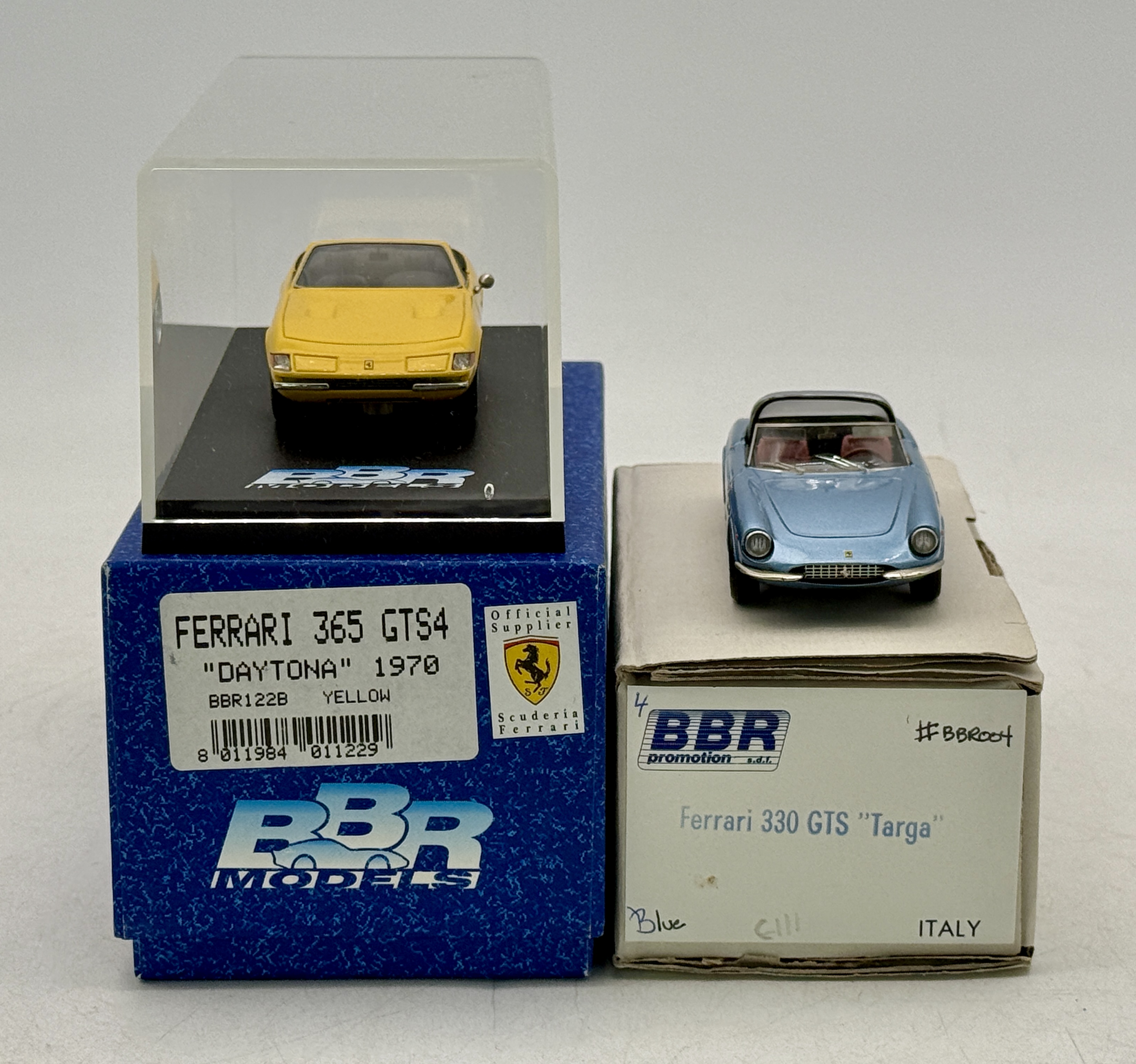 Two 1/43 scale BBR model cars including a yellow 1970 Ferrari 365 GTS/4 Daytona and a blue Ferrari 330 GTS Targa with original boxes, C9.