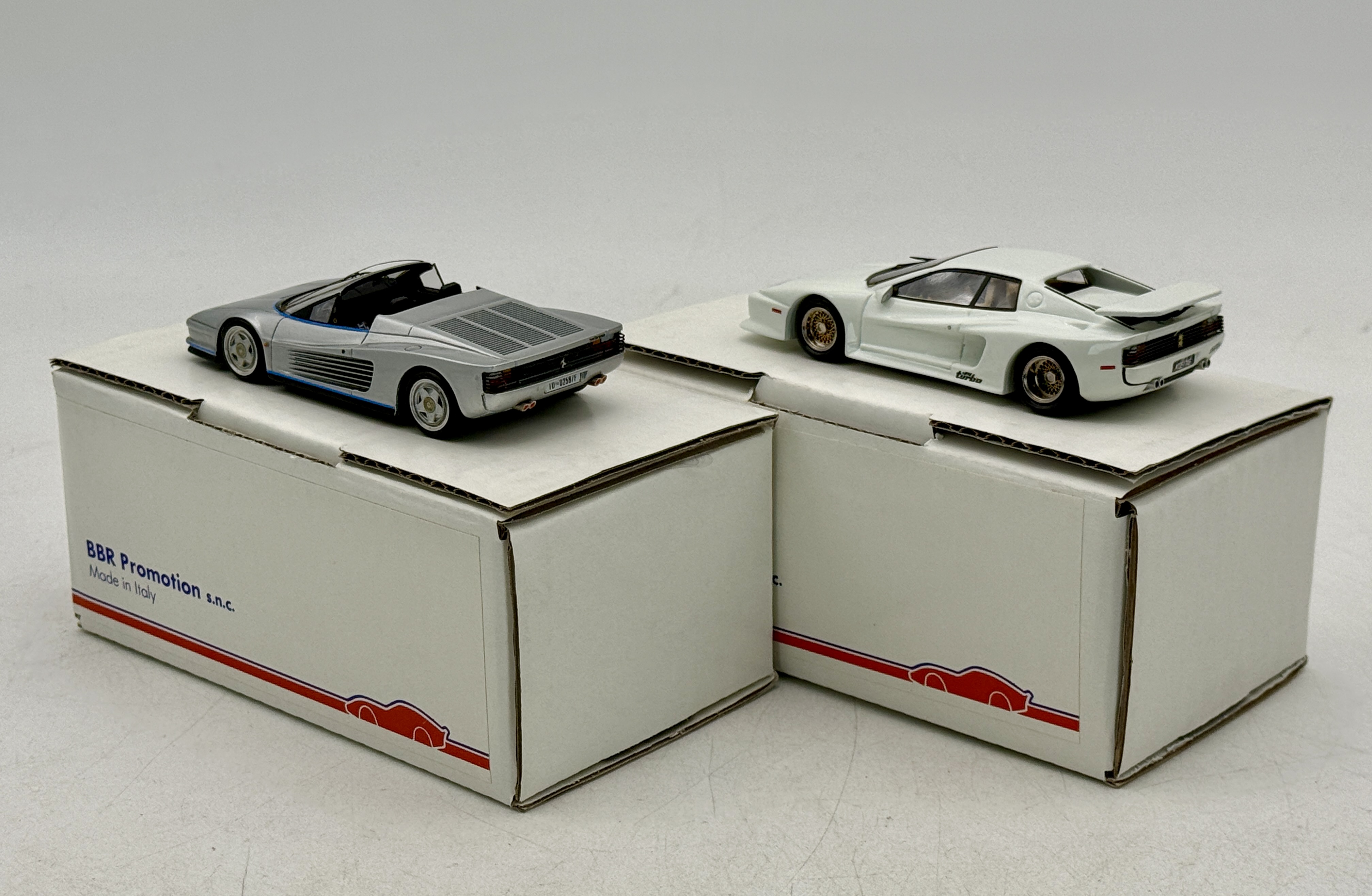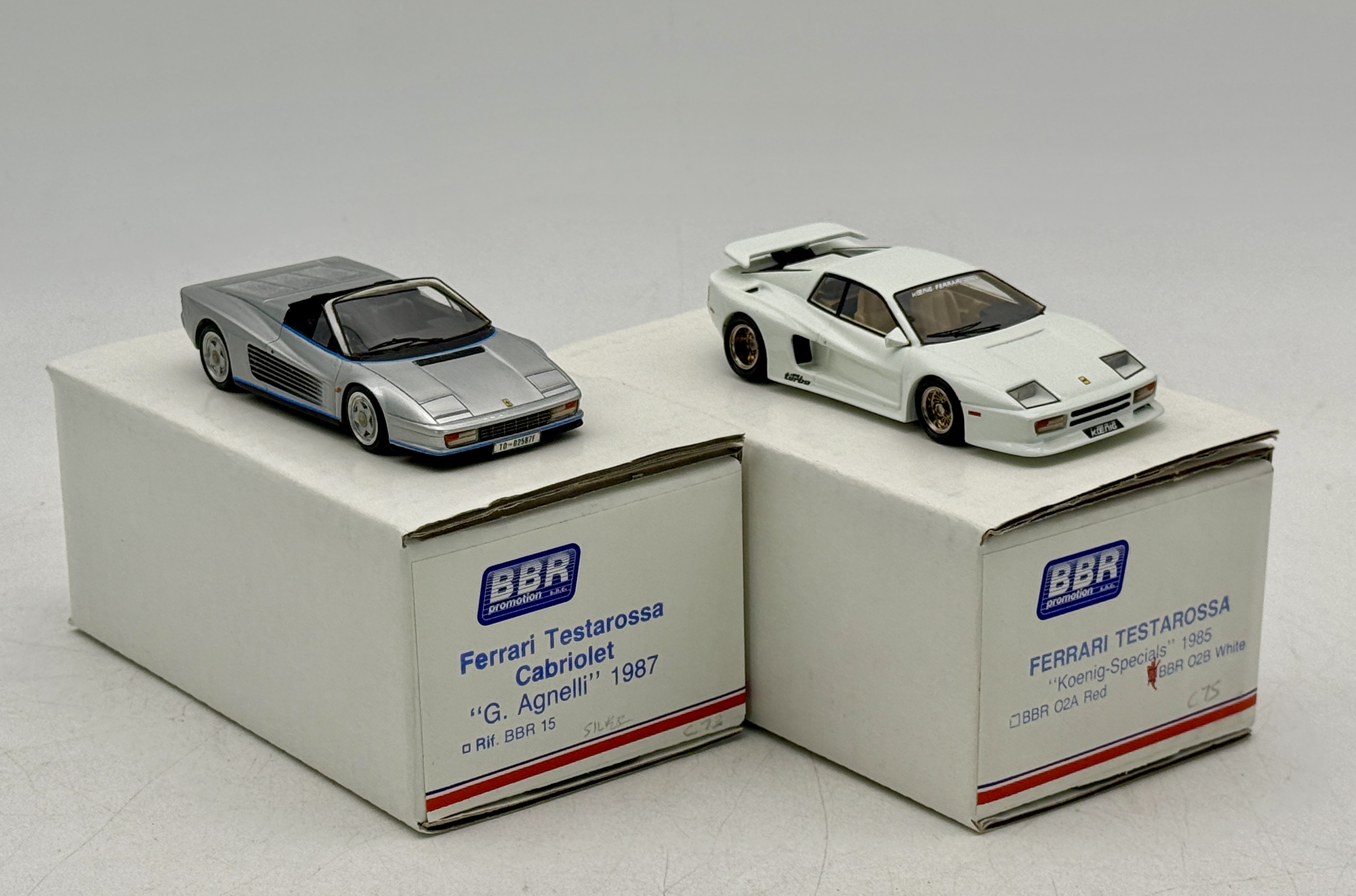 Two BBR Promotion scale model cars including a silver 1987 Ferrari Testarossa Cabriolet G. Agnelli and a white 1985 Ferrari Testarossa Koenig-Specials with original boxes, C9.