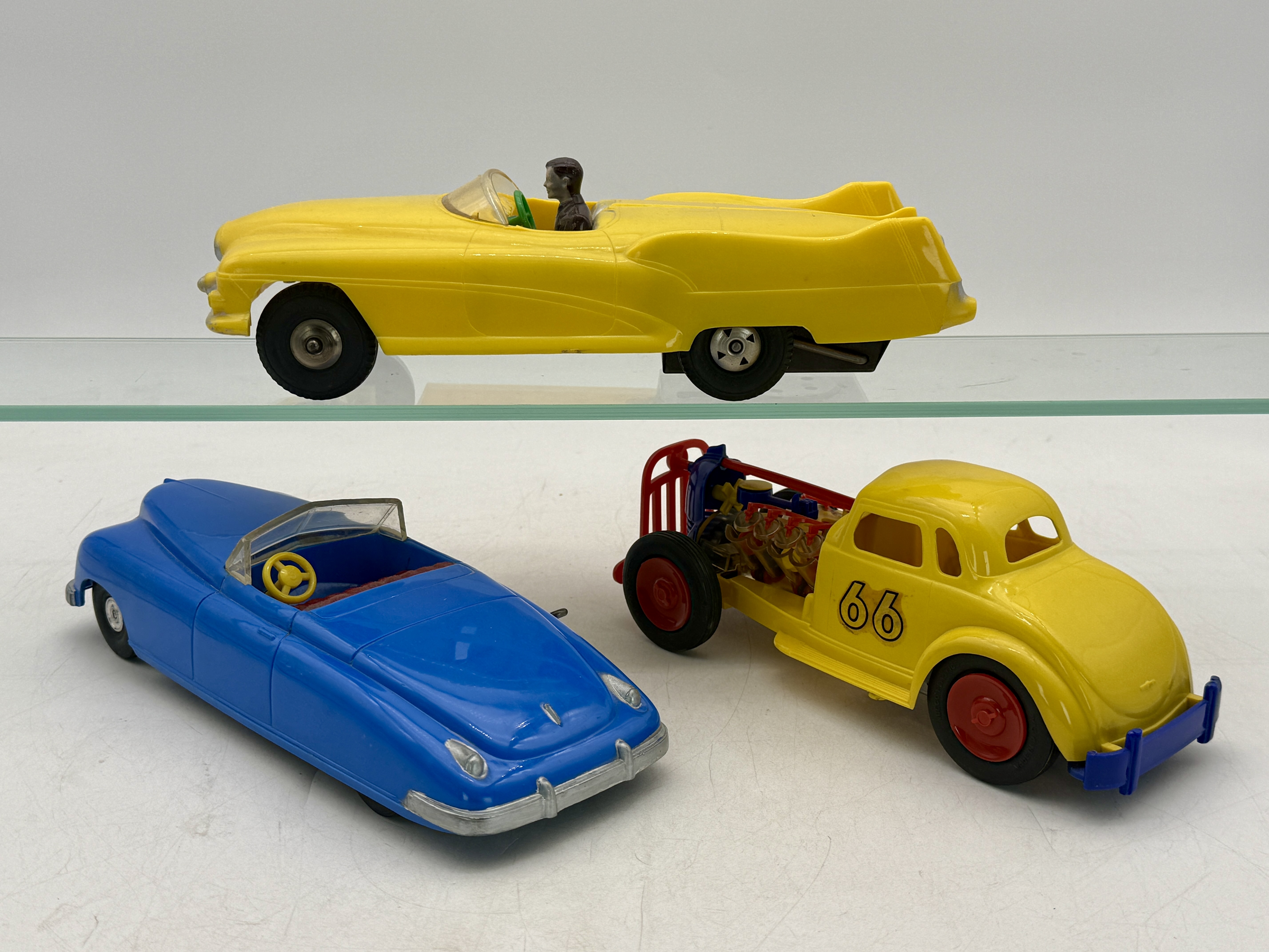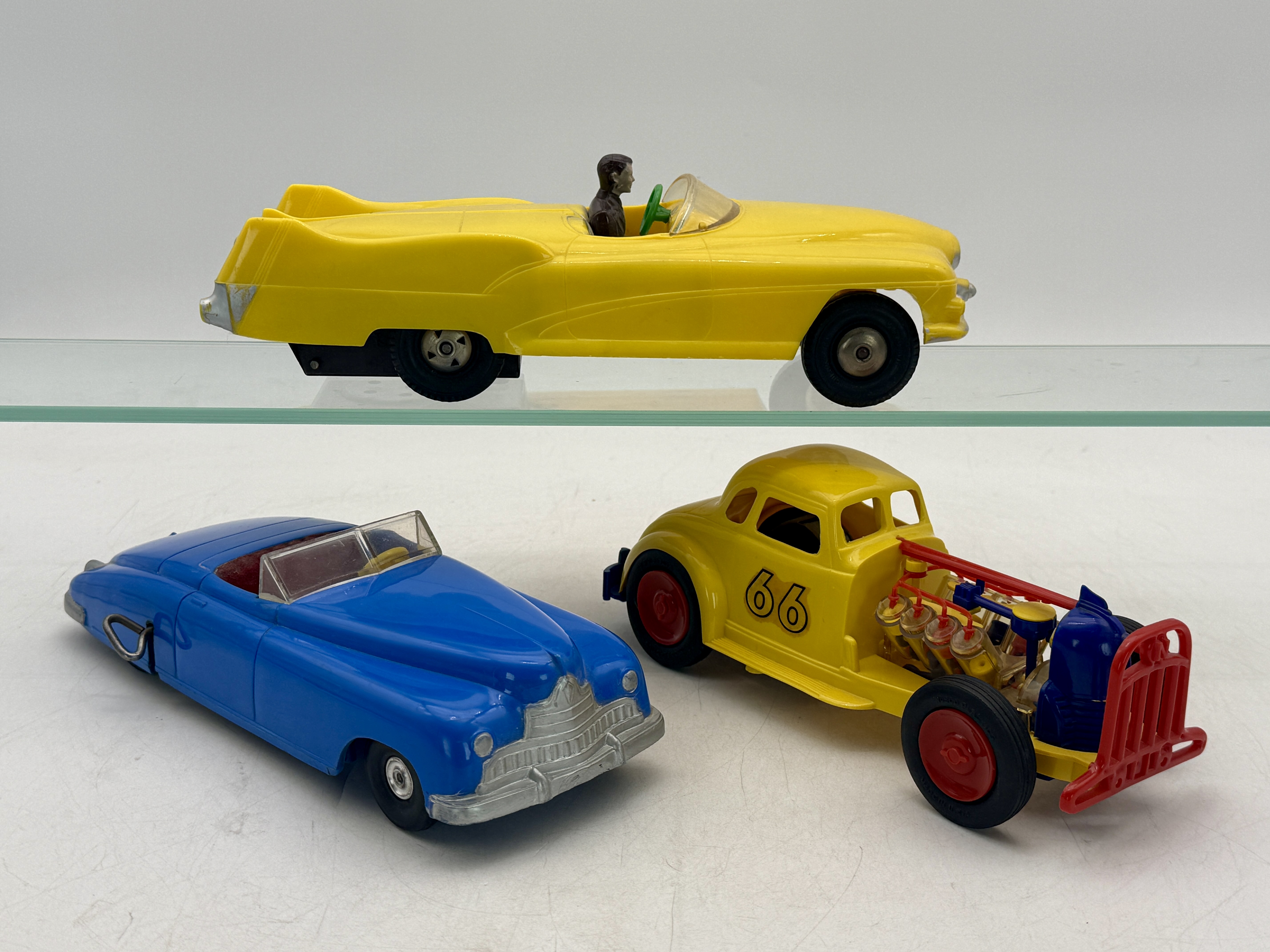 A trio of plastic toy cars including a Nosco Vizy Vee 8 hot rod with number 66 engine is not working, a Saunders blue convertible, and a Marx yellow convertible Lesabre with a driver figure, all friction motors are working, C8-9.