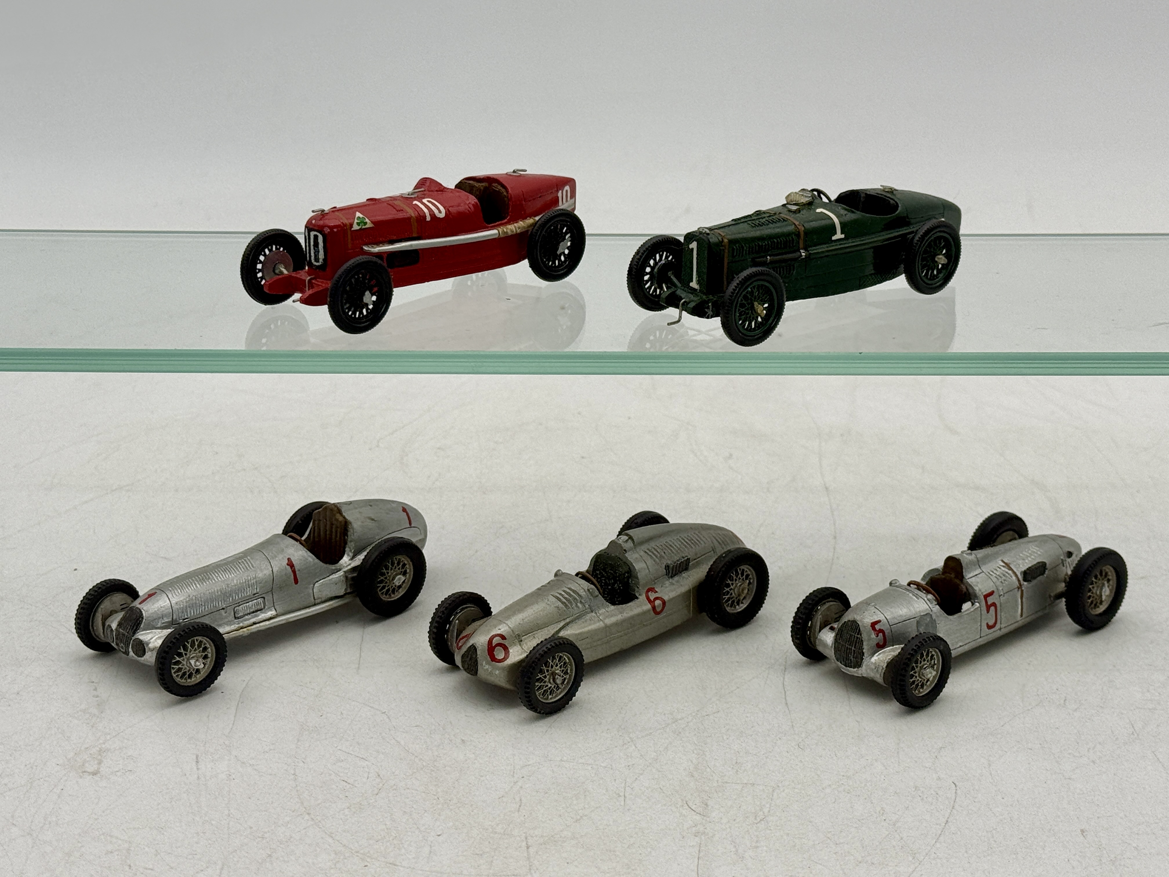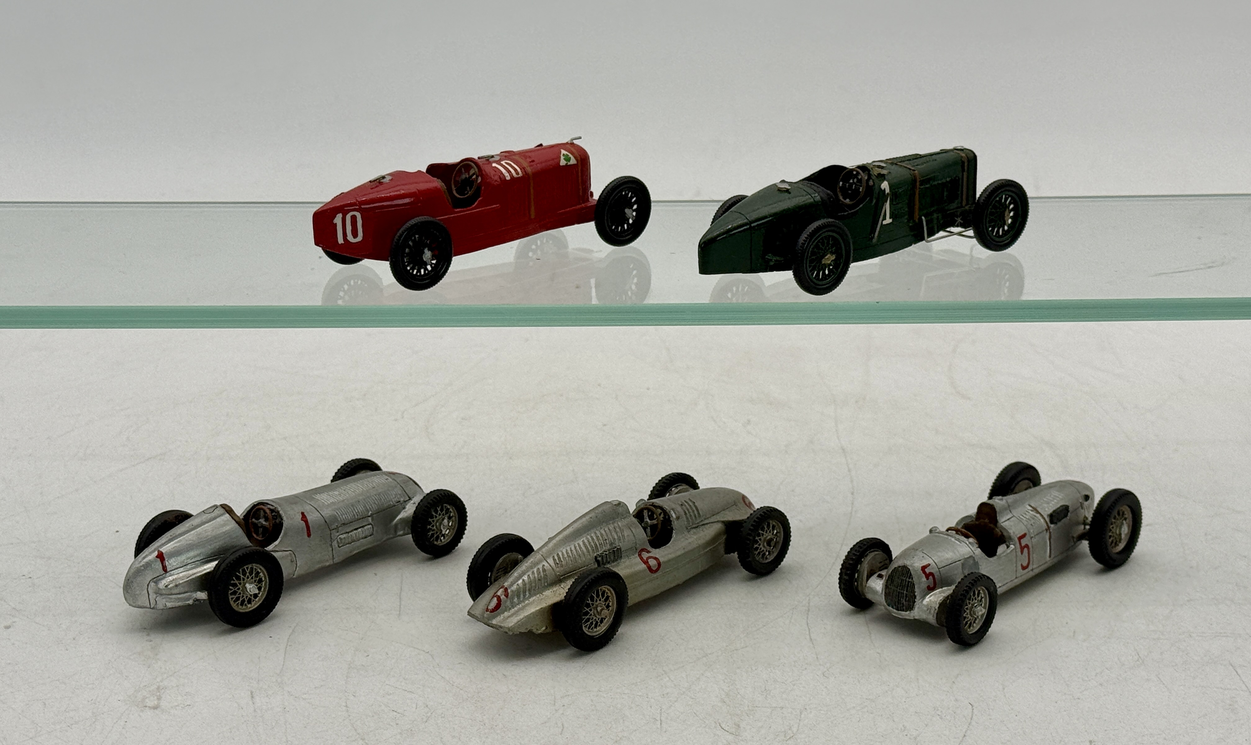 Resin 1/43 scale, 1937 Mercedes-Benz, 1937 Auto union, 1924 Alfa Romeo P2, 1934 Sunbeam, 1938 Auto union, 3 1/2 to 4 inches long all our handmade by AP Stanley circa 1968-69 C 8–9.