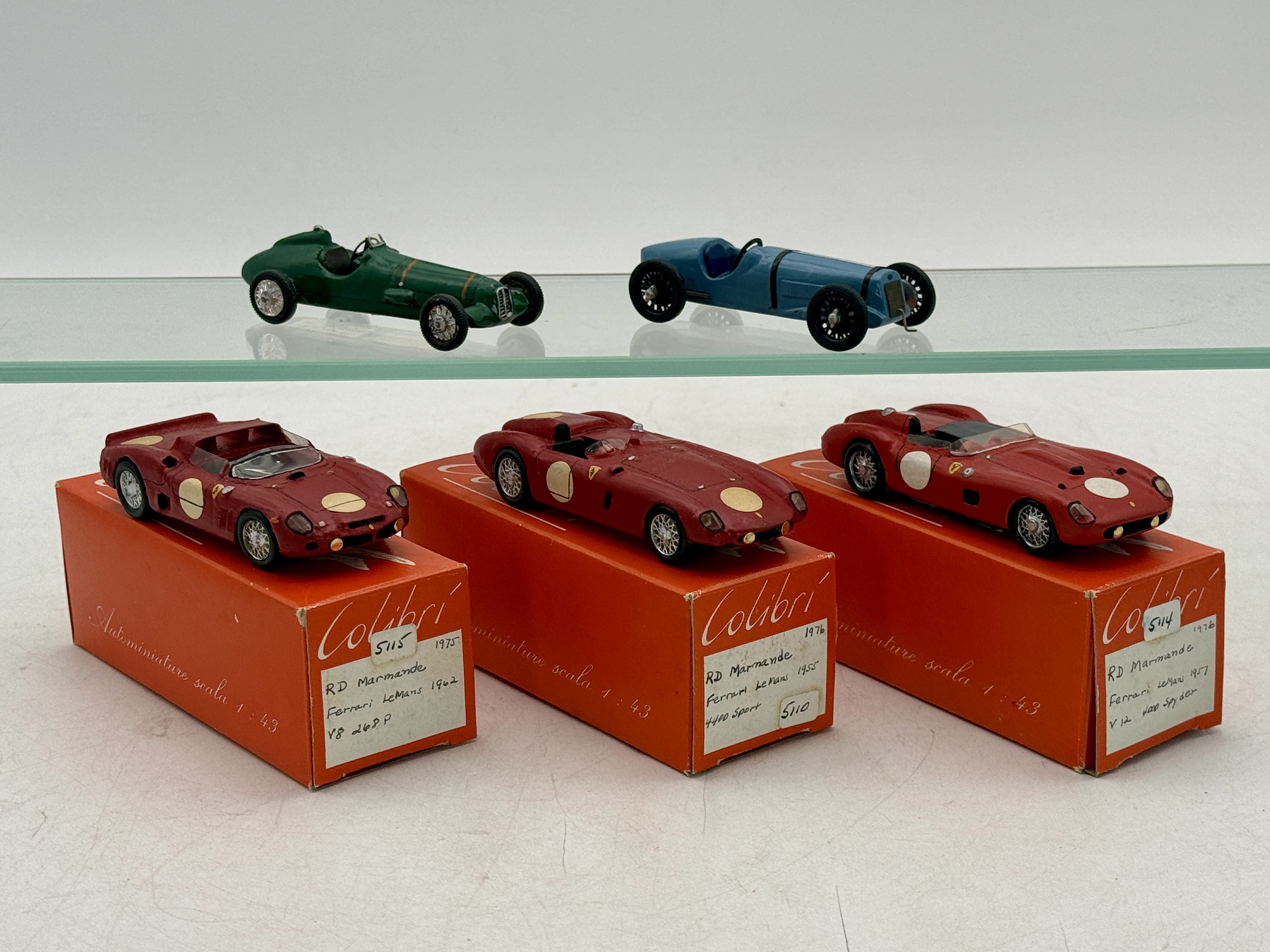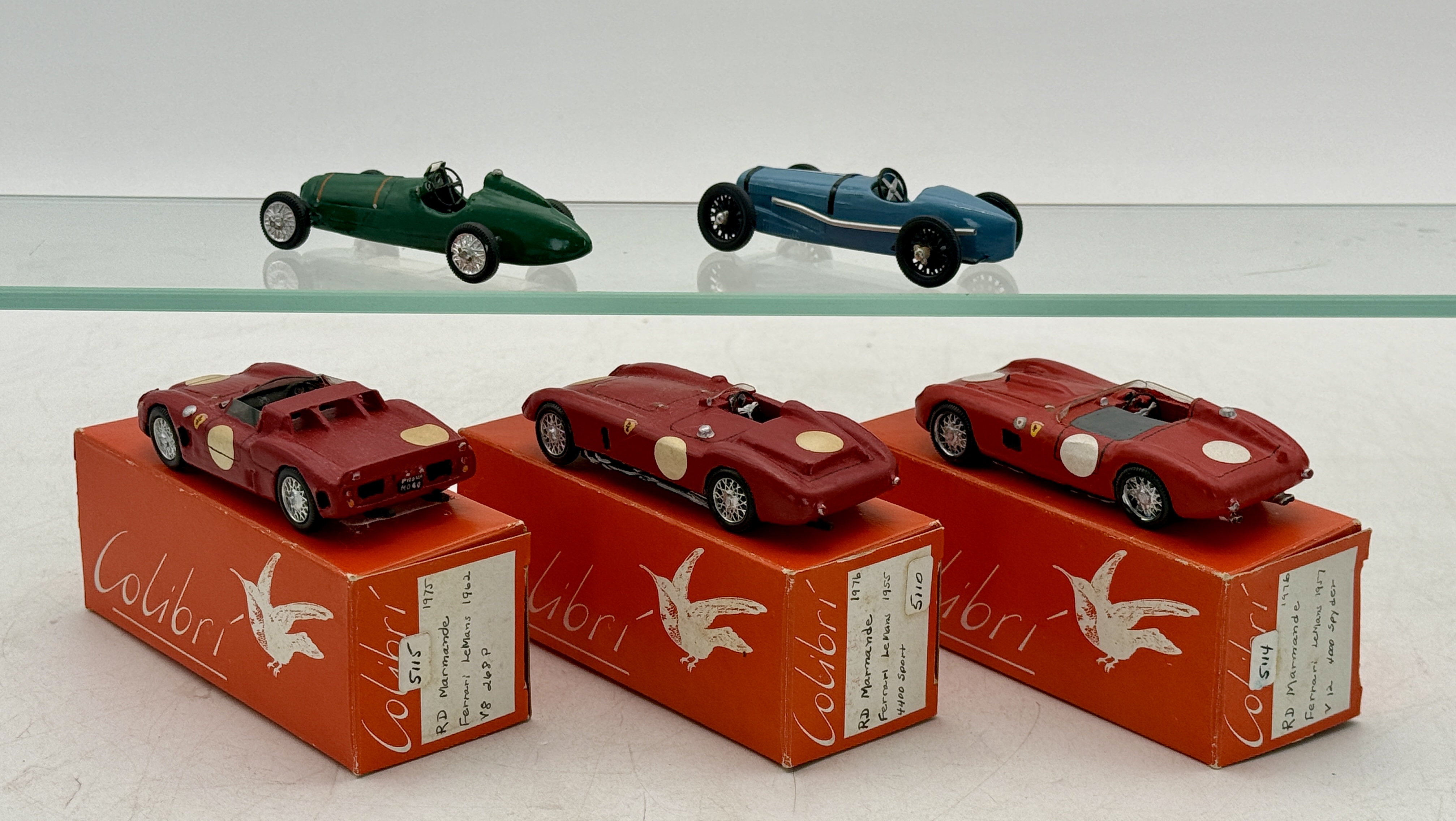 A group of miniature 1:43 scale model racing cars featuring three red Ferrari Le Mans models from 1955, 1957, and 1962 with original Colibri boxes, alongside additional racers in green – Alfa Romeo and blue Delage, all are handmade out of wood 3 1/2 inches long, C8-9.