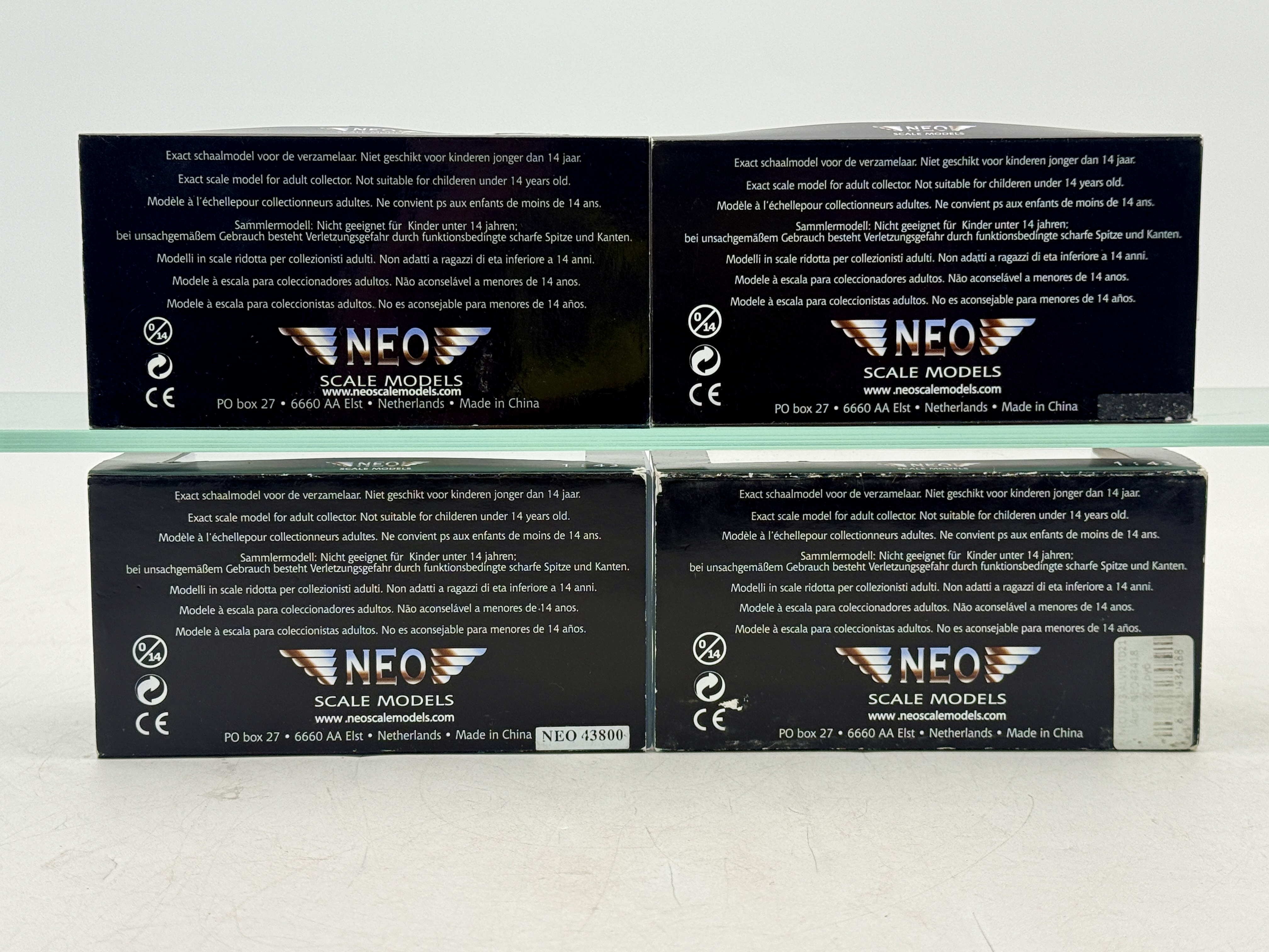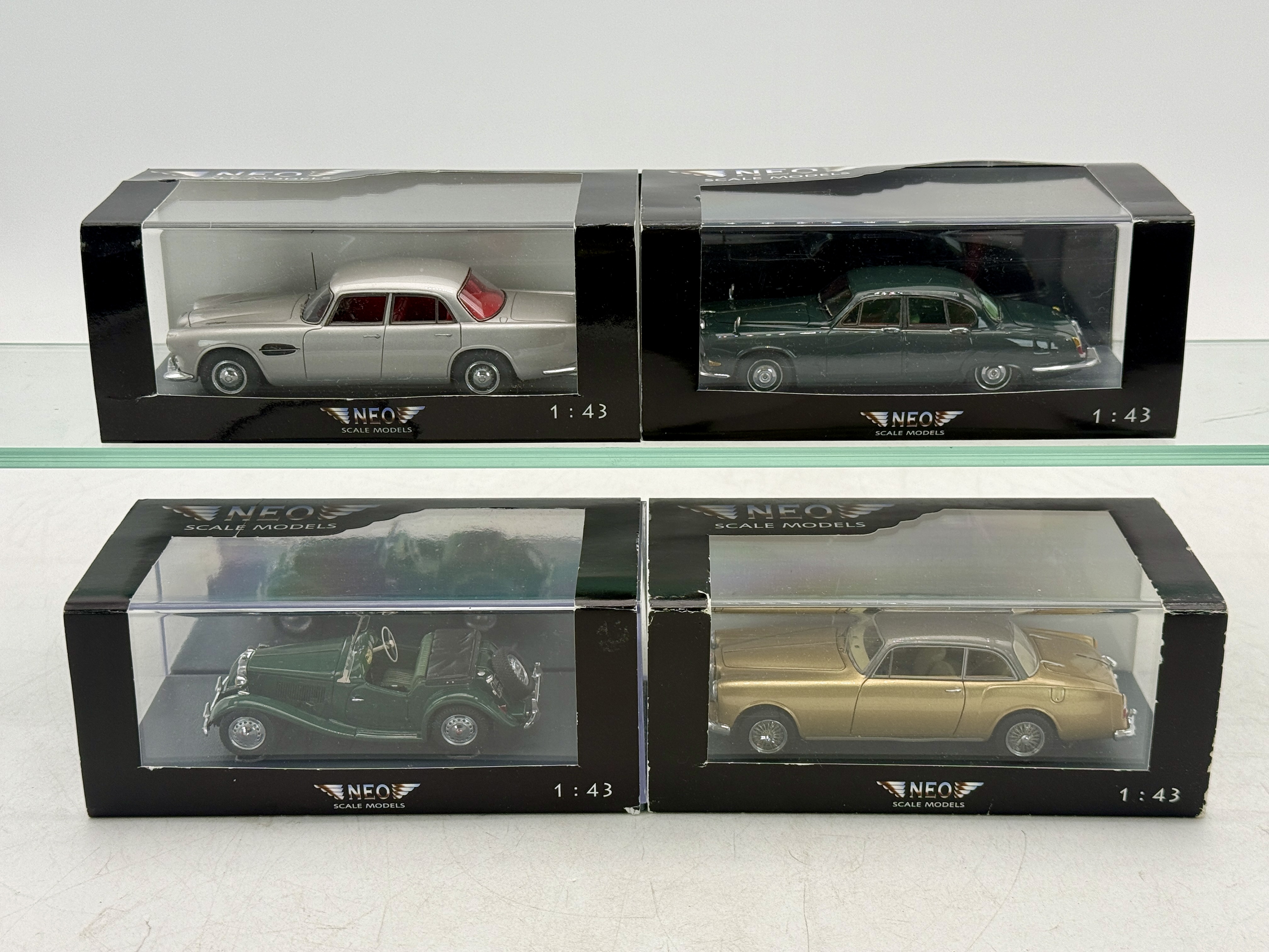 Four 1:43 scale diecast model cars by NEO Scale Models including Lagonda, Jaguar, Alvis, and a MG in original display boxes.
