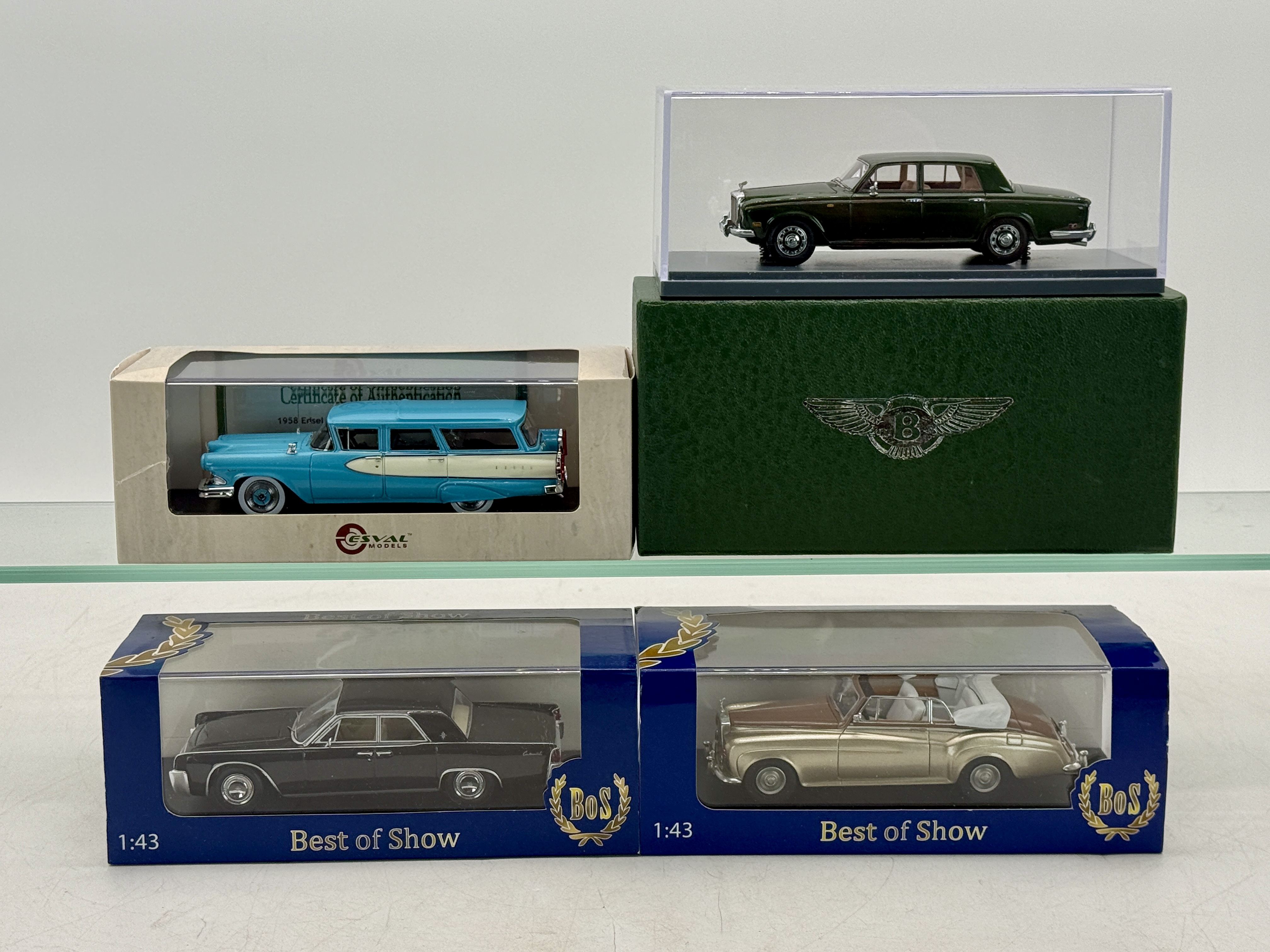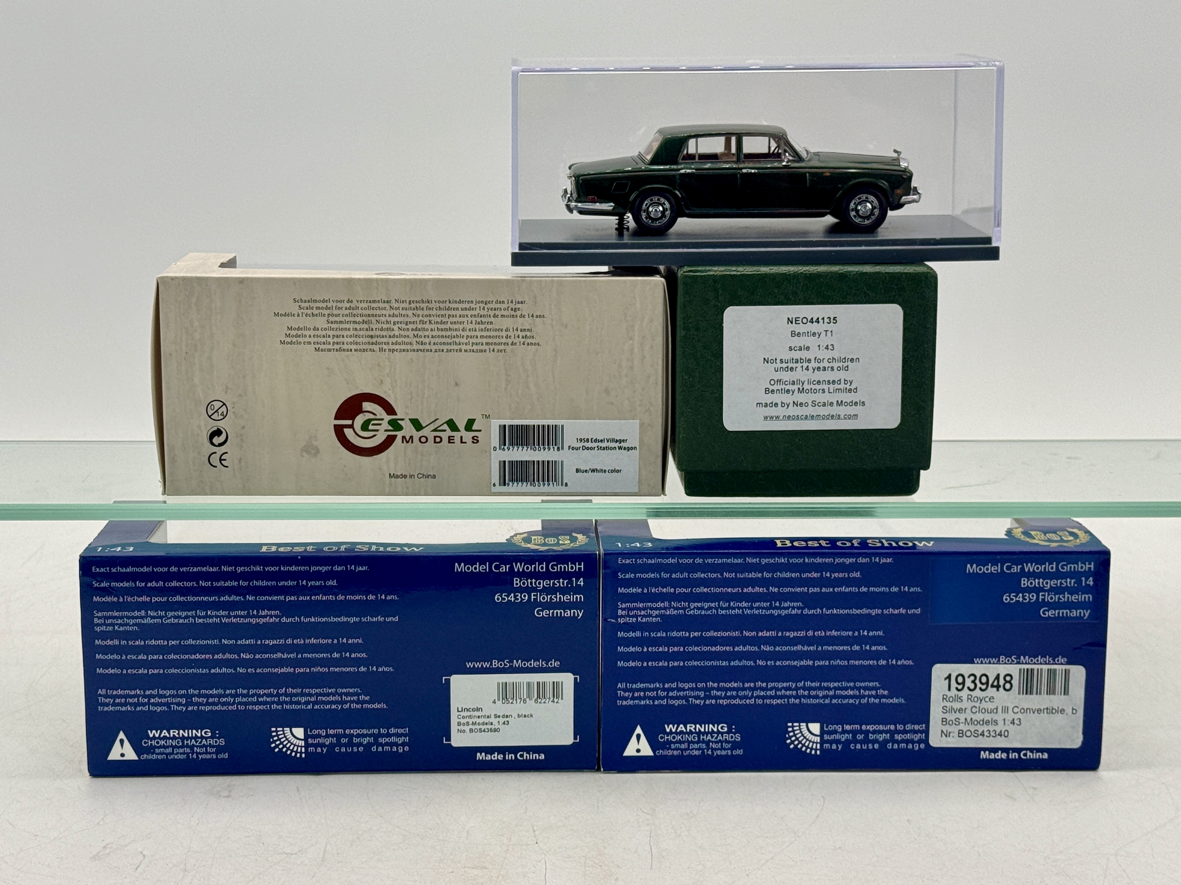 A collection of four 1:43 scale model cars including a green Neo Scale Models Bentley T1, a blue and white Esval Models 1958 Edsel Villager, a black BoS Lincoln Continental Sedan, and a gold BoS Rolls Royce Silver Cloud III Convertible C9.