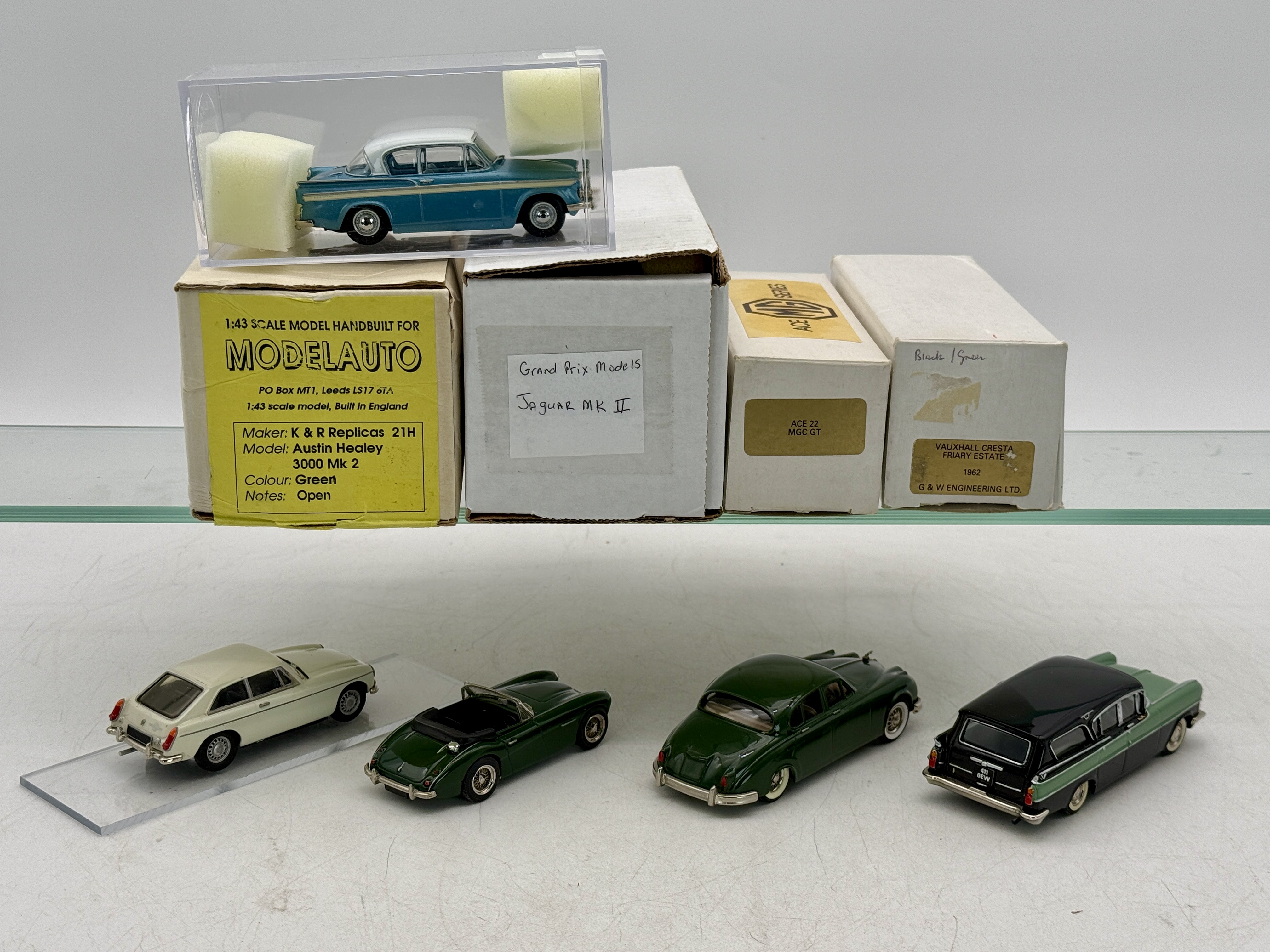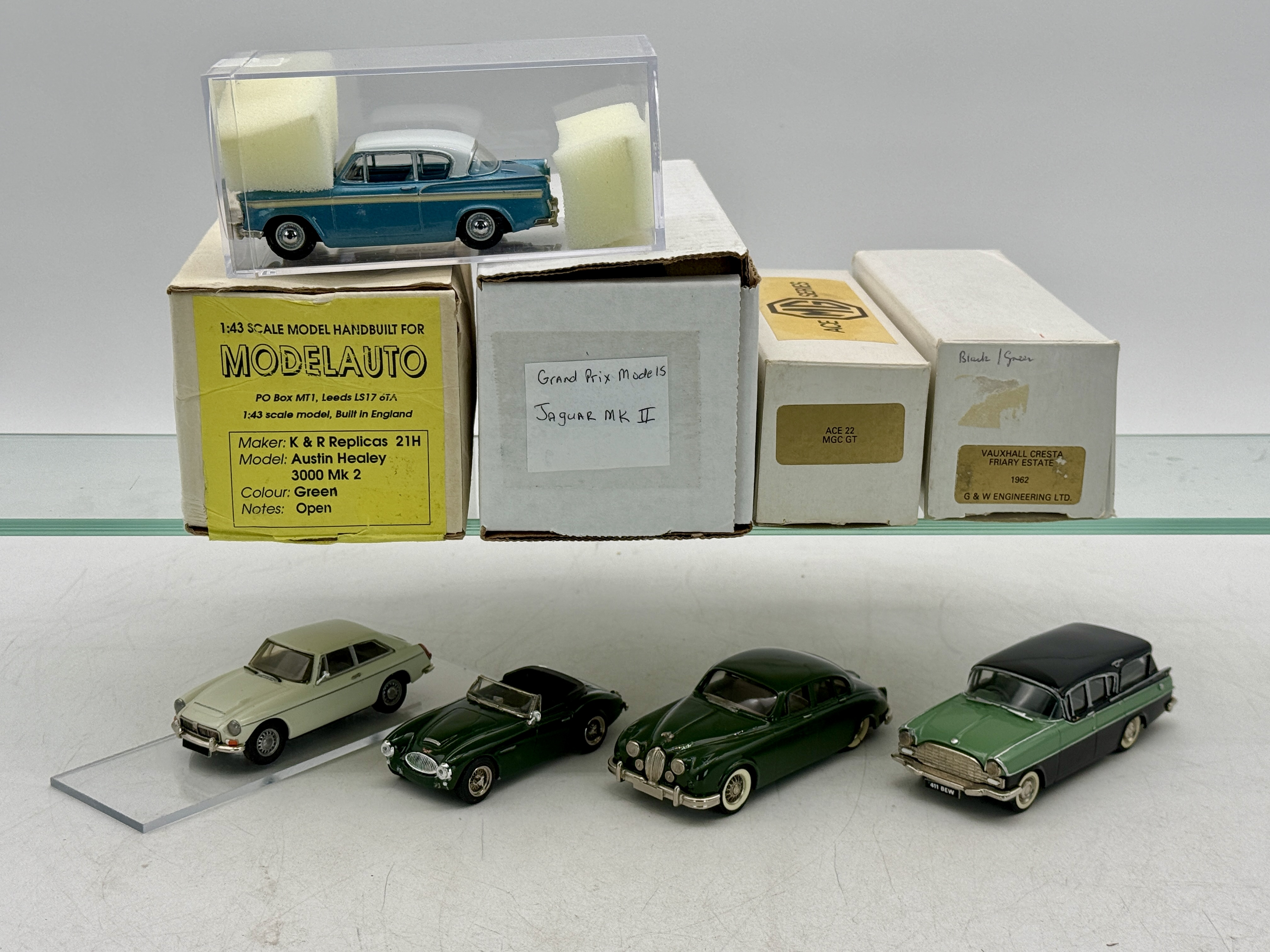 A collection of five 1:43 scale handbuilt model cars including an K&R Austin Healey 3000 Mk 2, Grand Prix Models Jaguar MK II, Ace 22 MGC GT, G &W Vauxhall Cresta Friary Estate, and a Sunbeam Rapier.