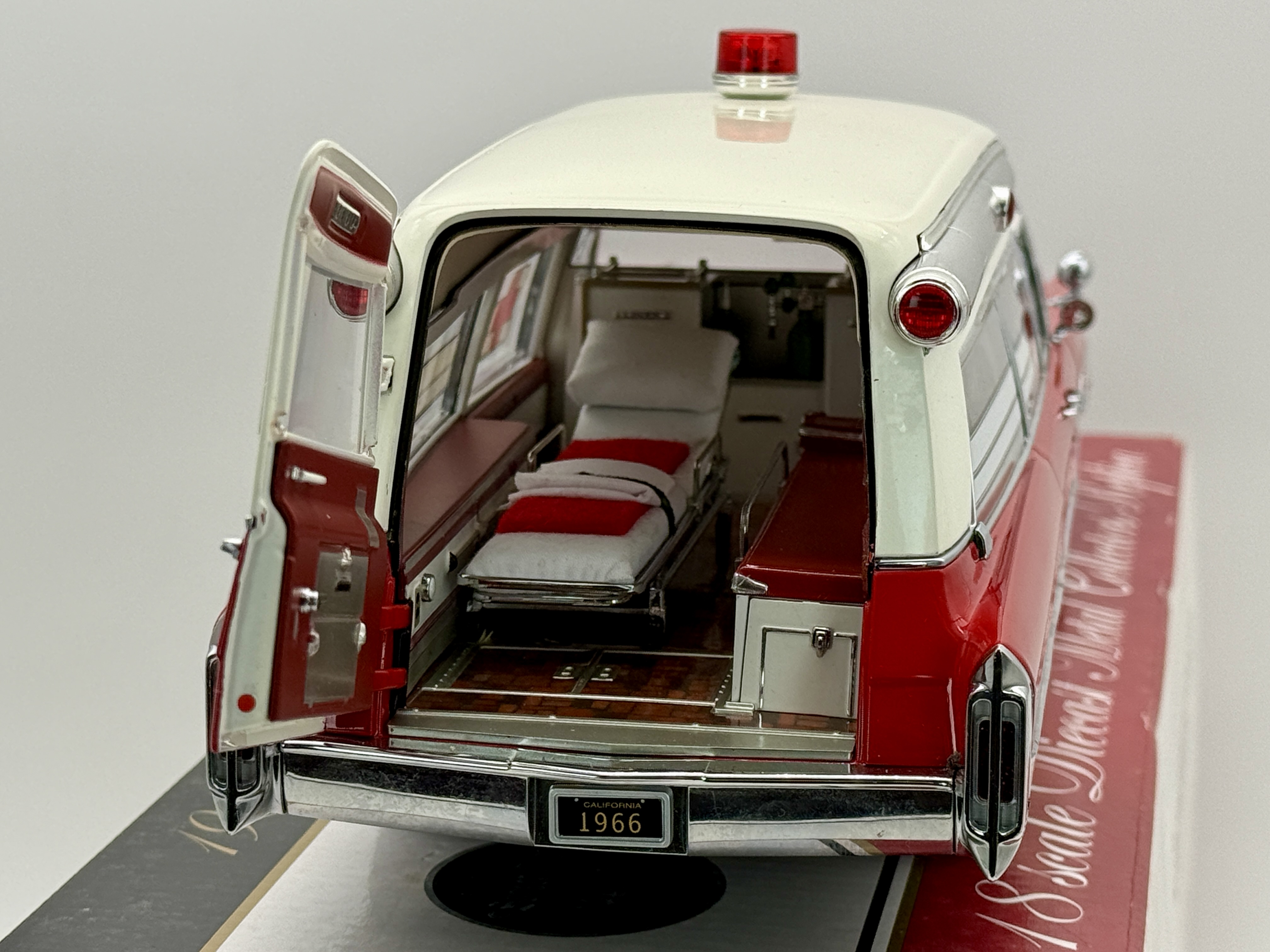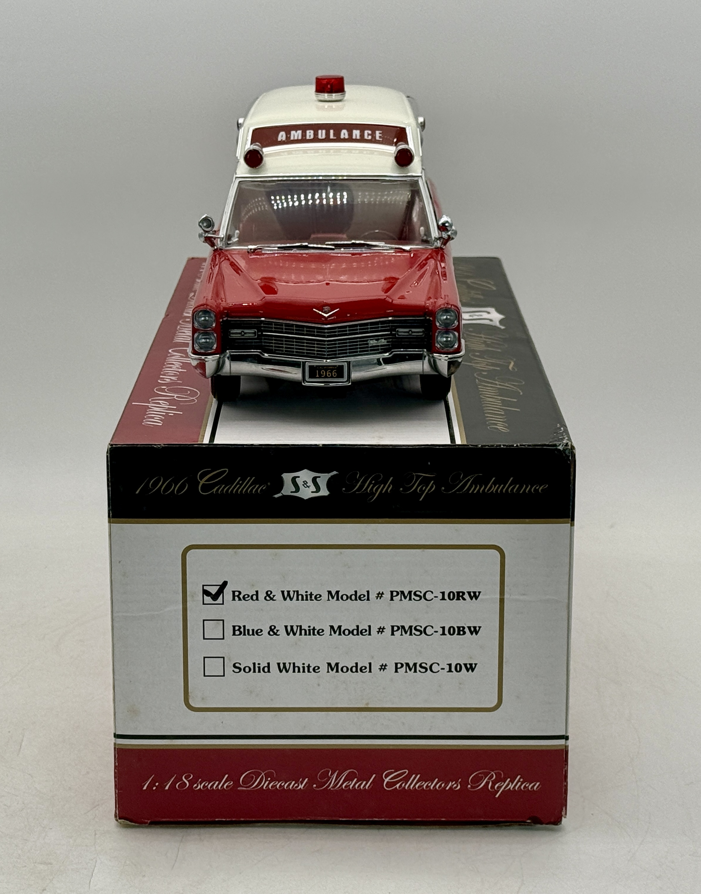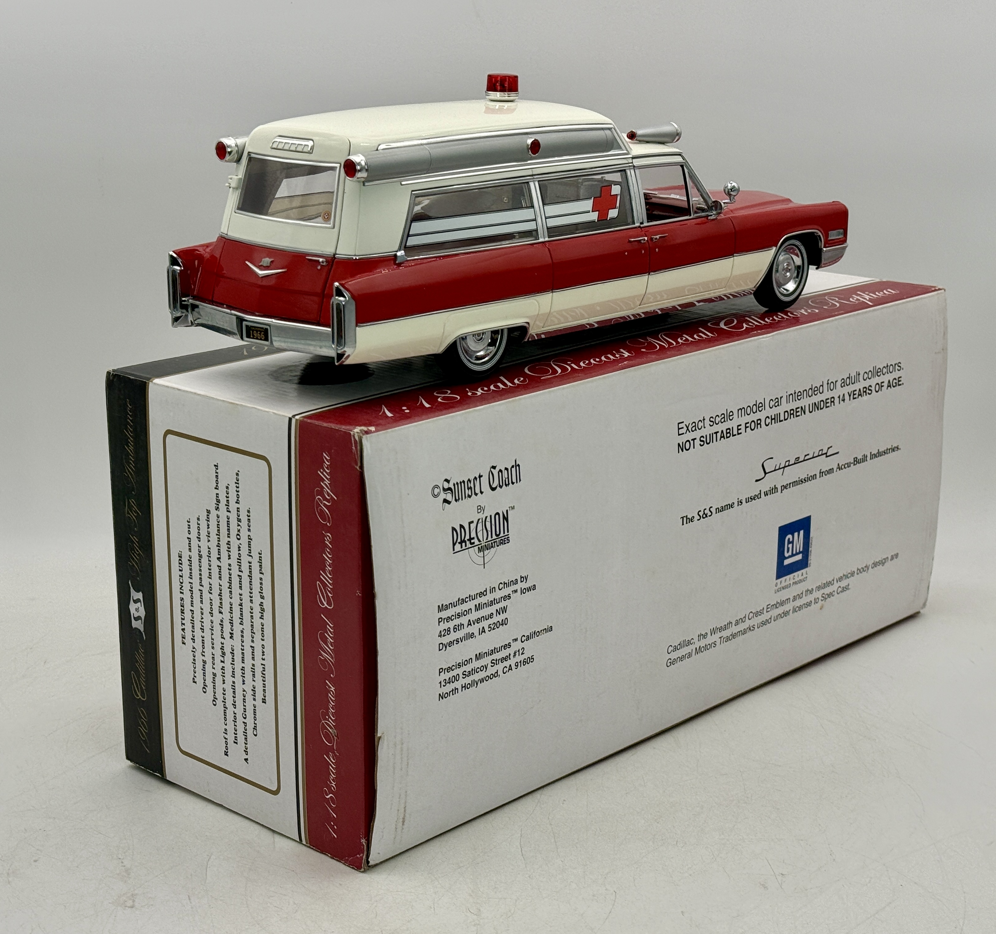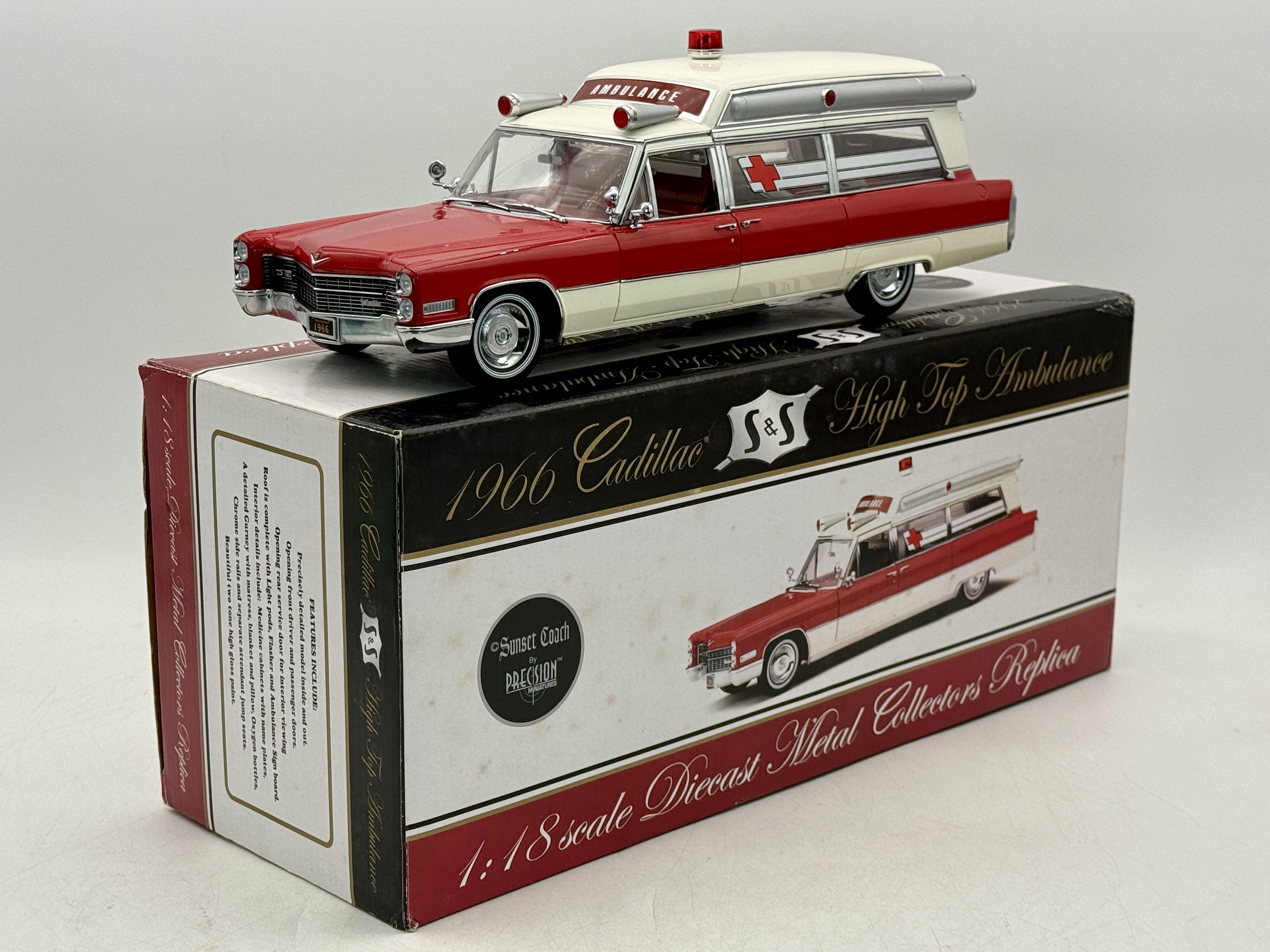 A red and white 1:18 scale diecast metal replica of a 1966 Cadillac S&S High Top Ambulance by Precision Miniatures featuring a detailed interior with gurney and original packaging, C9.