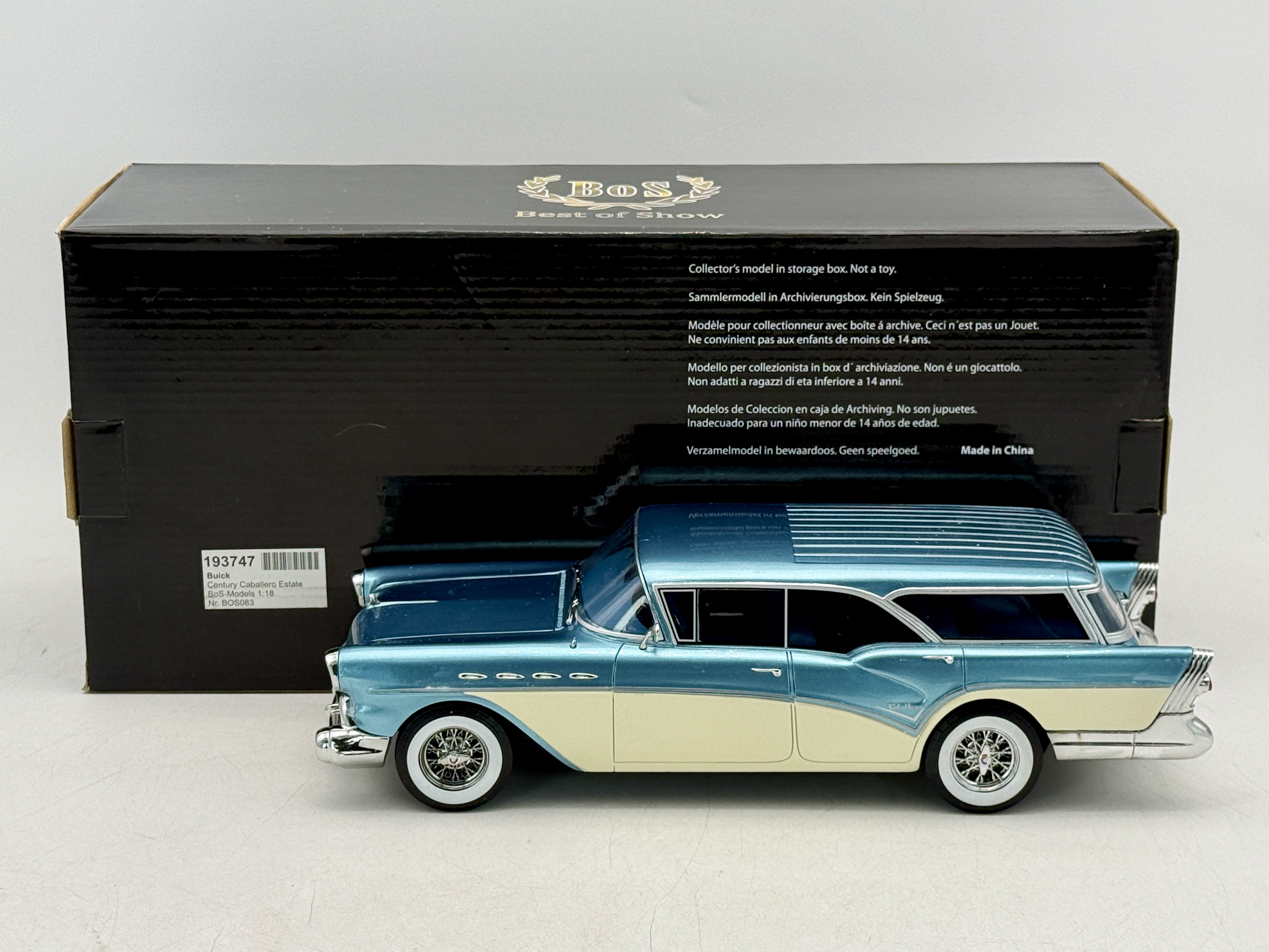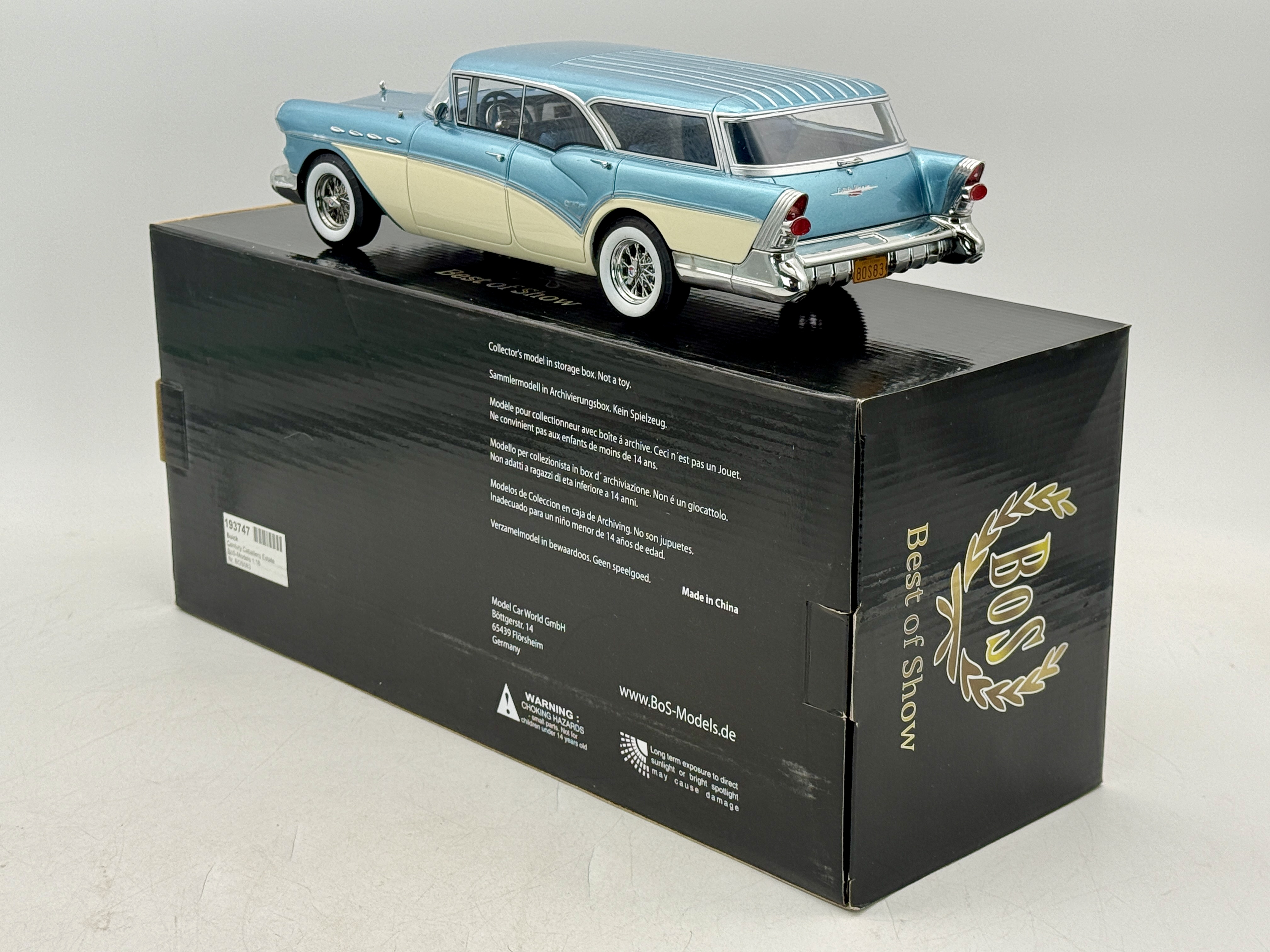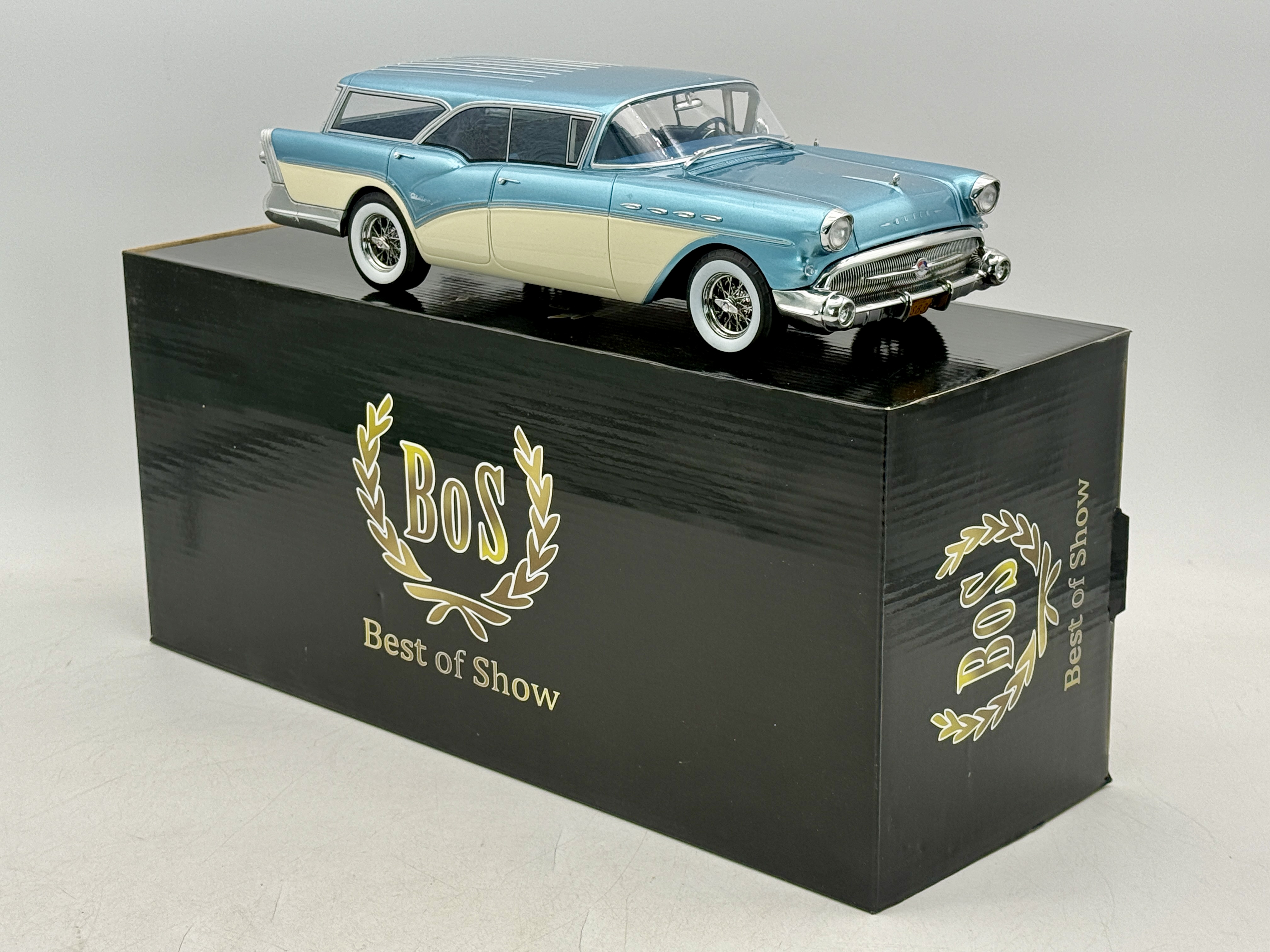 A metallic blue and cream 1:18 scale BoS model of a Buick Century Caballero Estate with original packaging and model number BOS083,397 of 1000, 12 inches long, C9.