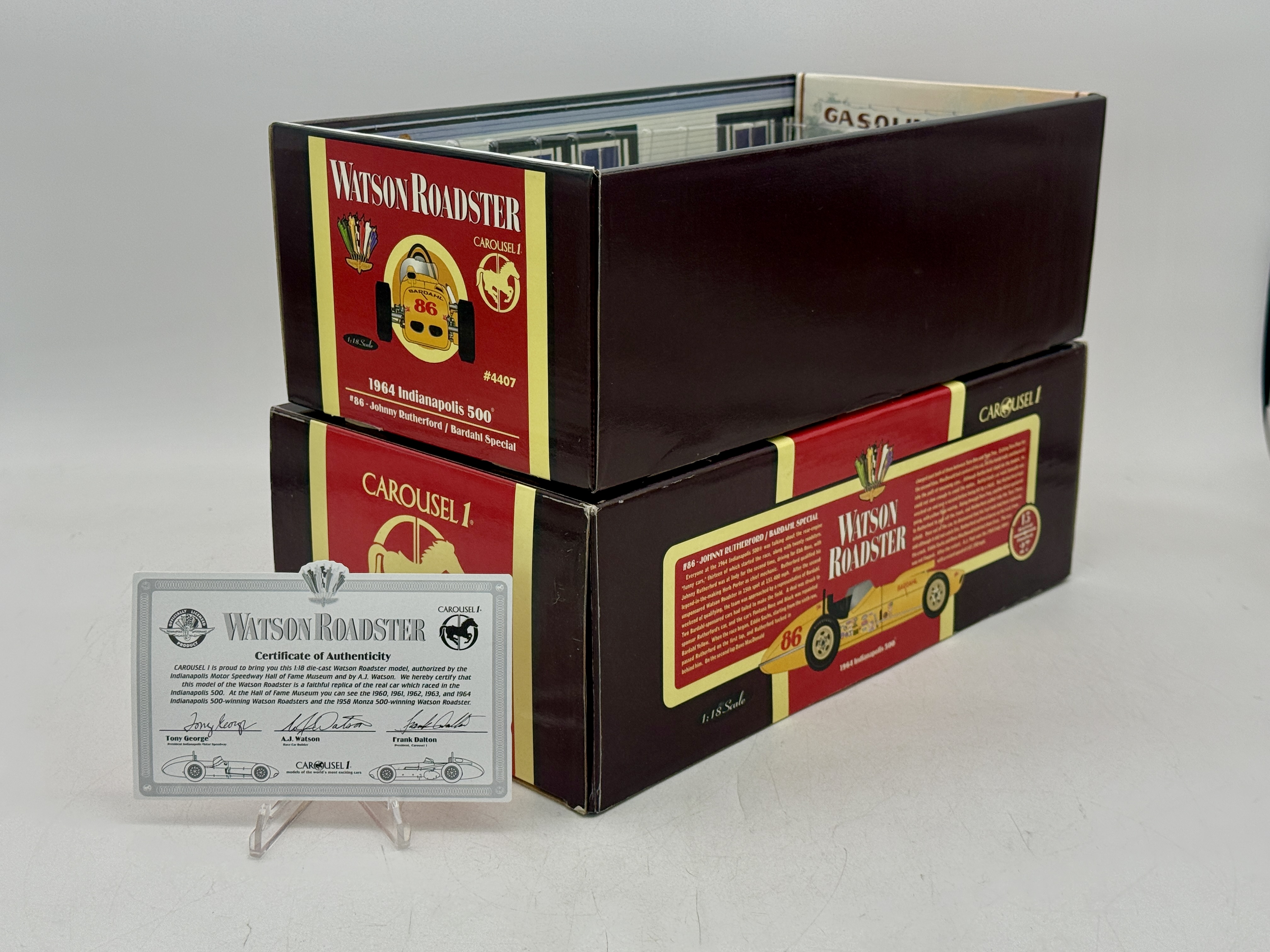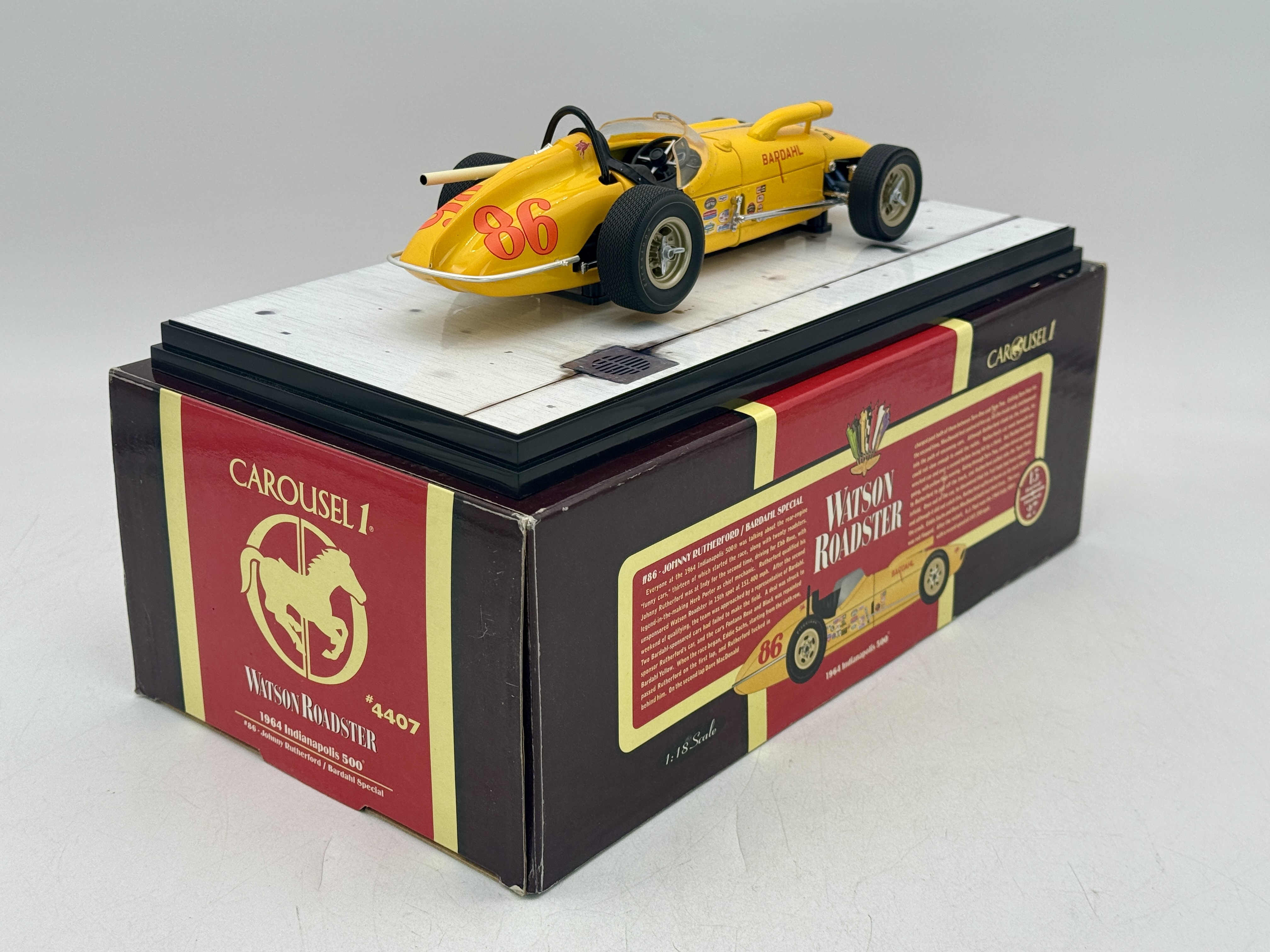 A yellow 1:18 scale die-cast model of the #86 Bardahl Special Watson Roadster driven by Johnny Rutherford in the 1964 Indianapolis 500, including original packaging and certificate of authenticity. 9 inches long, OB and inserts and certification C9