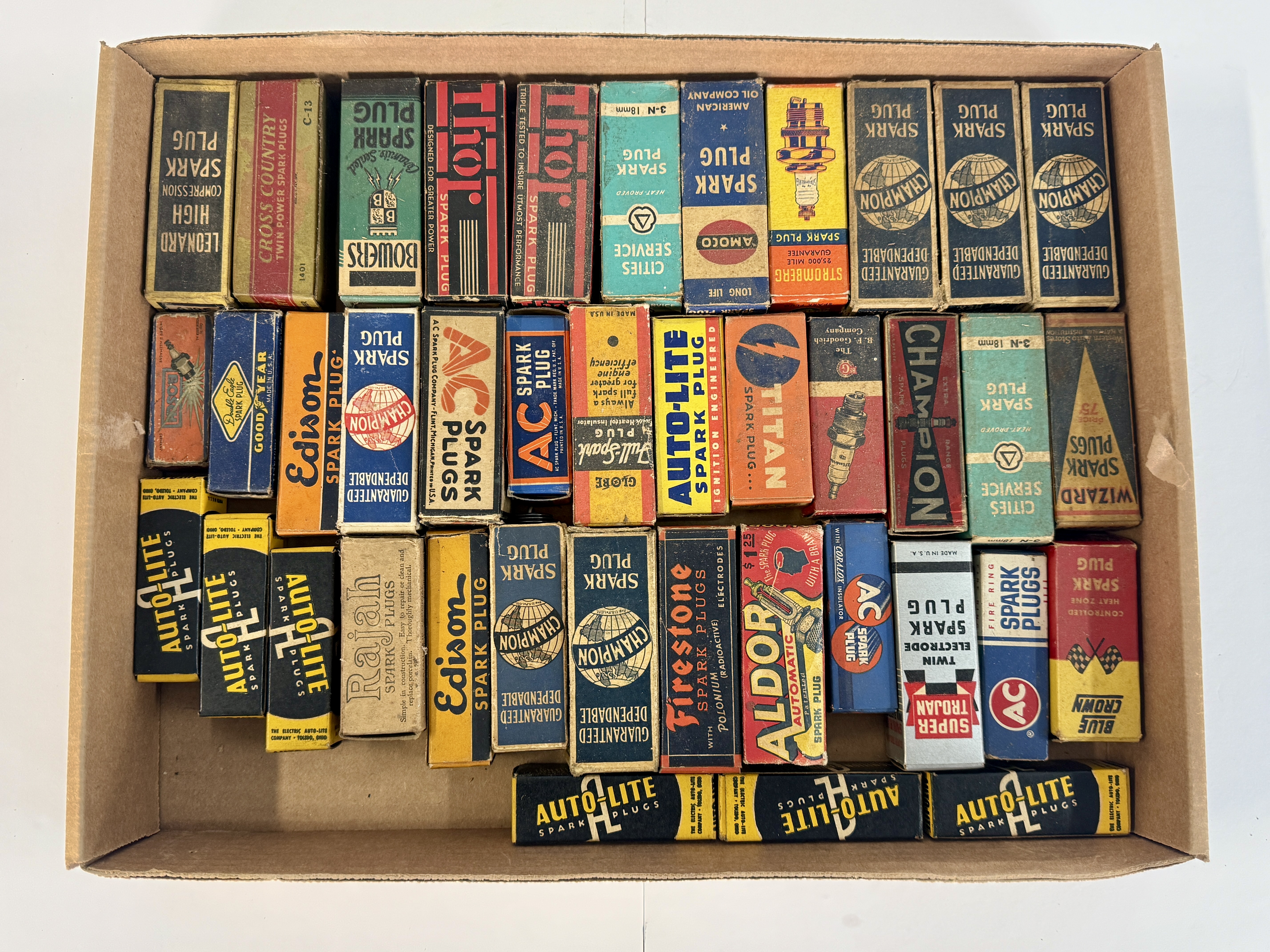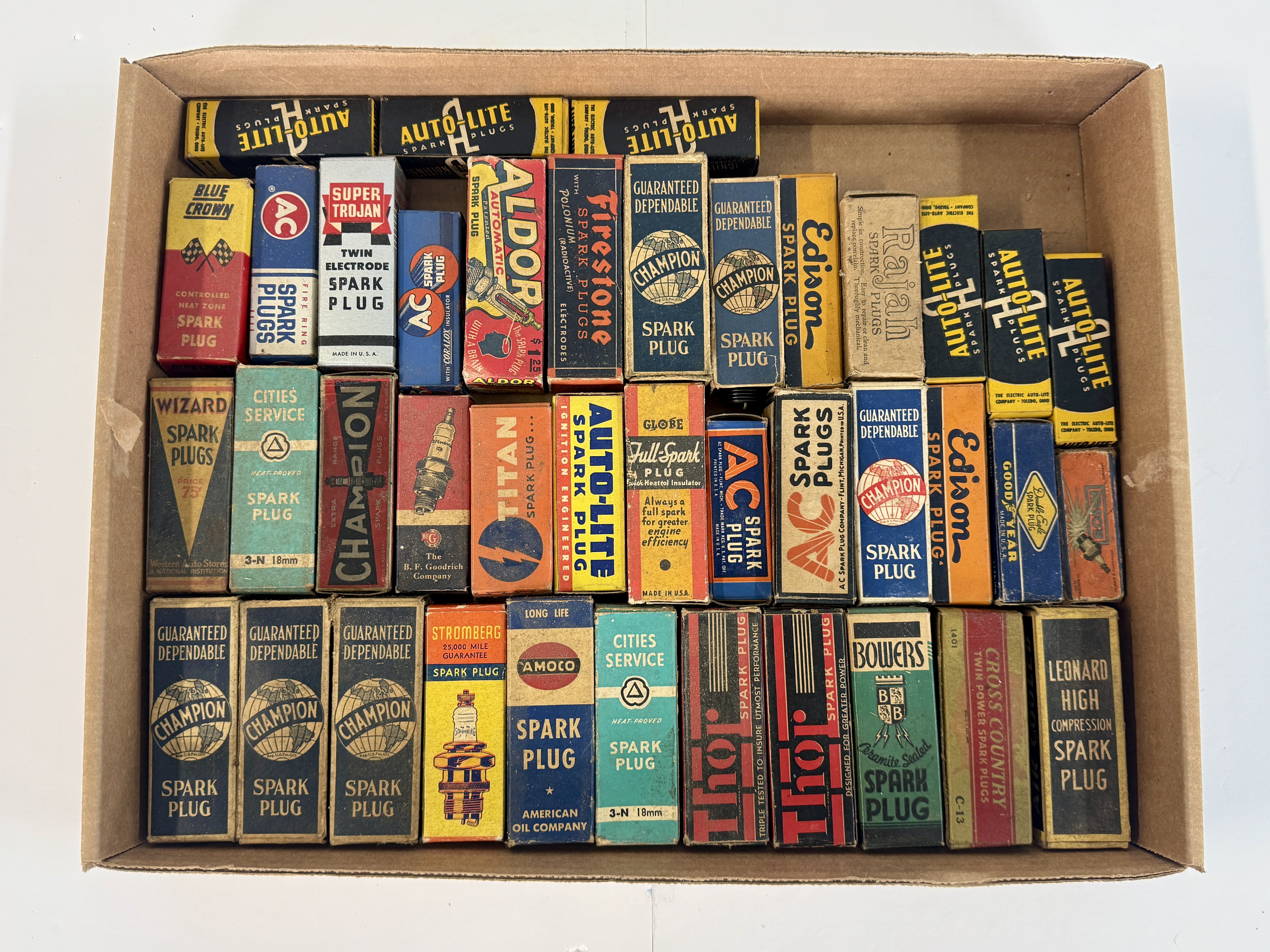 A collection of multi-colored vintage spark plugs in boxes from various brands including Champion, AC, Auto-Lite, Firestone, Edison, and Thor, with some items displaying original prices C7-9.
