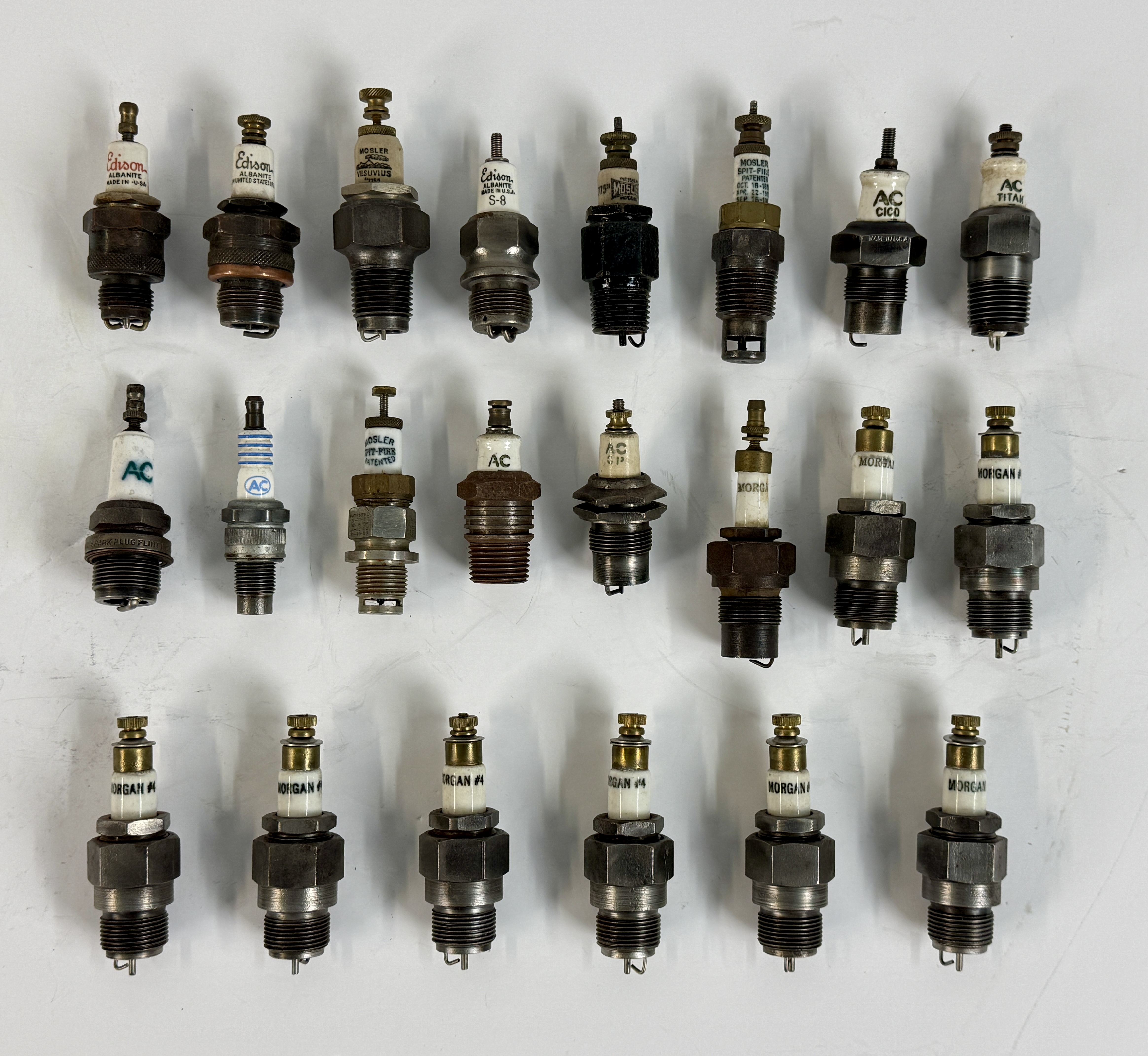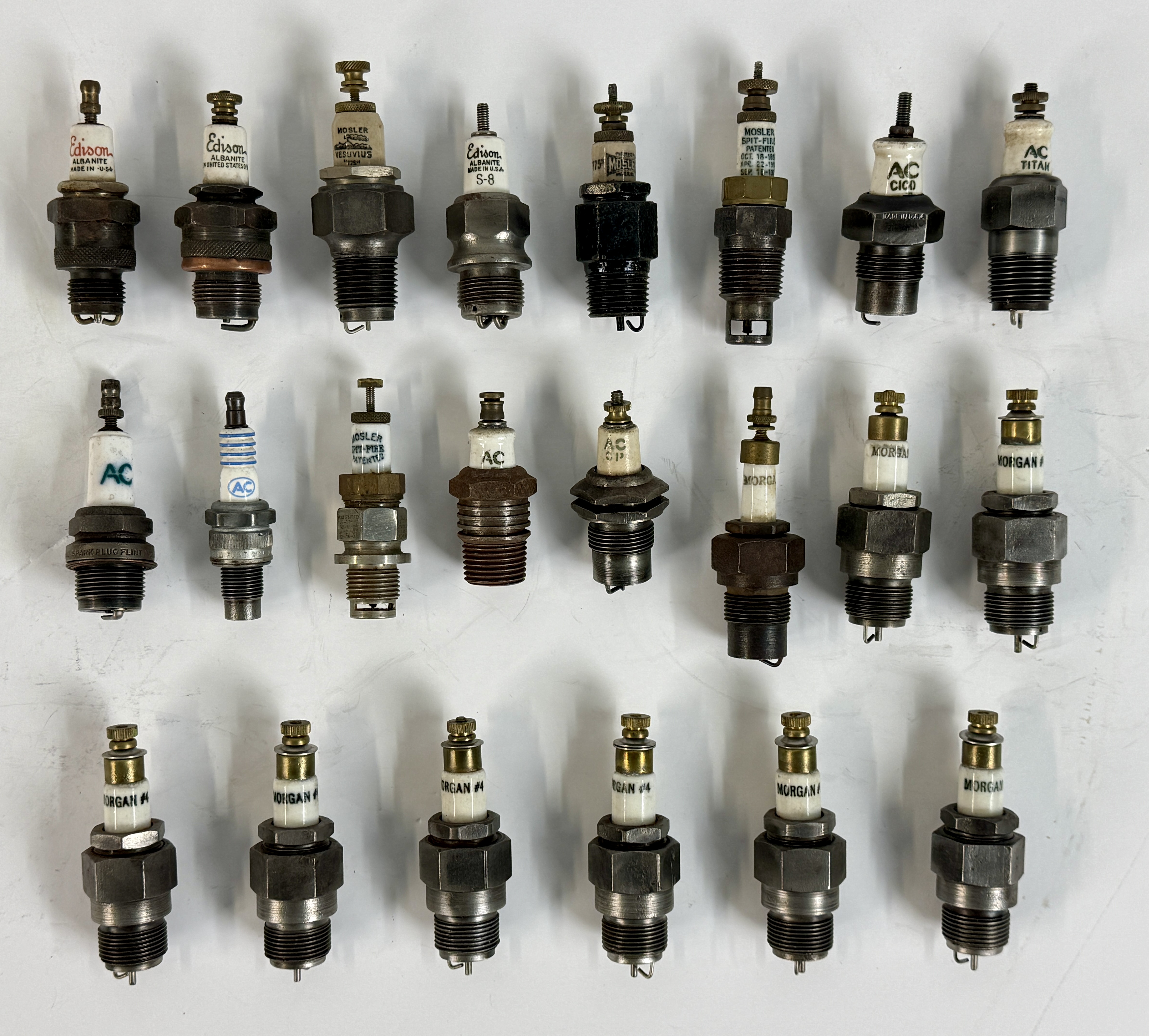 A collection of vintage metallic and white ceramic spark plugs featuring brands including Edison Albanite, Mosler Vesuvius, Mosler Spit-Fire, AC Titan, AC Cico, and Morgan #4 used, C5-8.