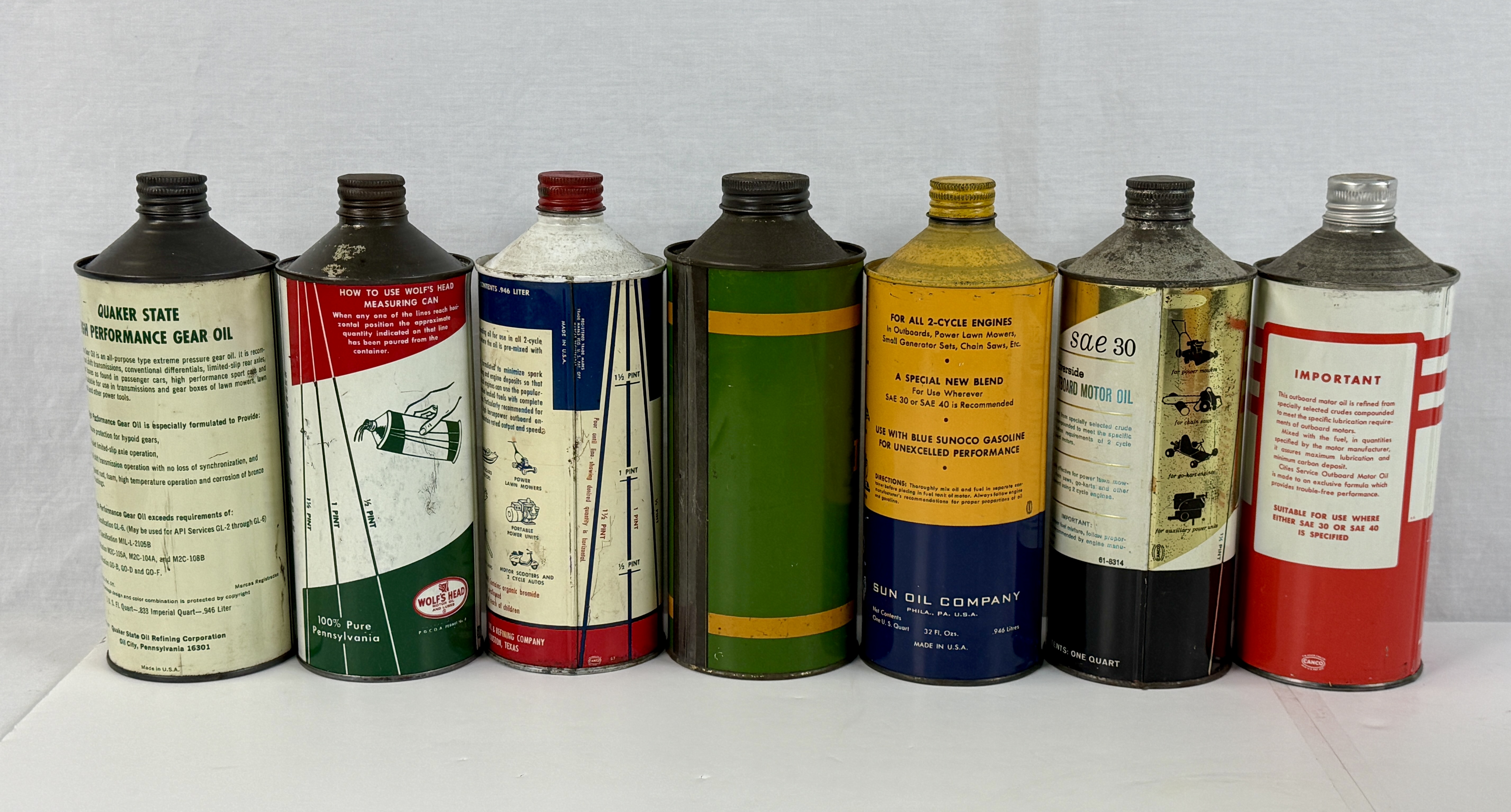 Seven vintage one quart multi-colored metal oil cans featuring brands including Quaker State, Wolf’s Head, Esso, BP Energol, Sunoco, Riverside, and Cities Service, C5-8.