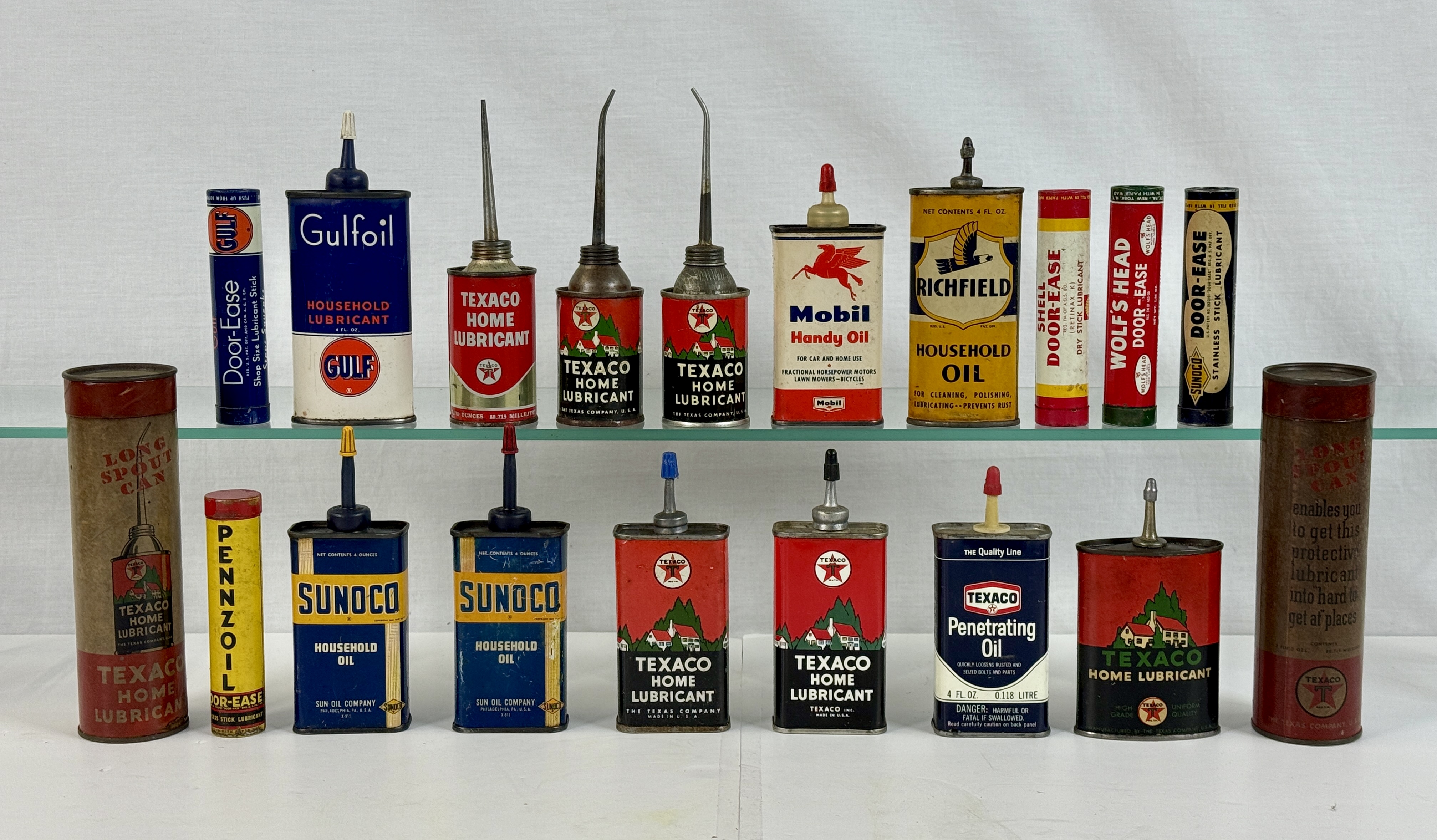 A collection of vintage household oil cans and lubricant sticks featuring brands such as Texaco, Mobil, Sunoco, and Gulfoil in various sizes and colors C5-8.