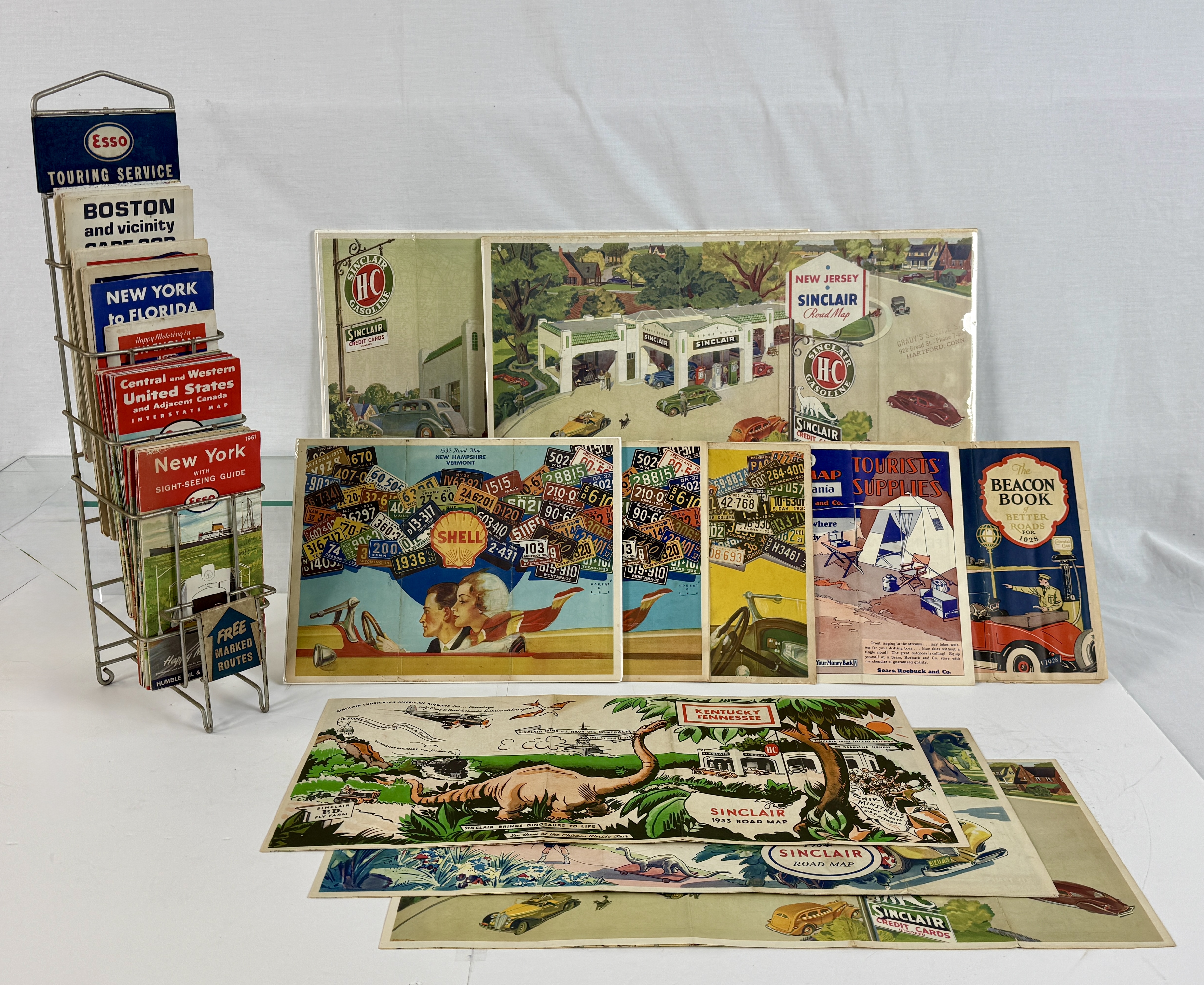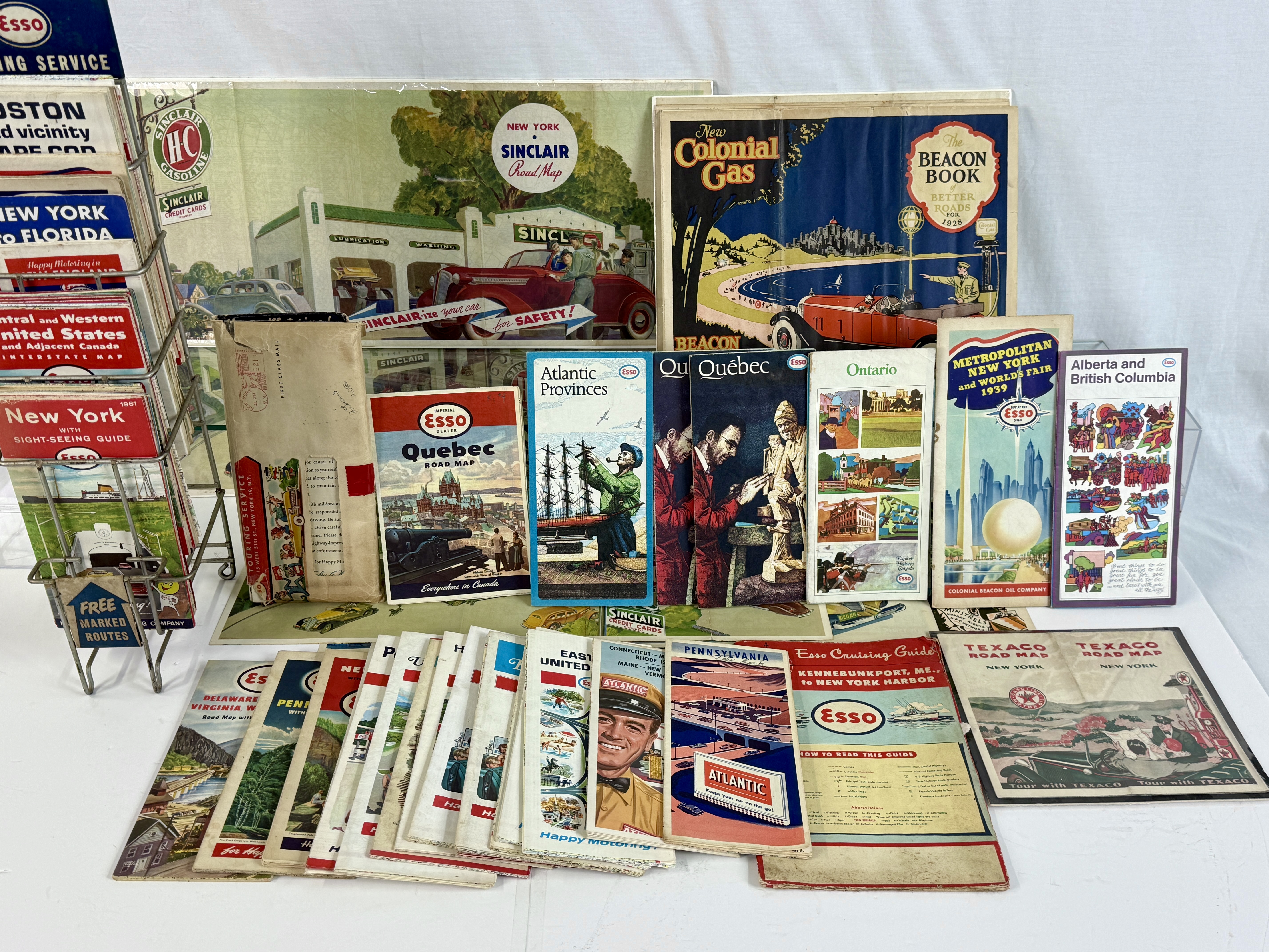 A large assortment of multi-colored vintage road maps and travel ephemera from brands including Esso, Sinclair, Shell, Texaco, and Atlantic, accompanied by a metal Esso Touring Service display rack C5-8.