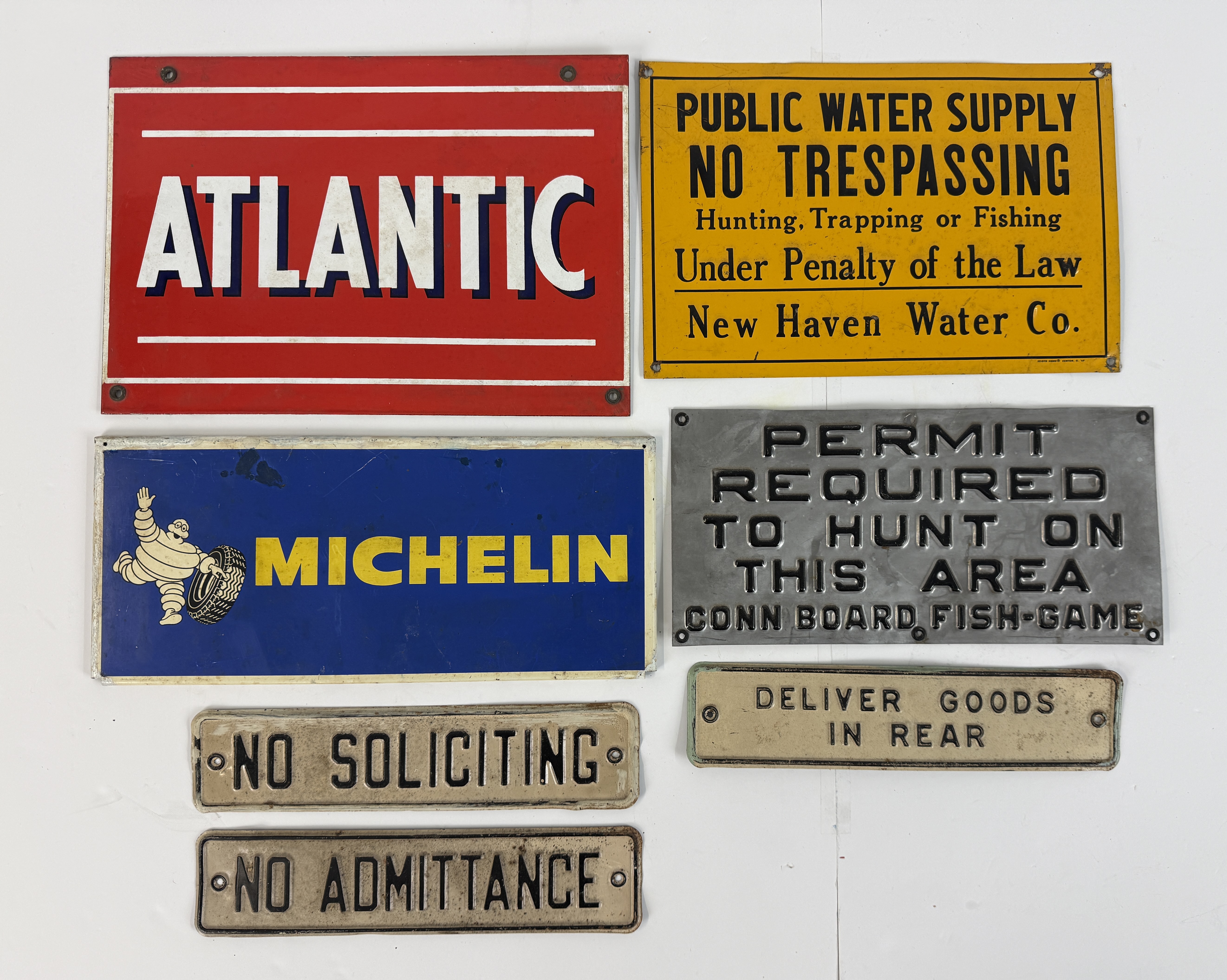 A collection of vintage metal signs featuring porcelain Atlantic and Michelin advertising plates along with embossed utility and public notice signs C5-8..