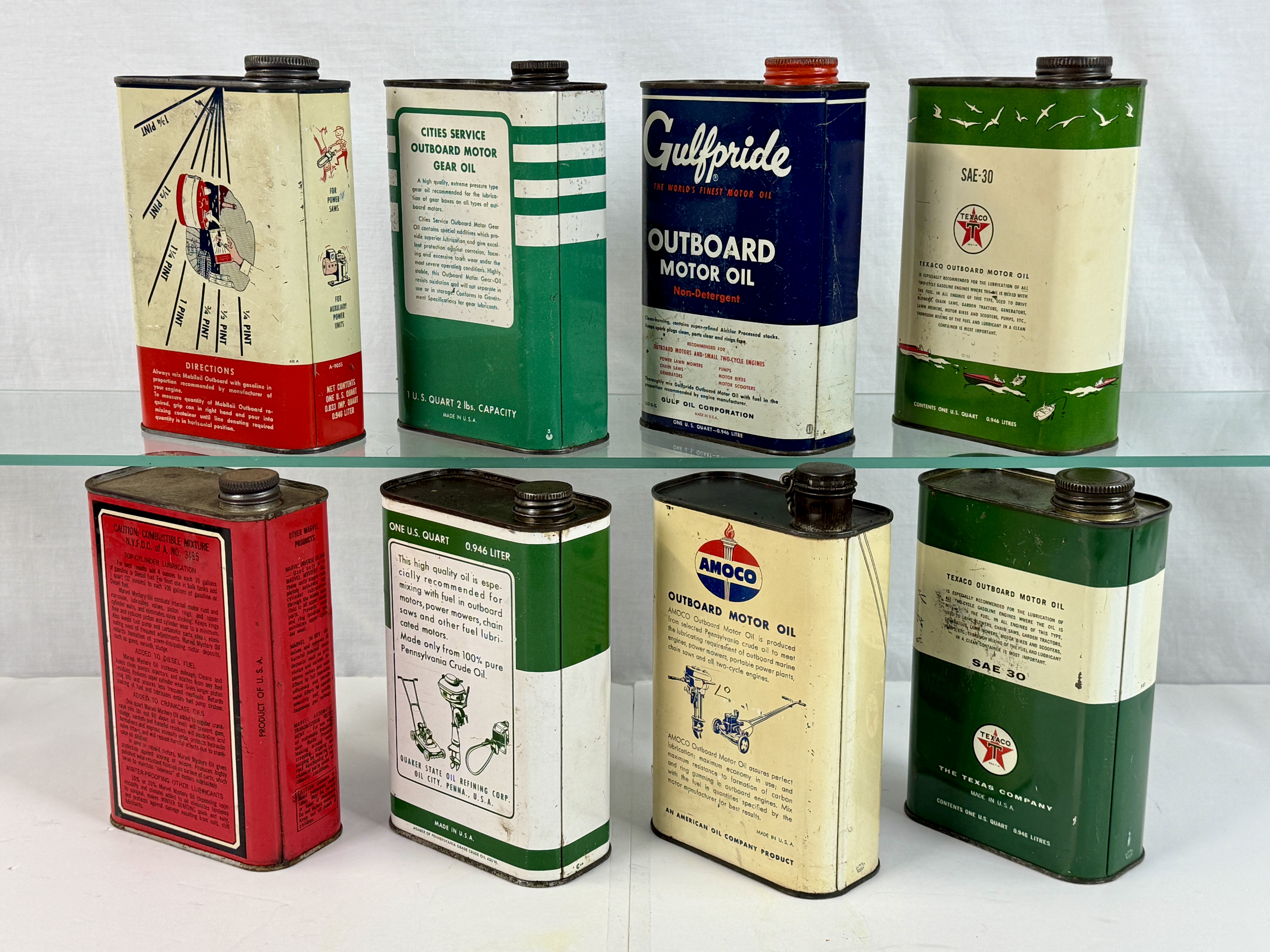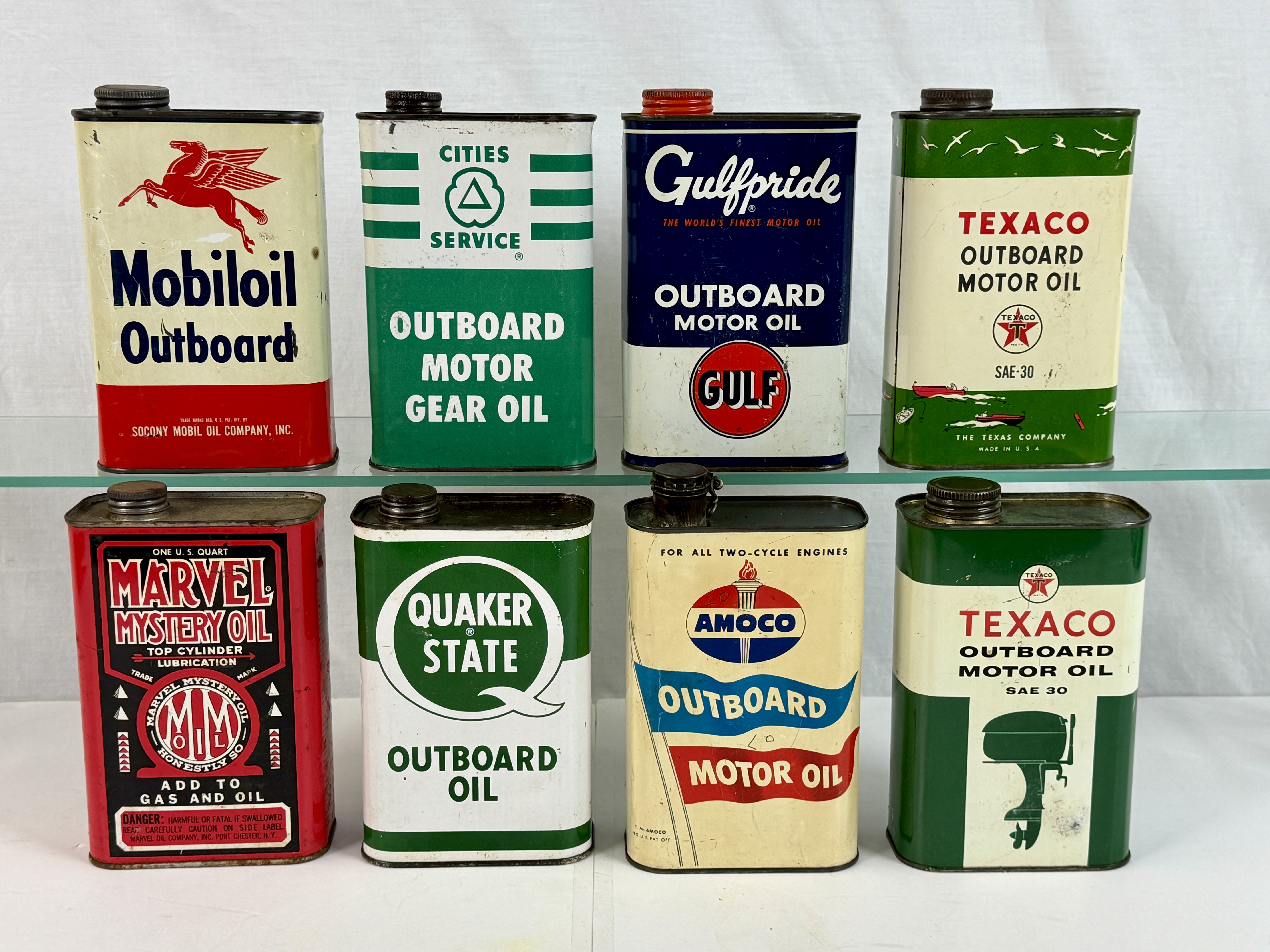 A collection of vintage metal one-quart outboard motor and gear oil cans featuring branding for Mobiloil, Cities Service, Gulfpride, Texaco, Marvel Mystery Oil, Quaker State, and Amoco C5-7.