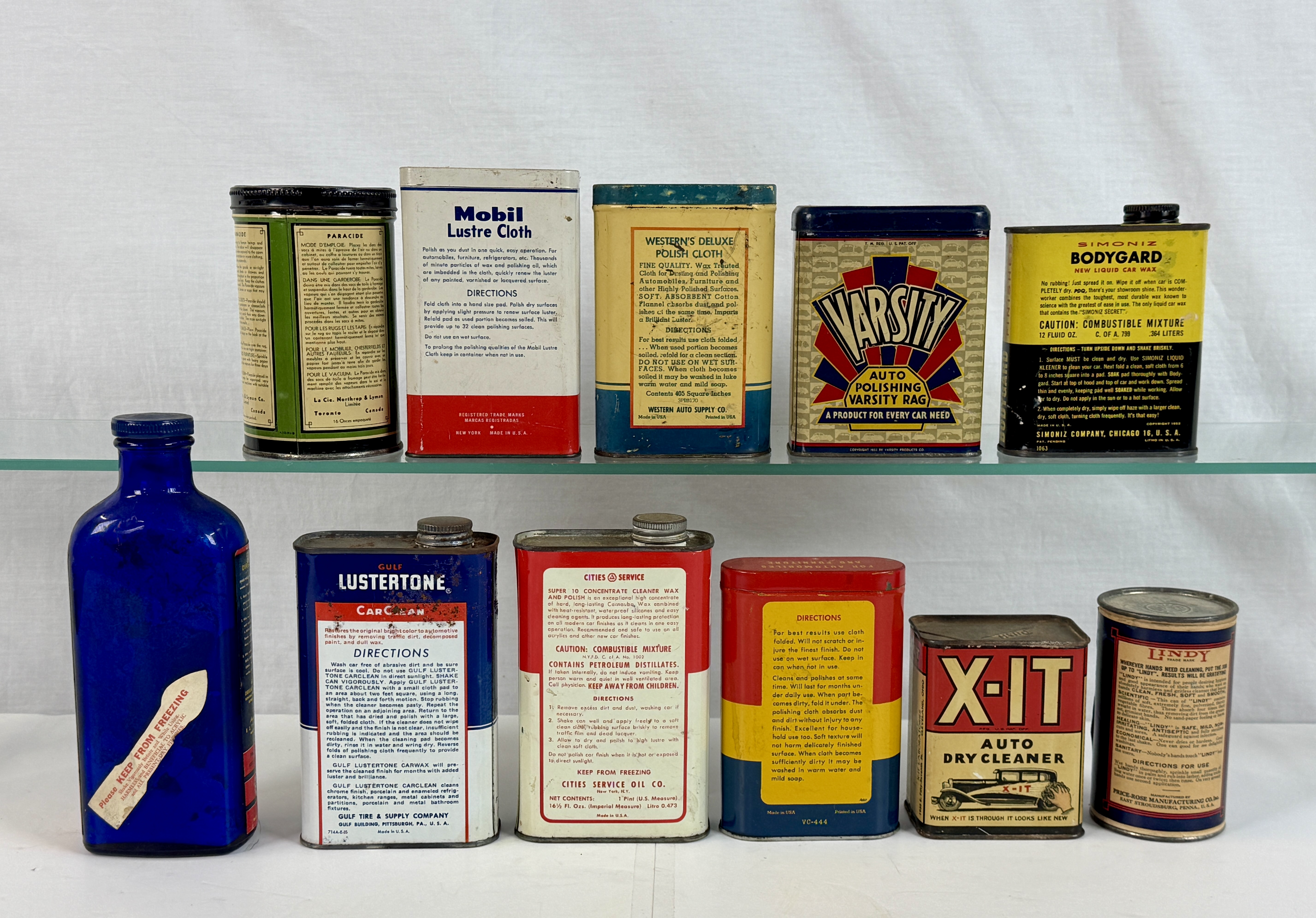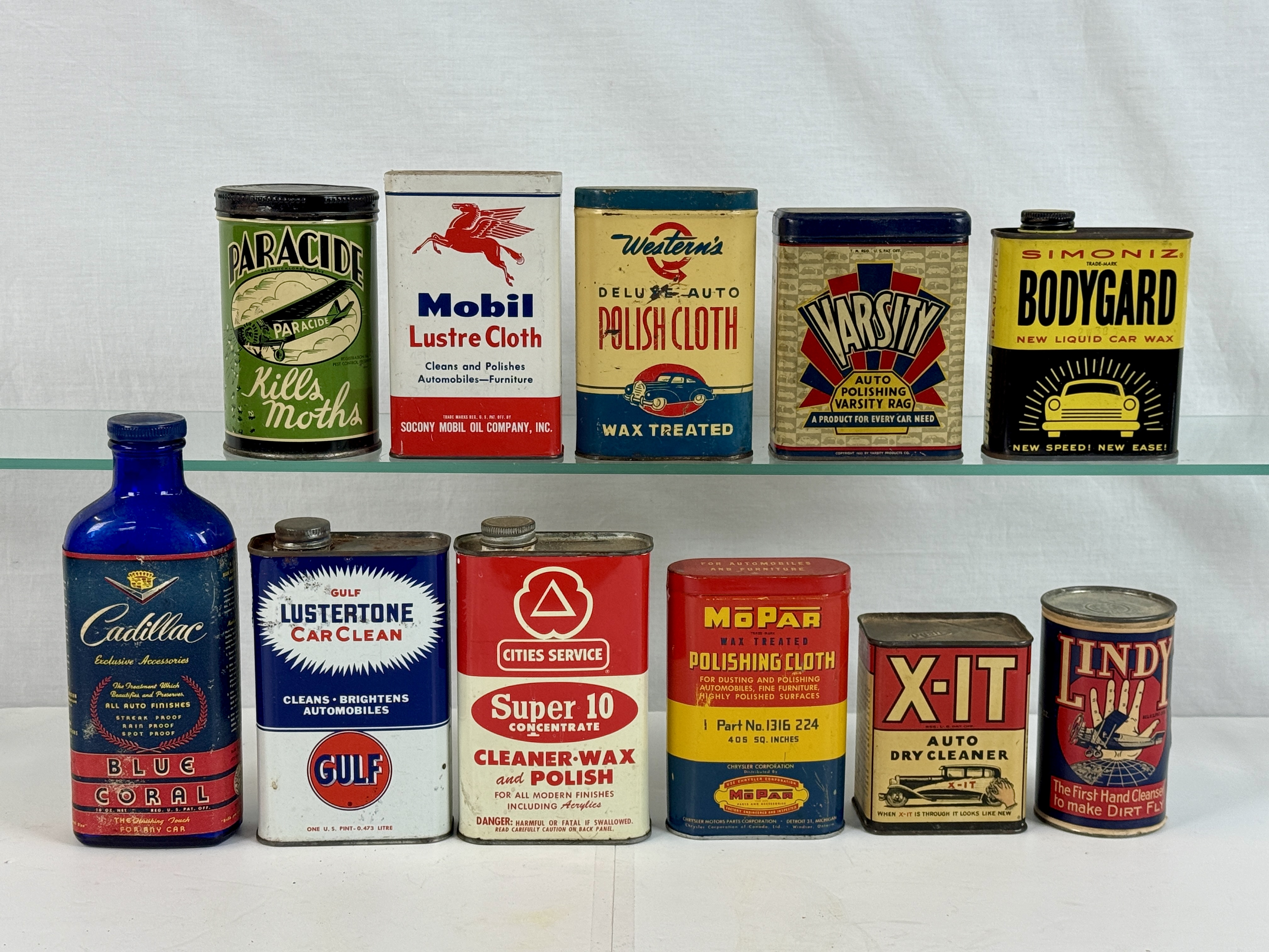 A collection of vintage automotive and household maintenance containers including a cobalt blue Cadillac Blue Coral bottle and various tins from brands such as Mobil, Gulf, Simoniz, and MoPar C 5-8.