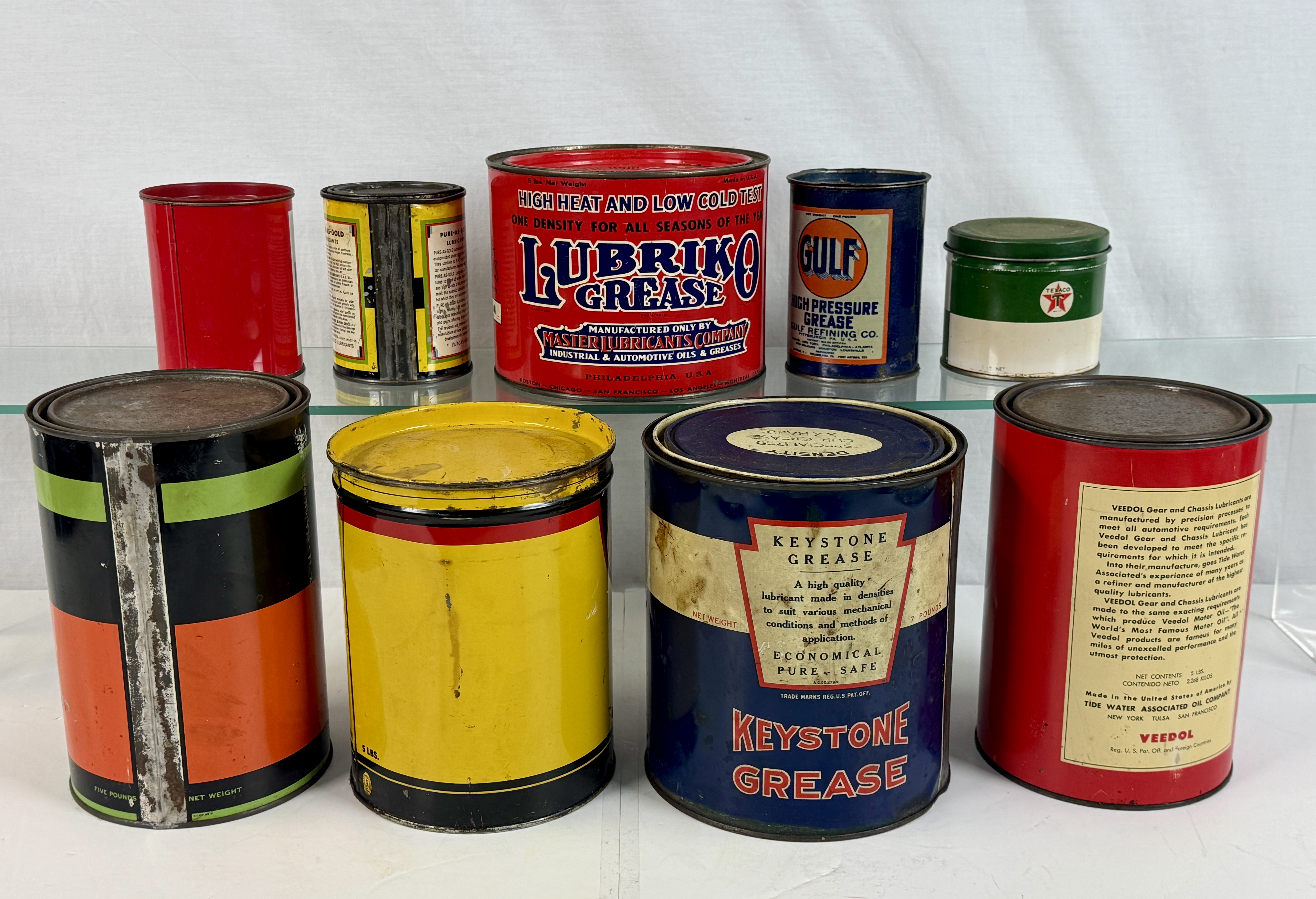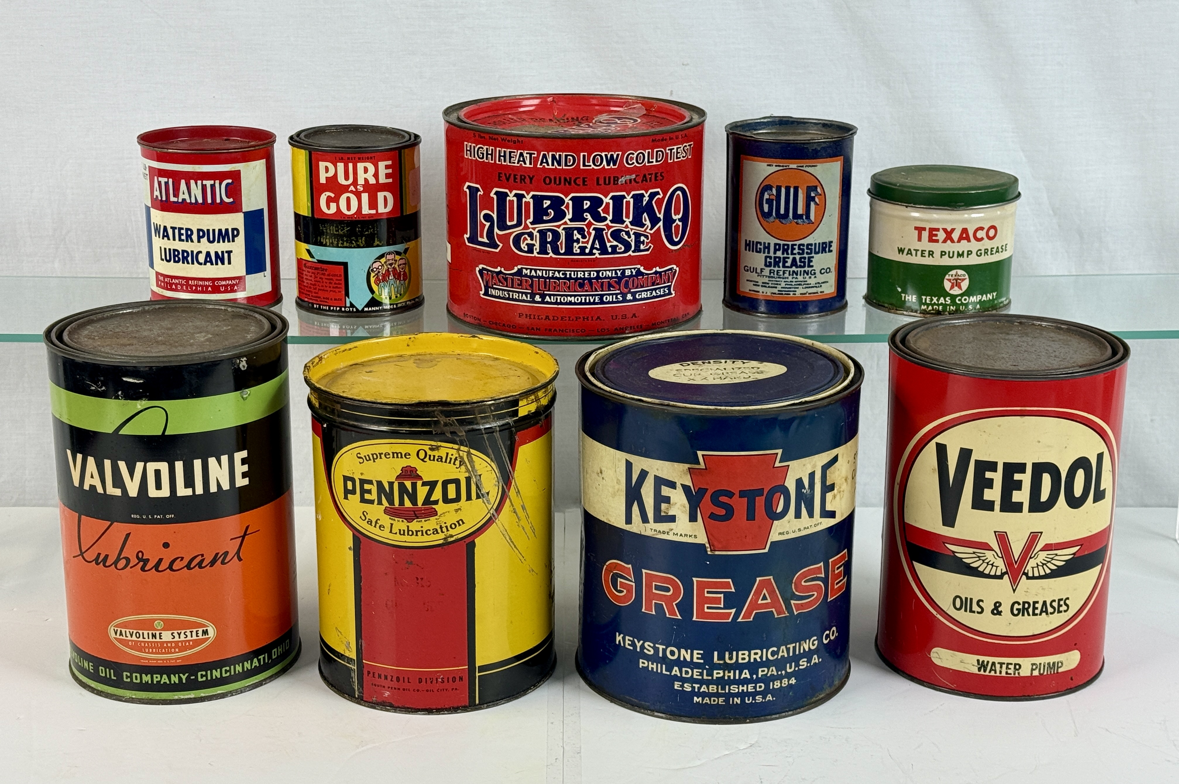A collection of multi-colored vintage metal grease and lubricant cans featuring brands such as Atlantic, Pure as Gold, Lubriko, Gulf, Texaco, Valvoline, Pennzoil, Keystone, and Veedol C6-8.
