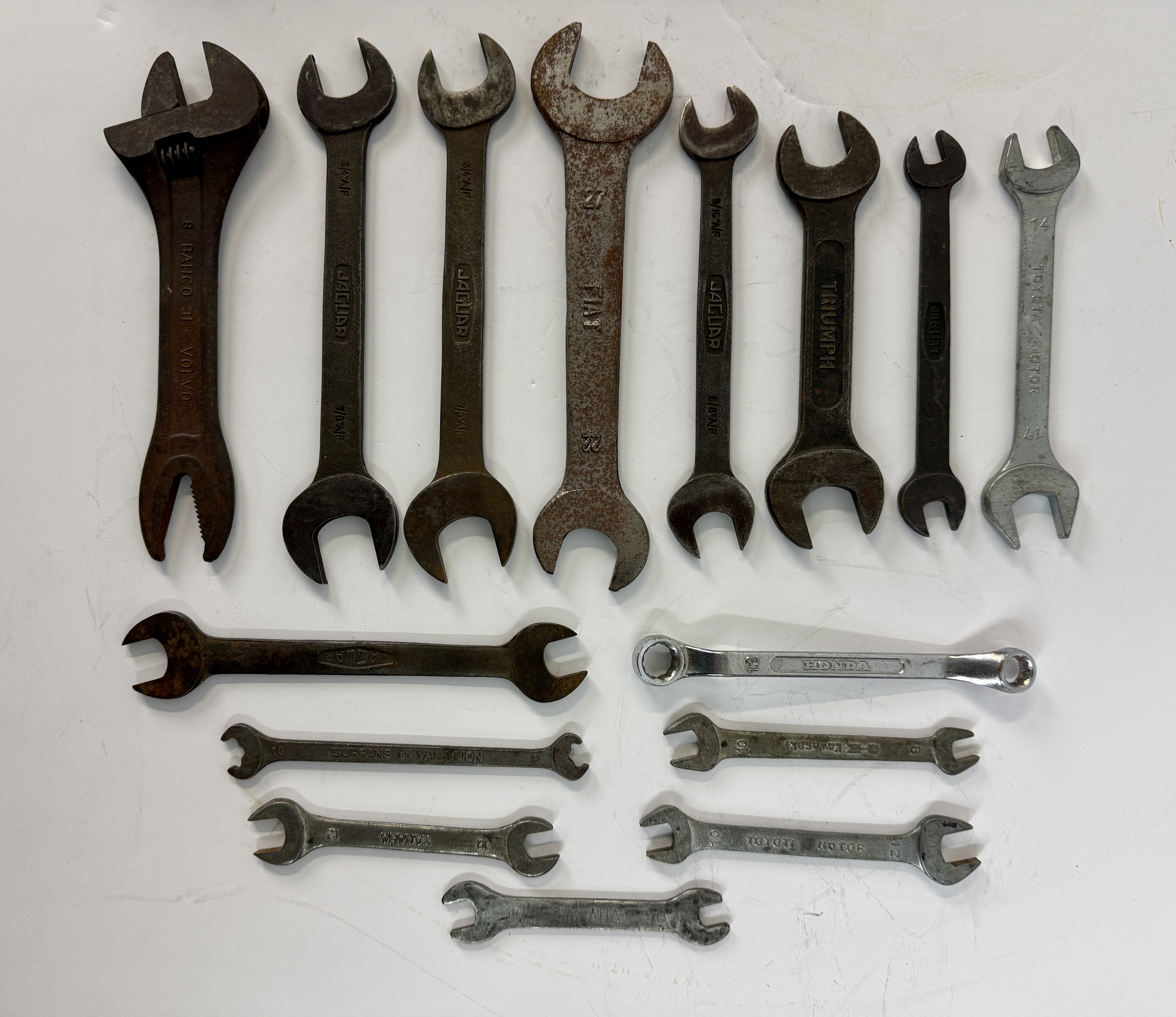 A collection of metal wrenches in various sizes and finishes featuring markings from brands including Jaguar, Fiat, Triumph, Toyota Motor, and Honda C5-8.