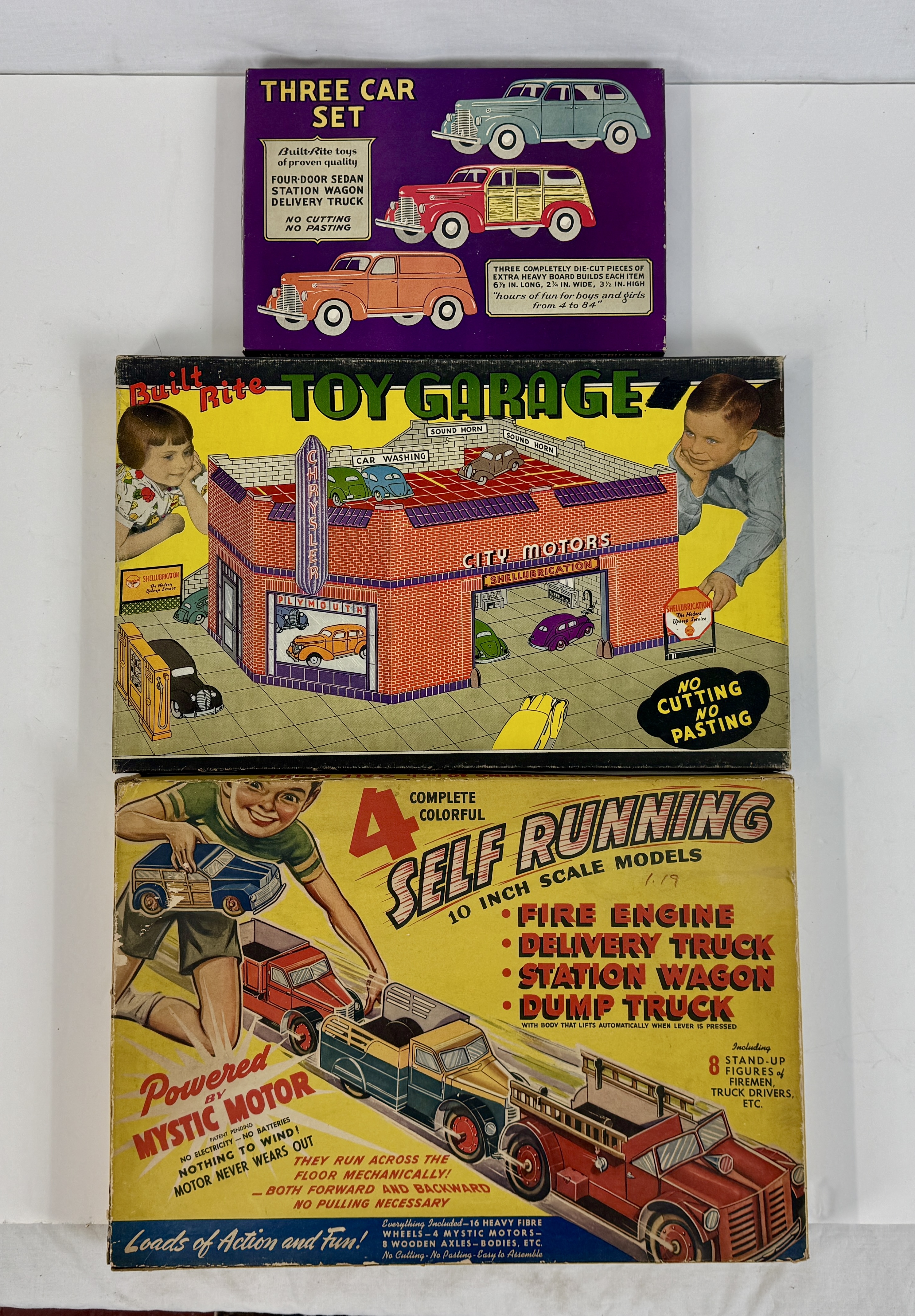 Two sealed vintage Built-Rite cardboard toy sets including a Three Car Set, a Toy Garage with Shellubrication branding, and a set of four self-running 10-inch scale models C 6-10
