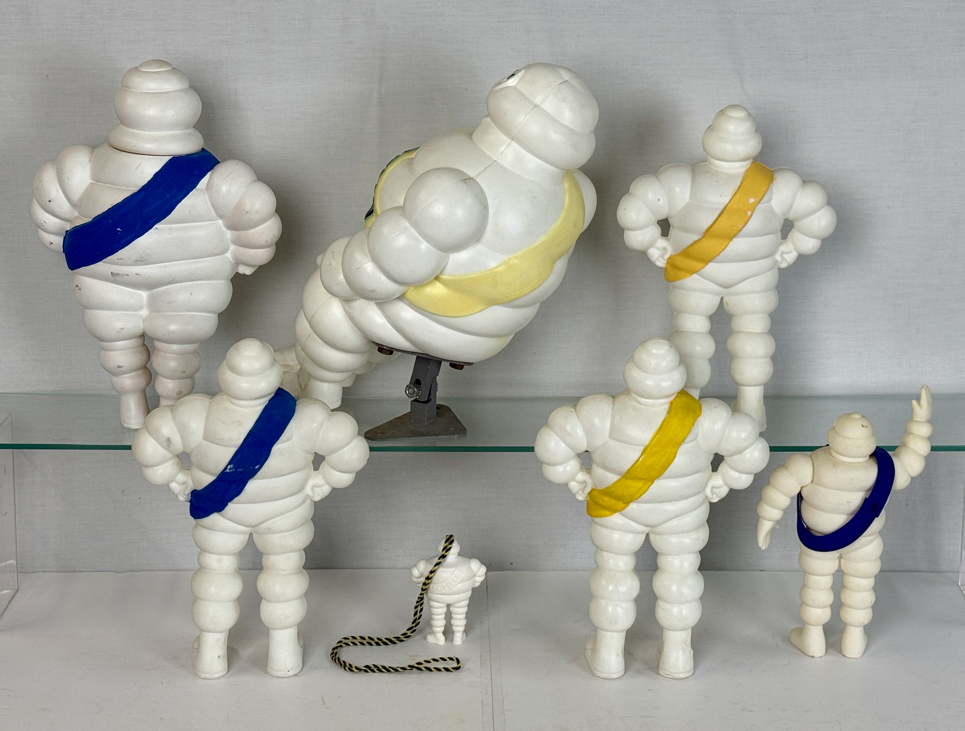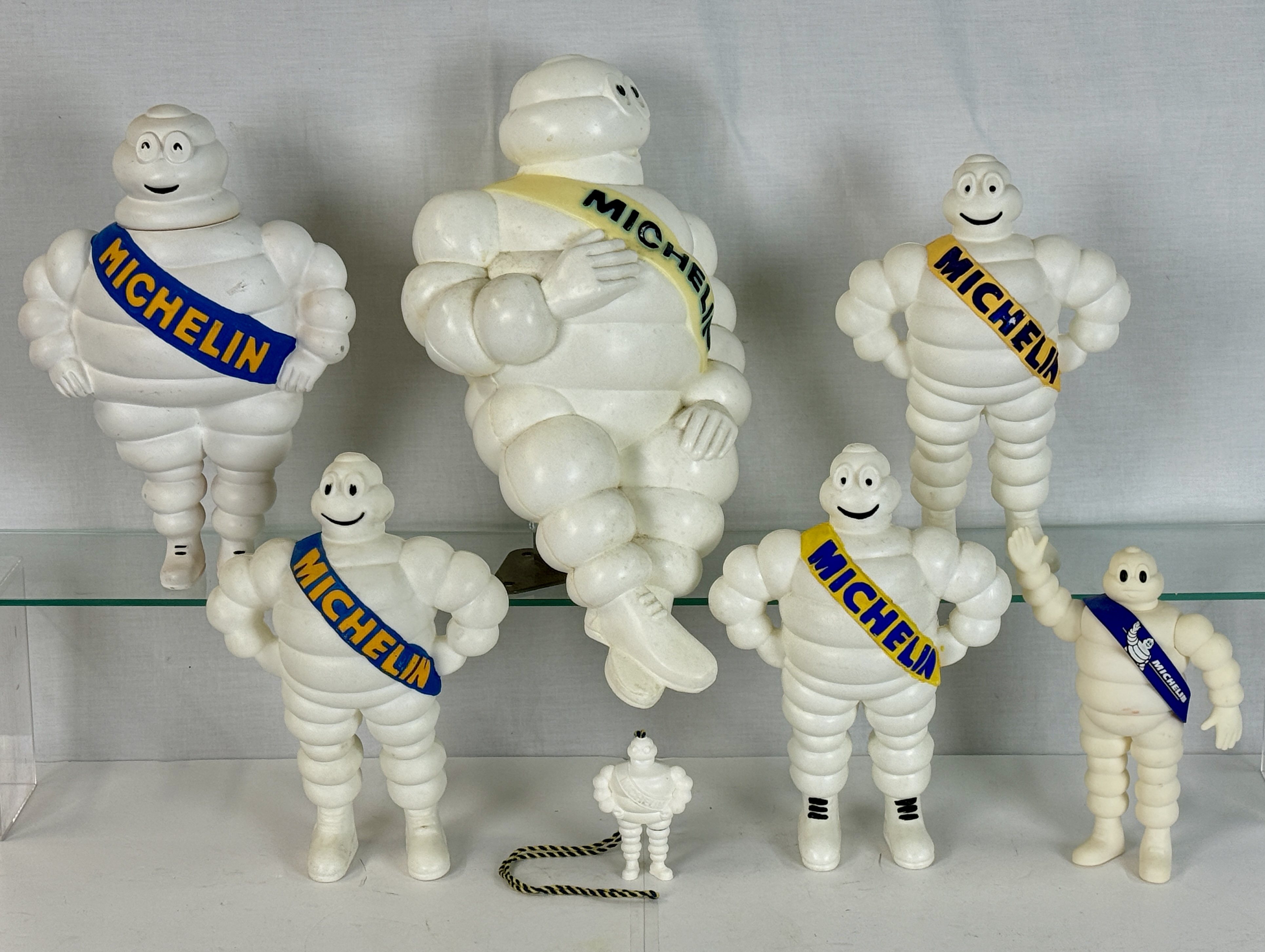 A collection of white Michelin Man advertising figures in various sizes and poses, most featuring blue or yellow sashes labeled Michelin C6-9.