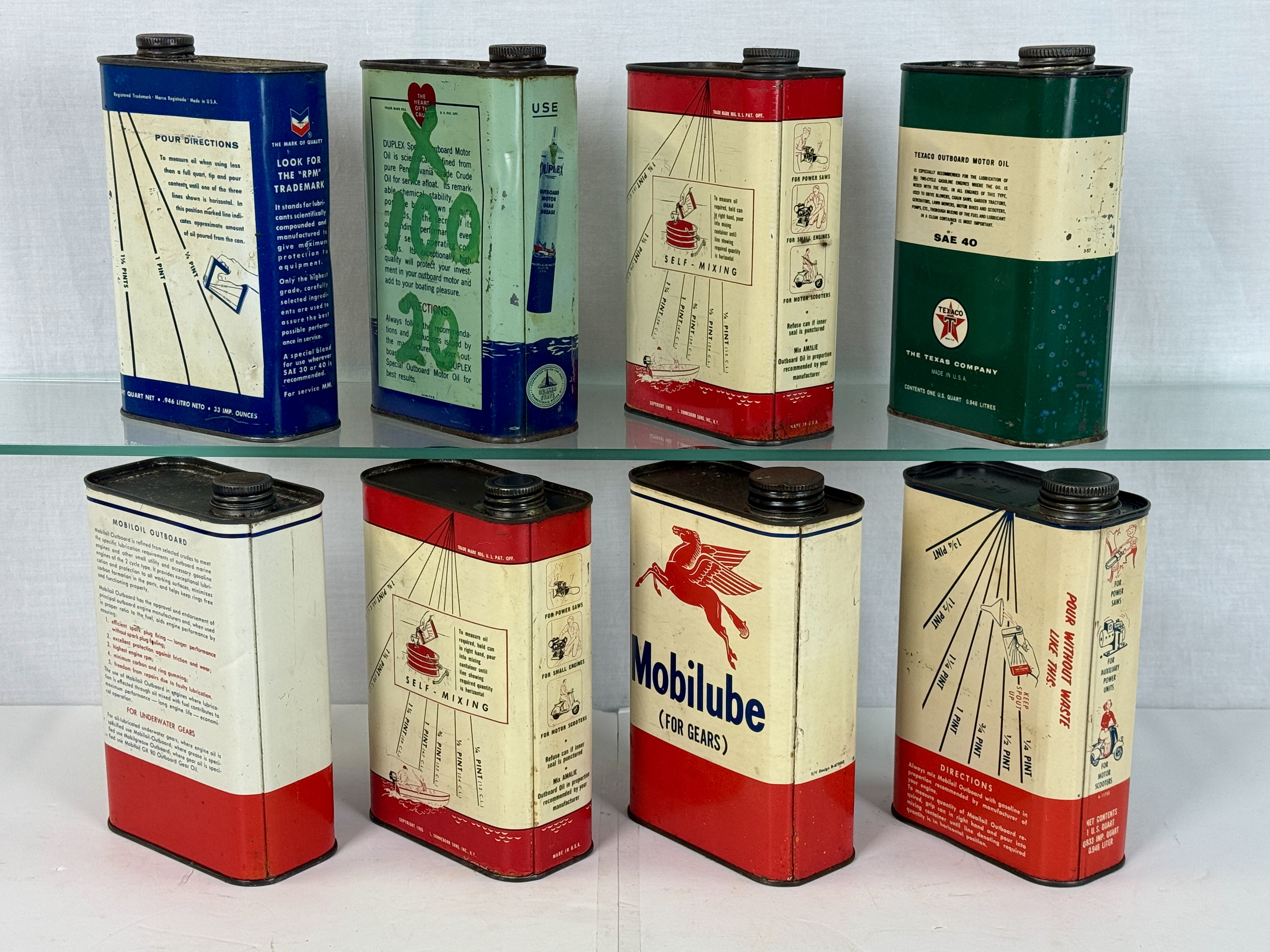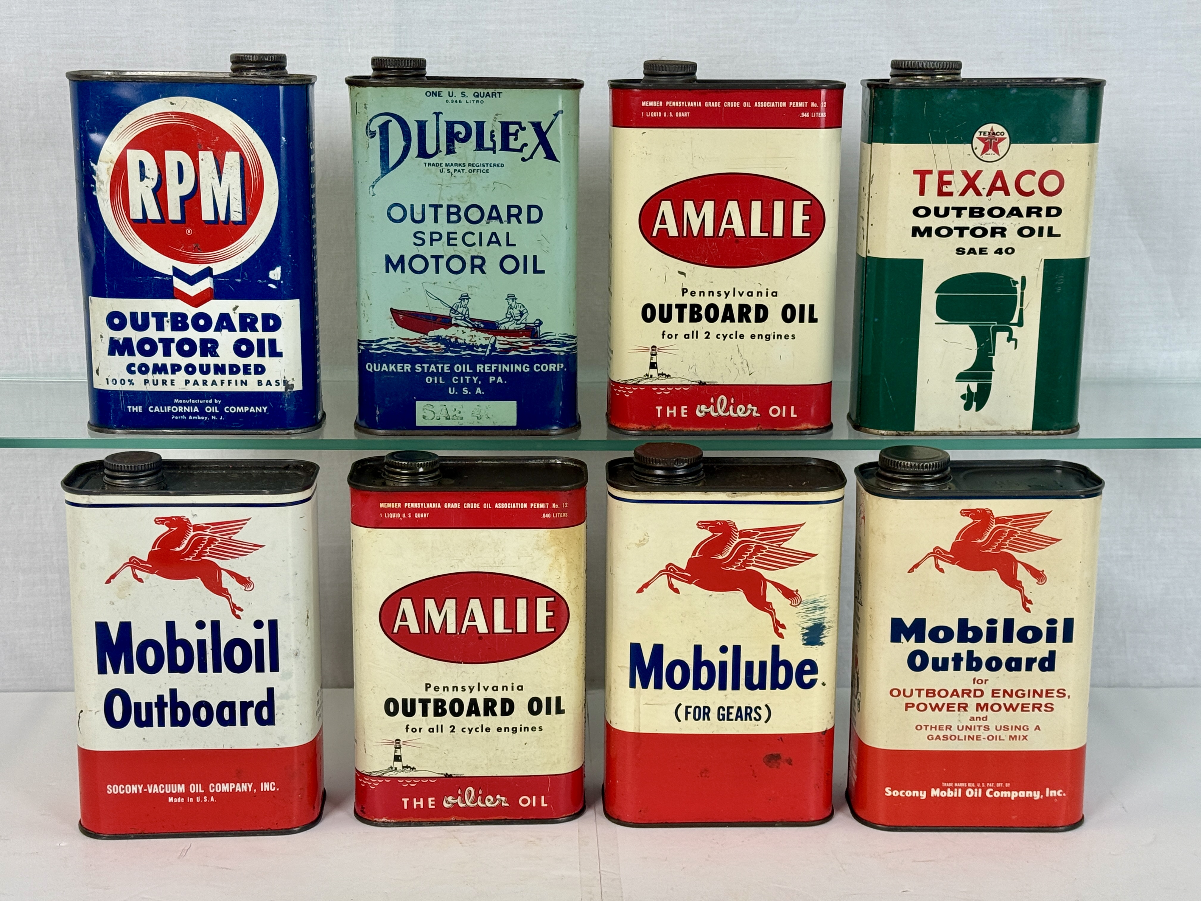 A collection of vintage metal outboard motor oil and lubricant cans featuring brands including RPM, Duplex, Amalie, Texaco, Mobiloil, and Mobilube C6-8.