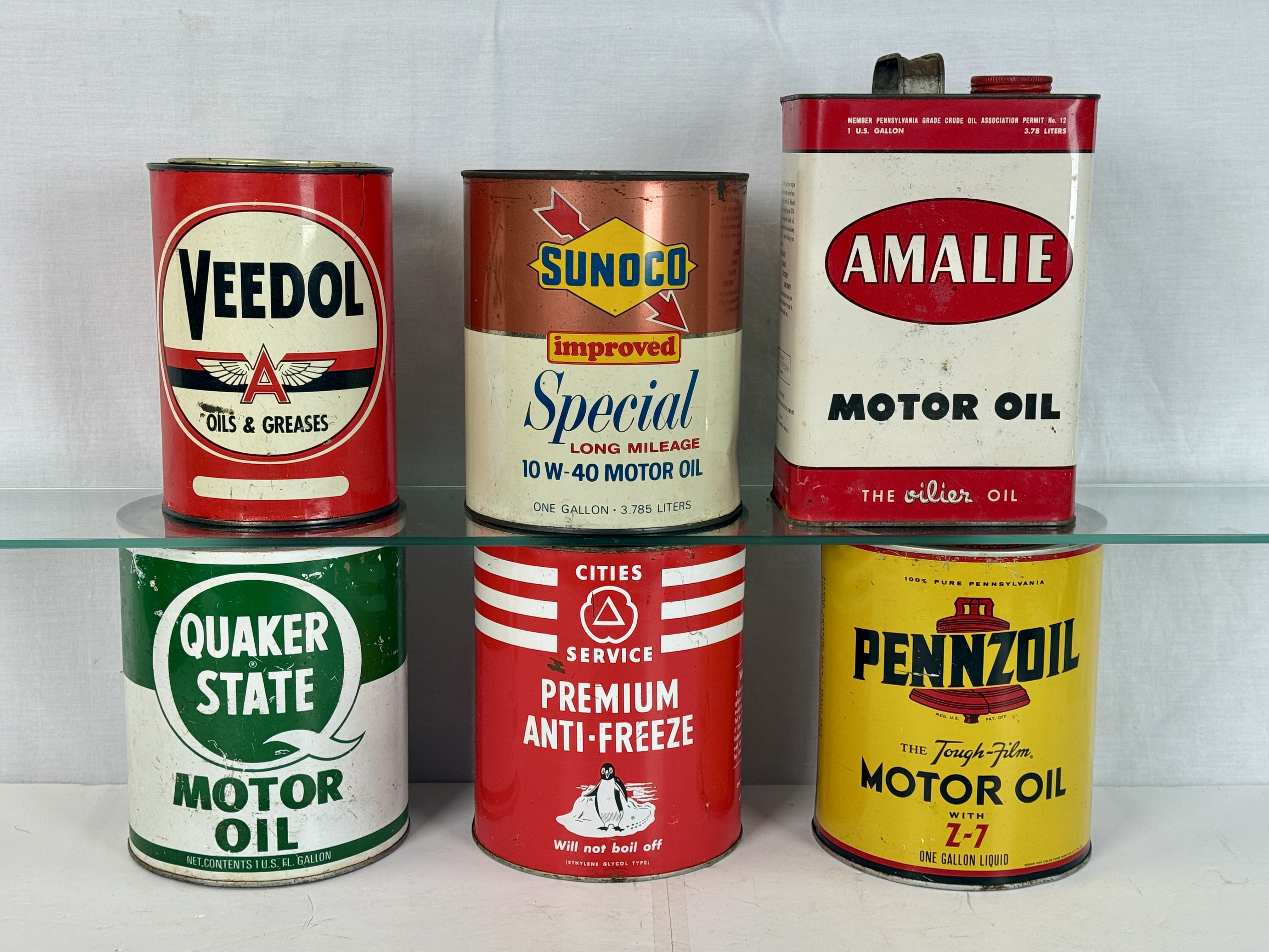 A collection of vintage metal automotive product cans including Veedol Oils & Greases, Sunoco Improved Special Motor Oil, Amalie Motor Oil, Quaker State Motor Oil, Cities Service Premium Anti-Freeze, and Pennzoil Motor Oil, C6-8.