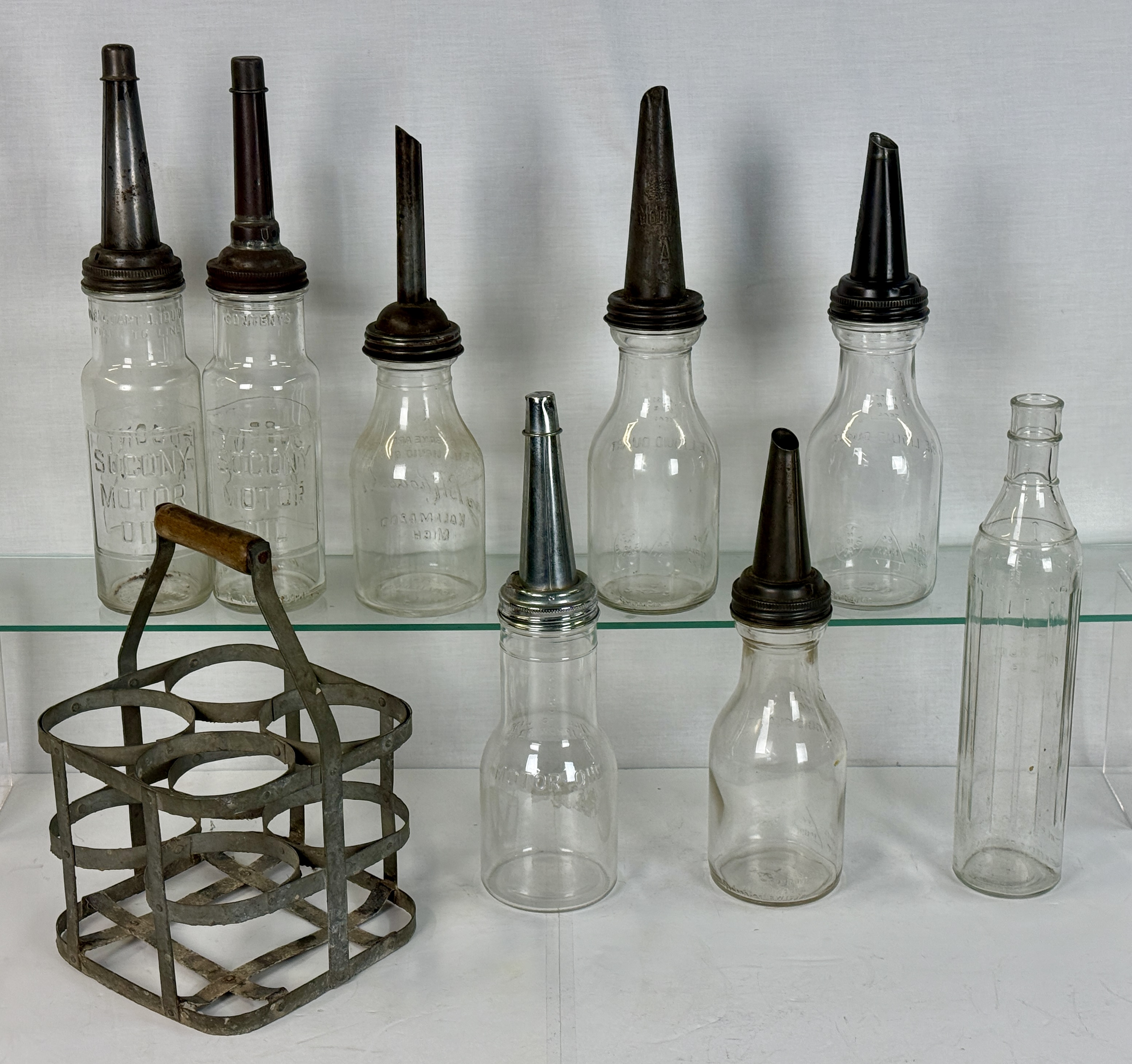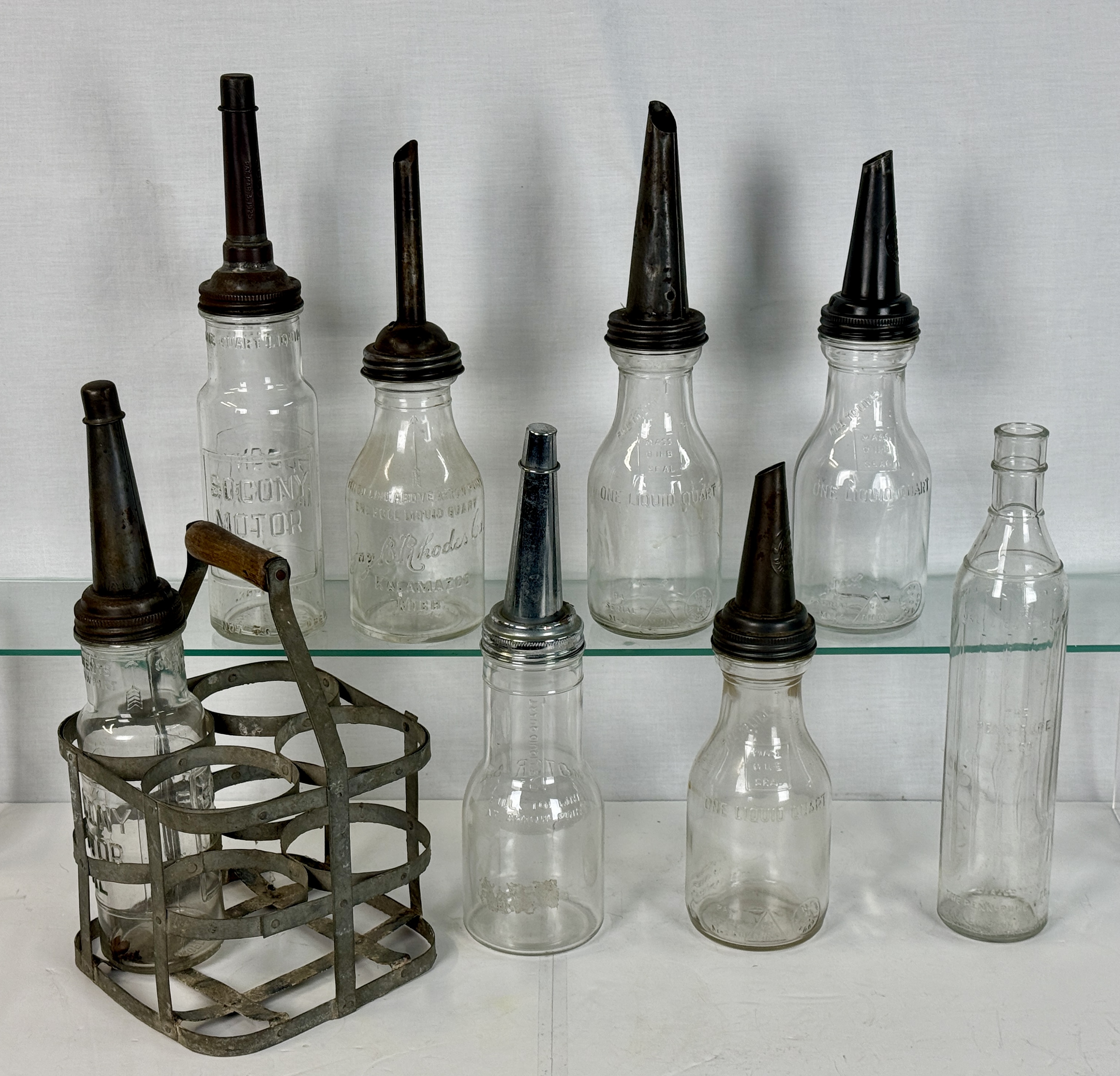 A collection of clear glass quart oil bottles featuring embossed text including Socony Motor Oil and J.B. Rhodes Co., accompanied by various metal spouts and a metal carrying rack with a wood handle, C7-9.