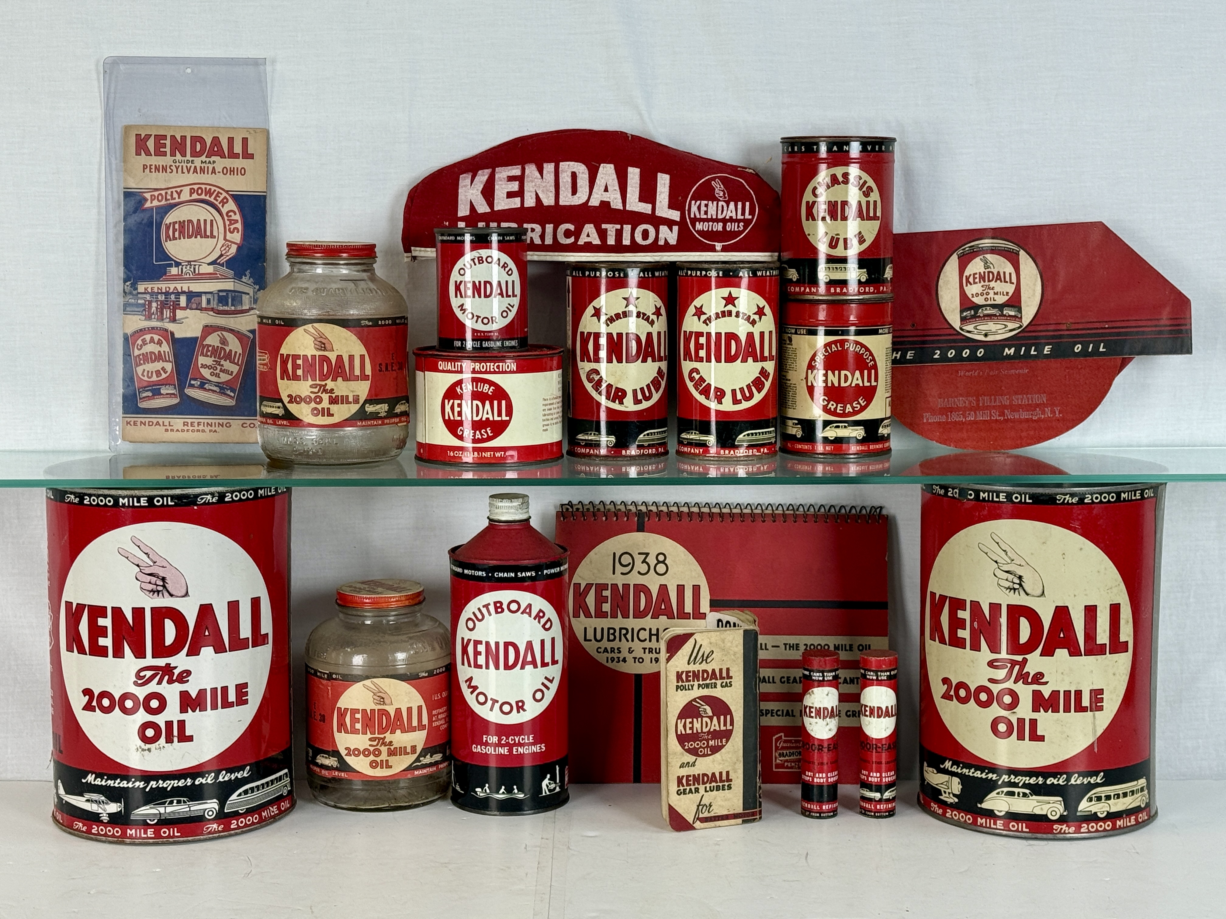 A collection of vintage Kendall Motor Oil advertising items and product containers including metal cans, glass jars, and a 1938 Lubrichart featuring the Bradford, Pennsylvania brand’s signature graphics C6-8.