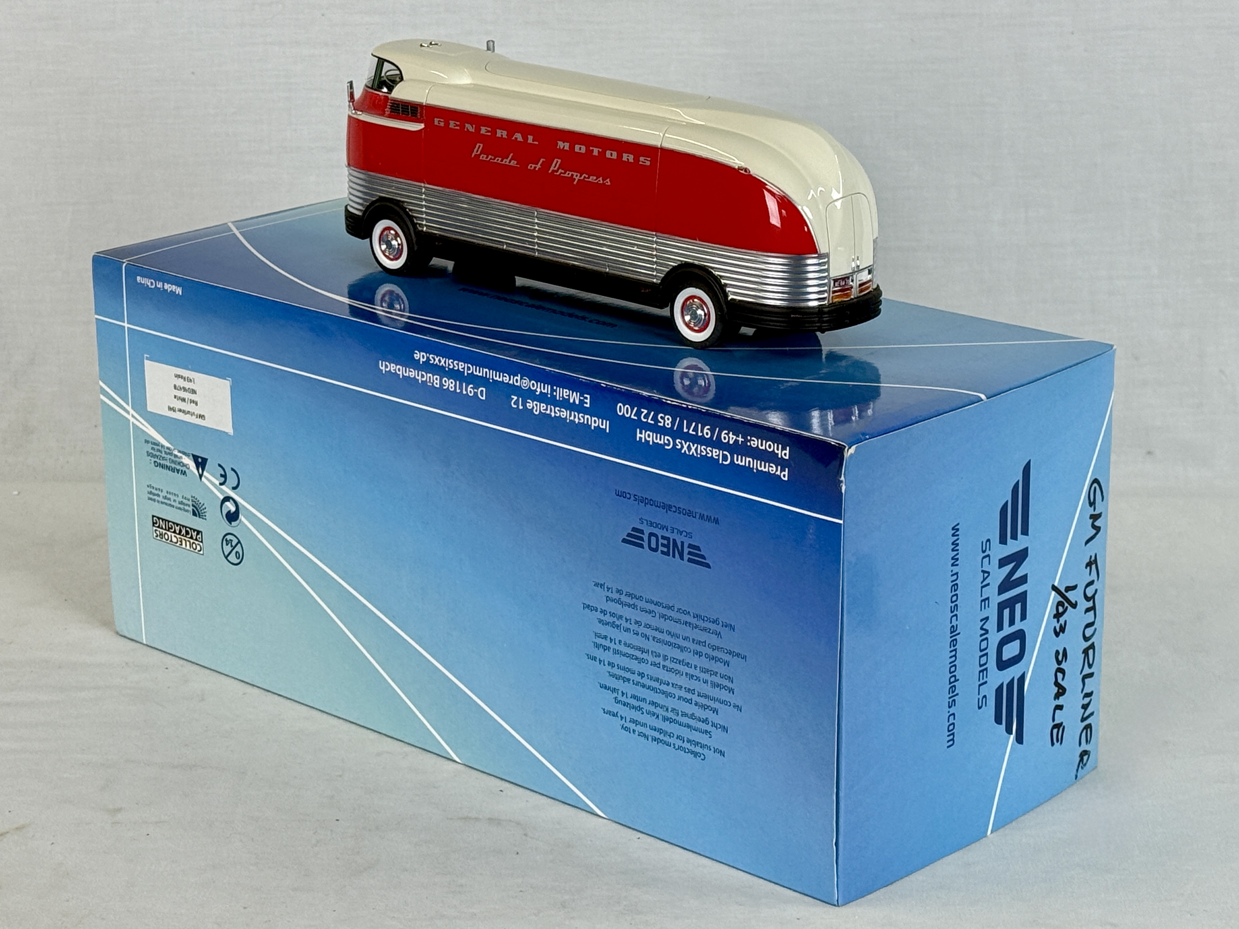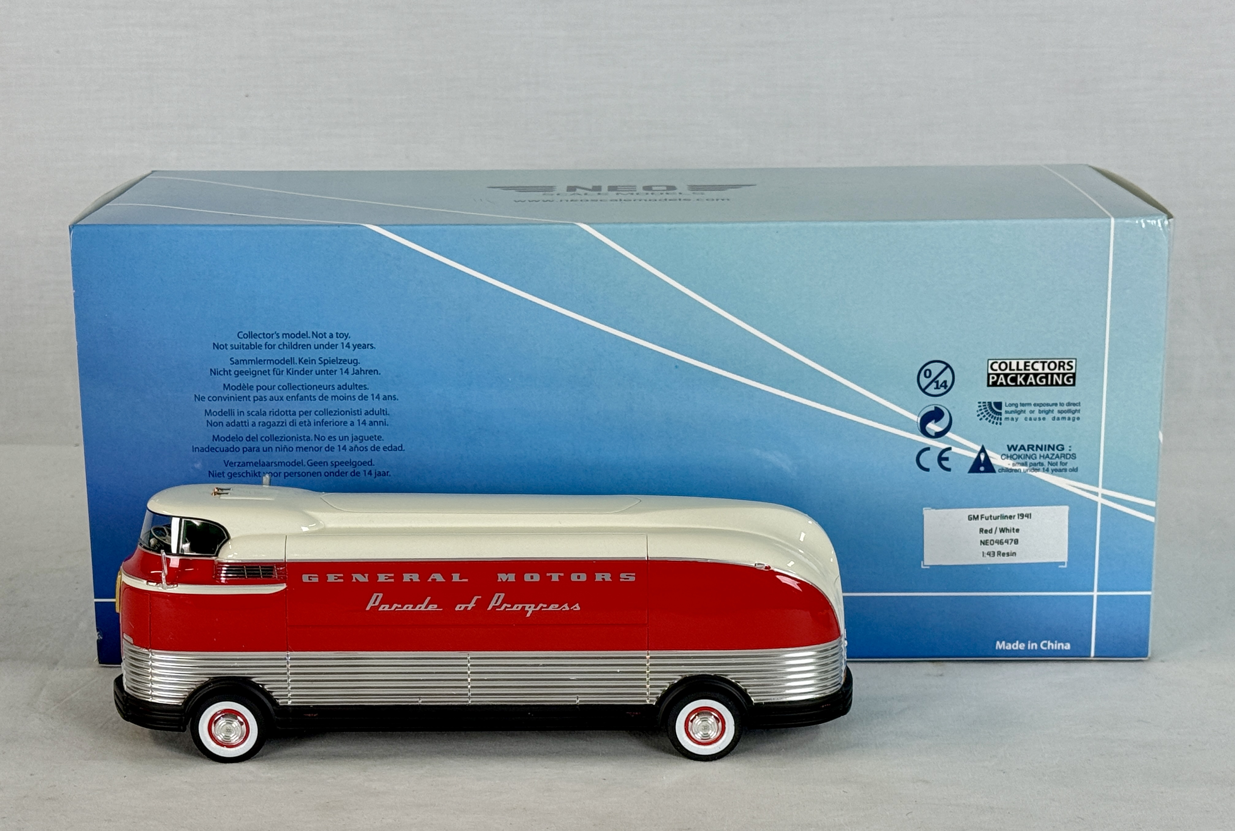 A red, white, and silver 1:43 scale resin model of a 1941 GM Futurliner Parade of Progress by NEO Scale Models with its original collector box C9.