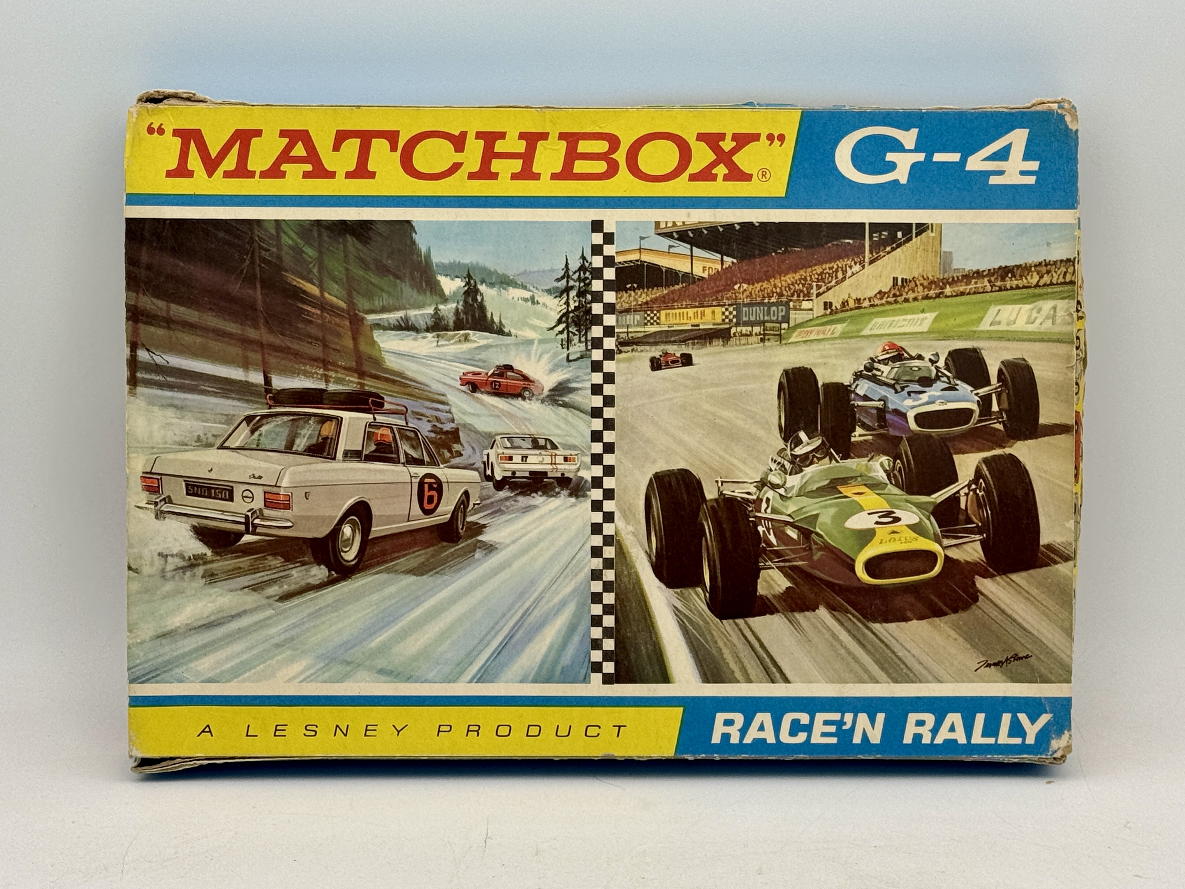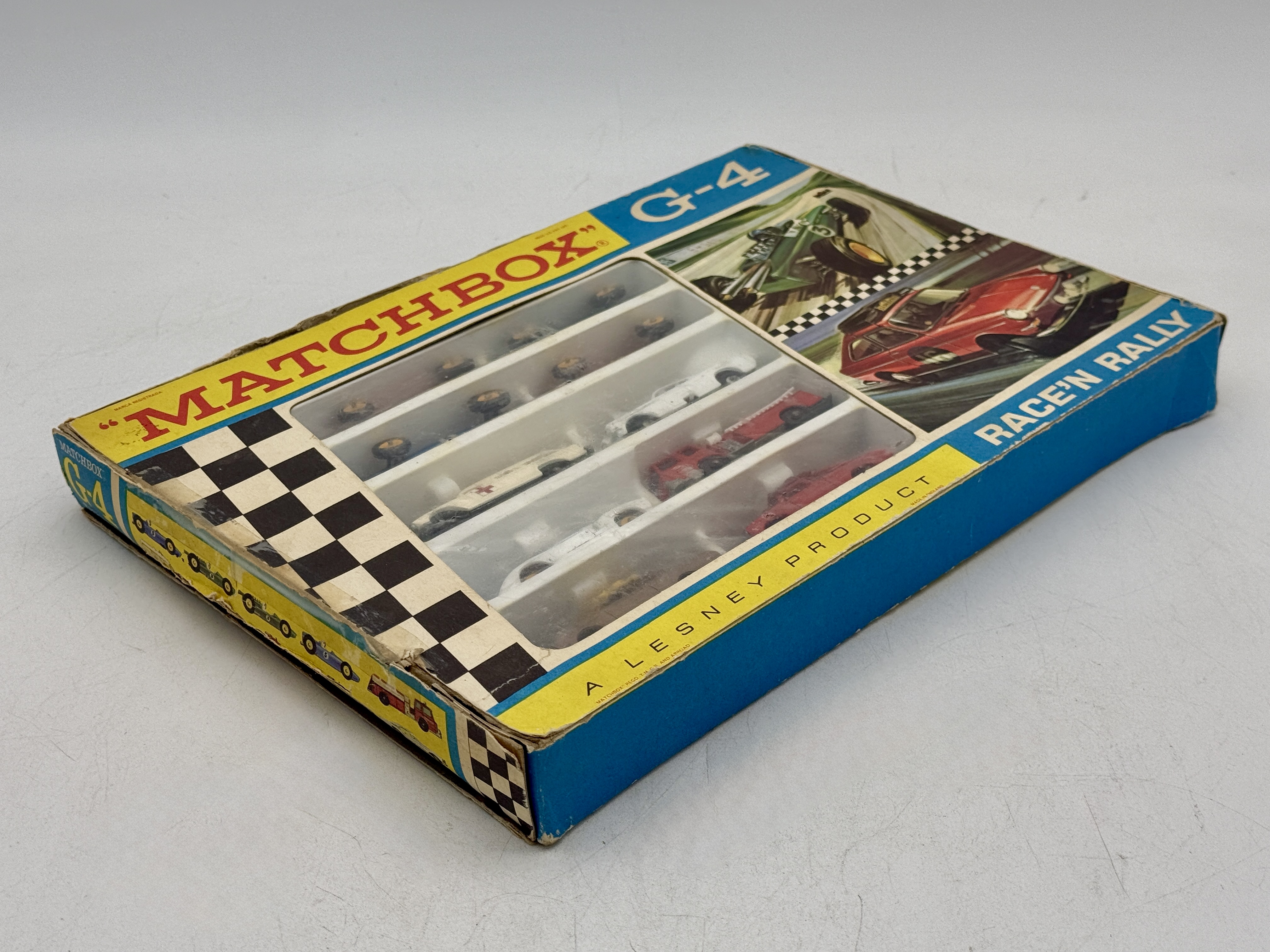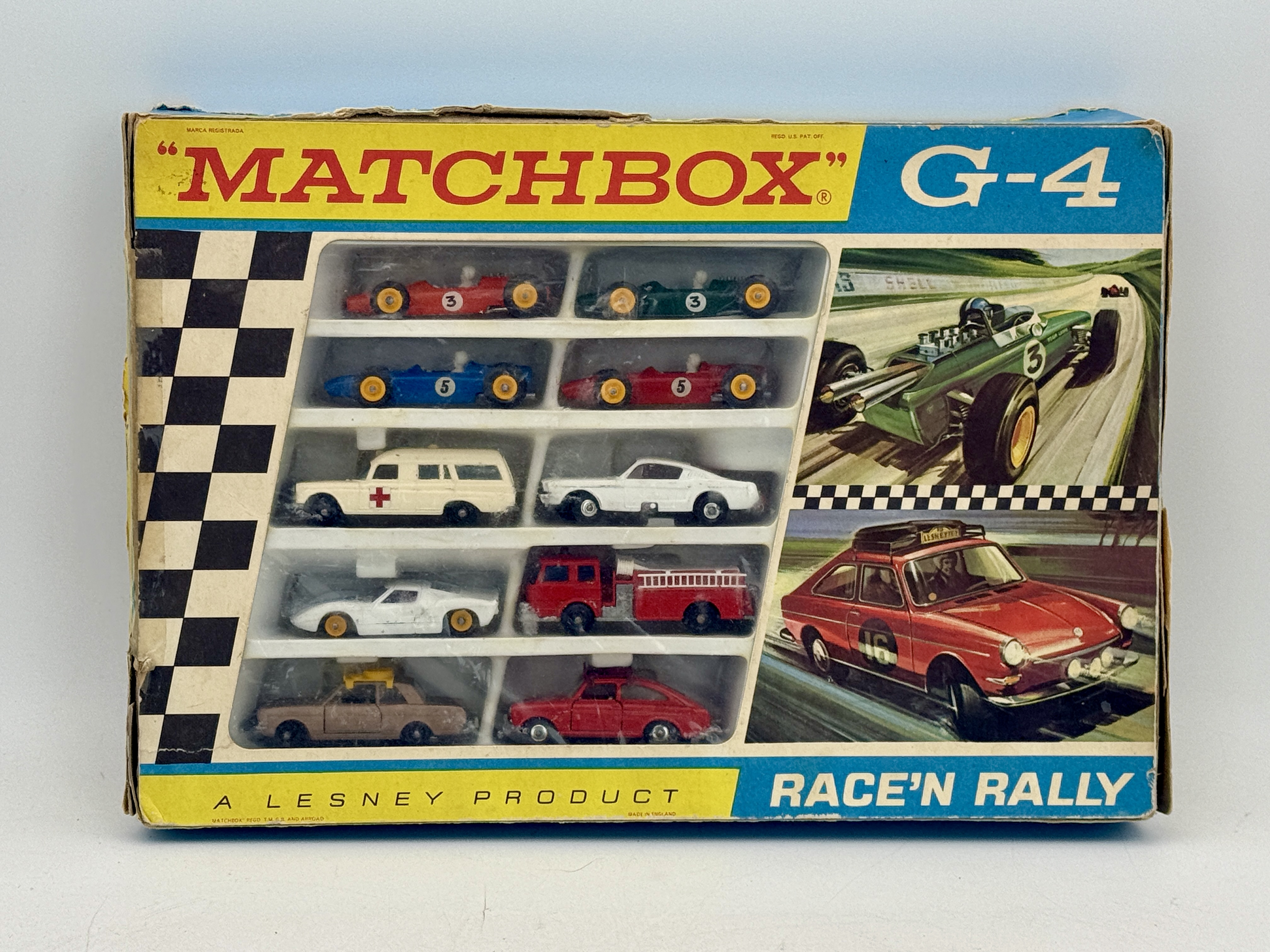 A collection of Matchbox toy vehicles in a G-4 Race’n Rally gift set by Lesney, featuring various models in red, white, blue, green, and brown colors within the original 1968 packaging. Contains 8E1 Mustang, 3 C2 ambulance, 19 D1 and 19 D2 lotus, 25 D2 Ford, 29 C2 firetruck, 41 C2 Ford GT, 52 B3 and 52B5BRM, 67B3VW, OB and inserts worn, C5 – 7.