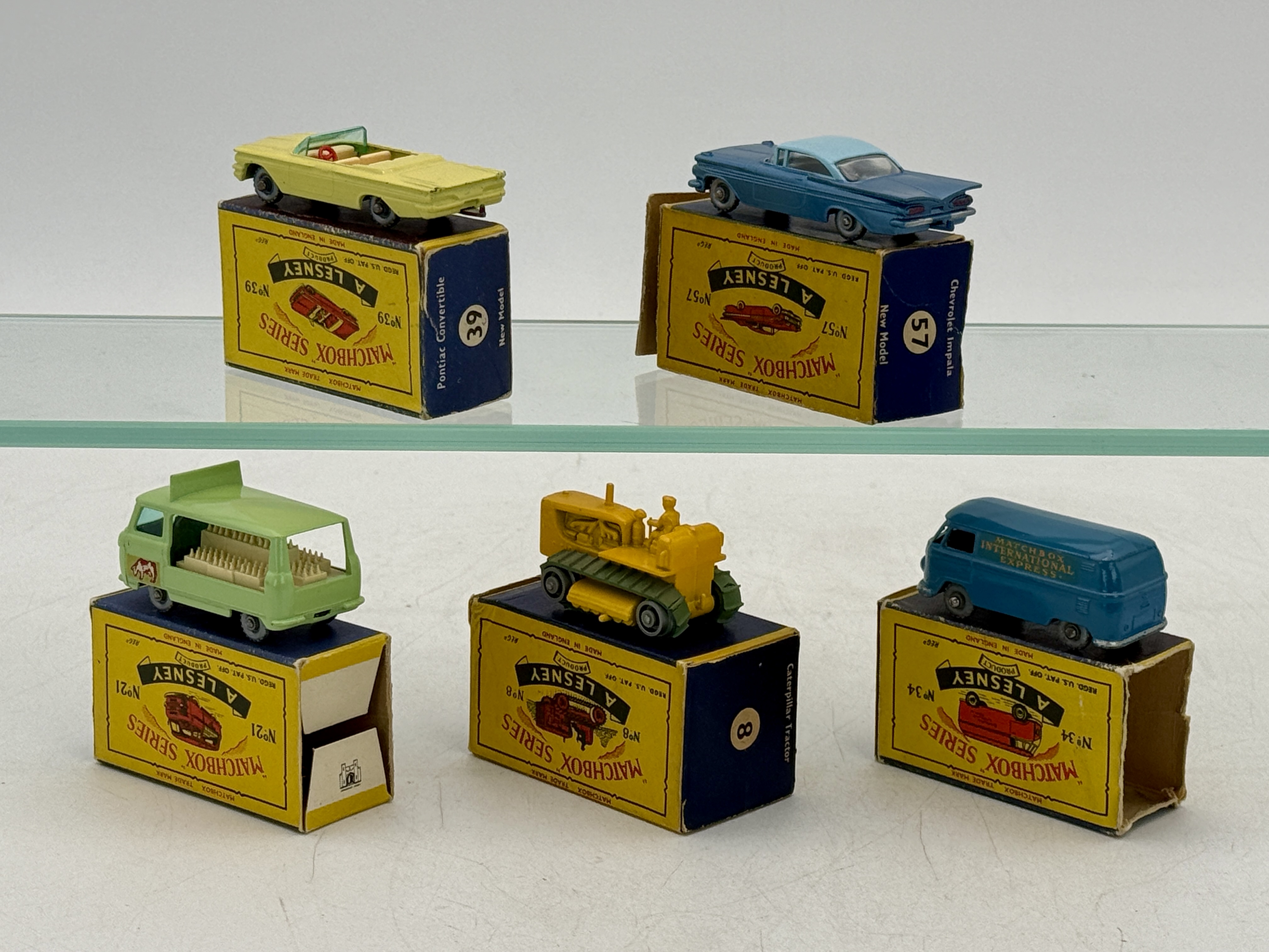 A collection of five vintage multi-colored die-cast vehicles including a No. 39 B3 Pontiac Convertible, No. 57 B3. Chevrolet Impala, No. 21 C5. Milk Delivery Truck, No. 8 C2 Caterpillar Tractor, and a No. 34 A1 Volkswagen Microvan marked Matchbox International Express, all with original boxes. C style boxes, worn two are incomplete, C 8–9.