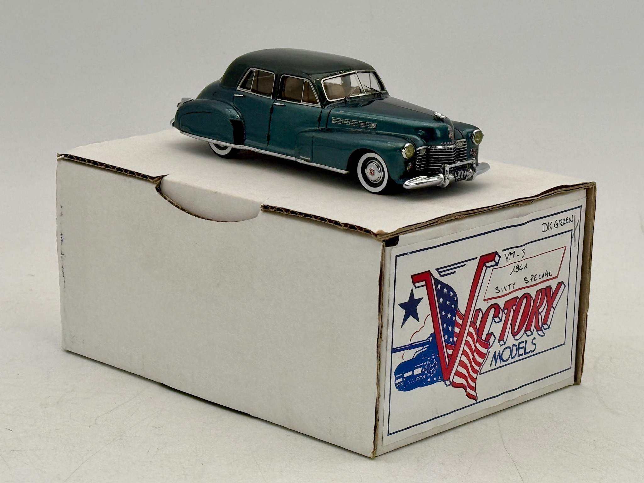 A dark green 1941 Sixty Special model car by Victory Models, special blue/green. Accompanied by its original labeled box. OB and inserts C9