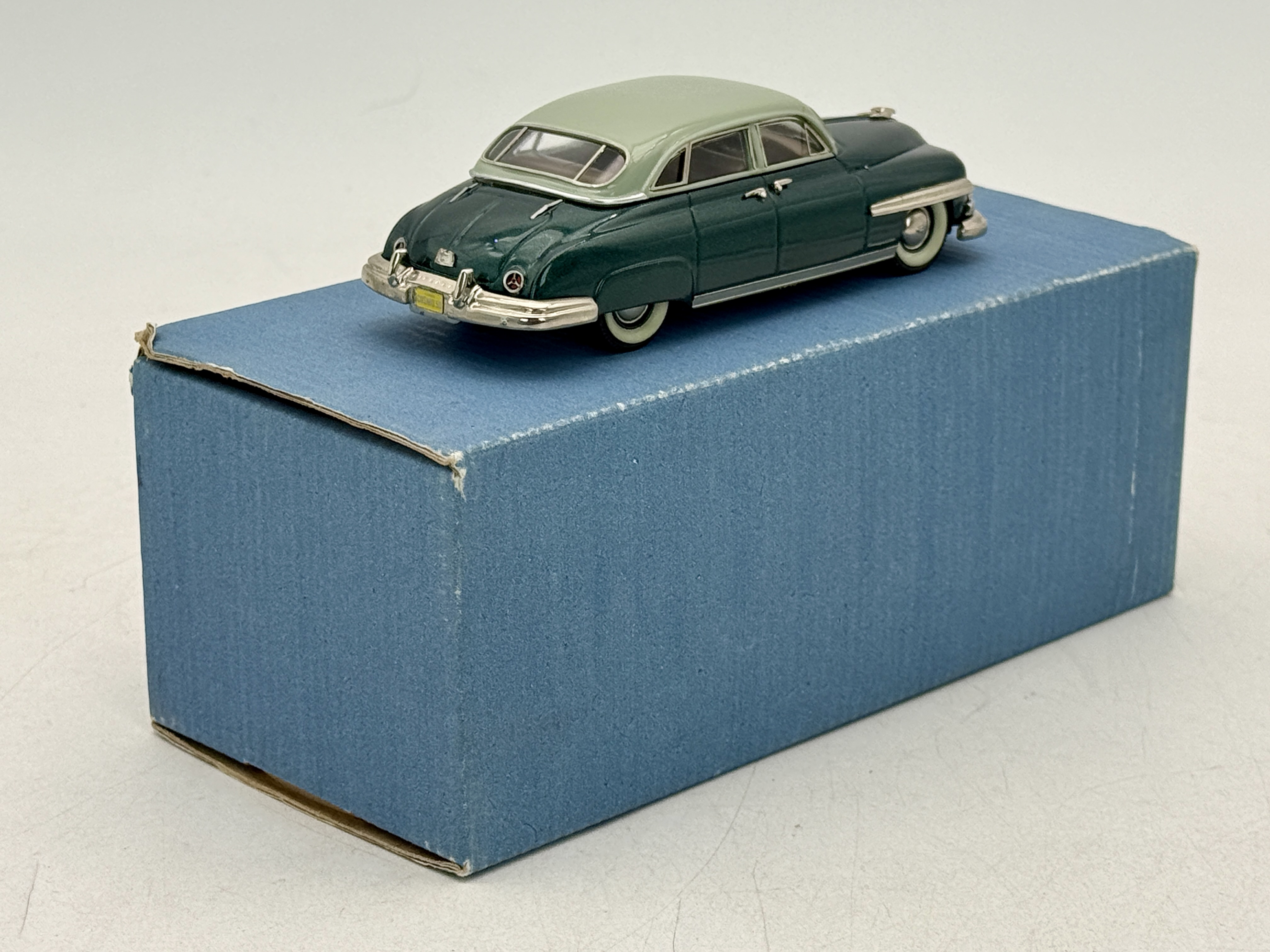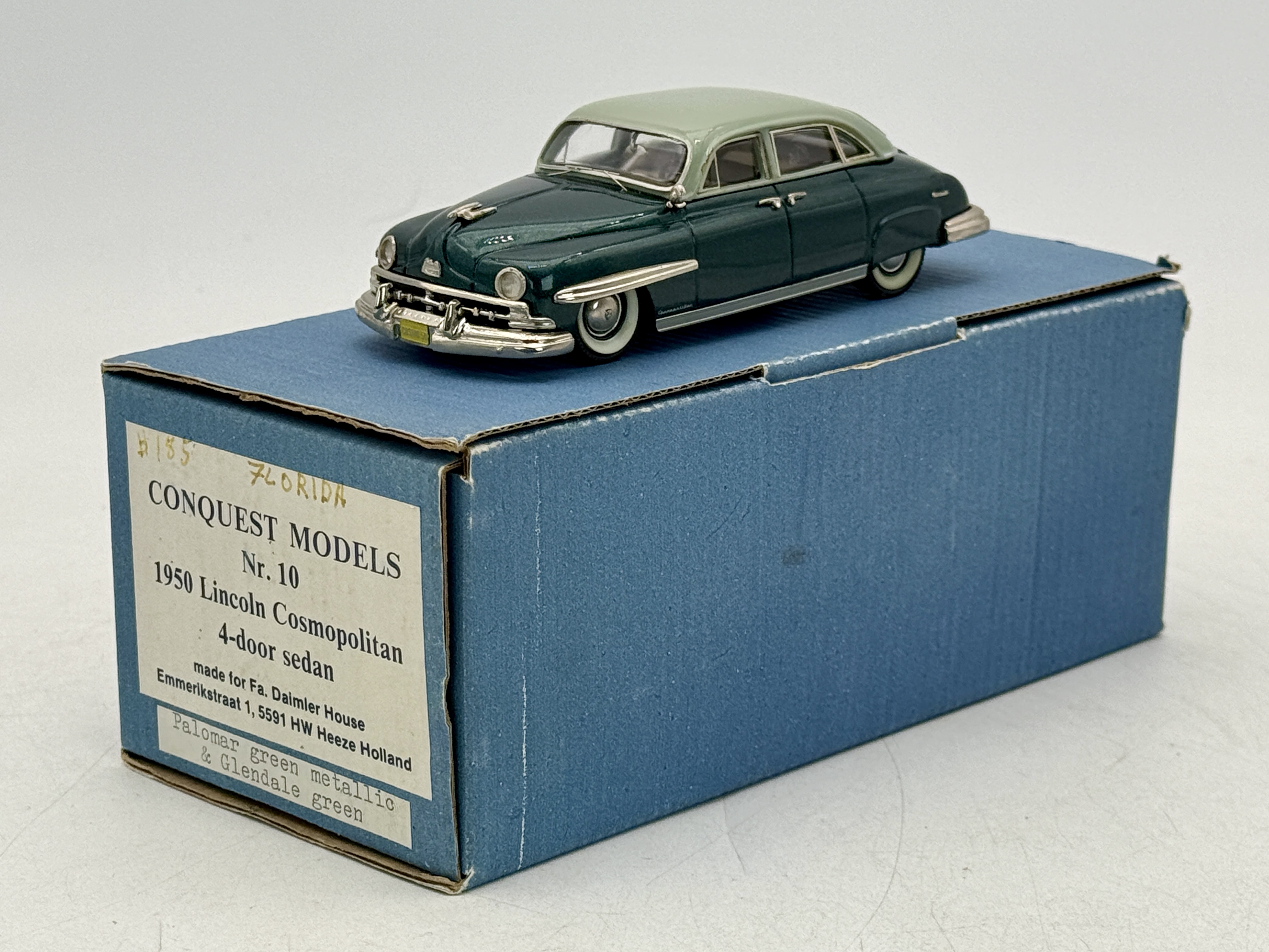 White metal, Conquest Models Nr. 10 1950 Lincoln Cosmopolitan 4-door sedan finished in Palomar green metallic and Glendale green, including its original blue box. 5″ OB and inserts C9