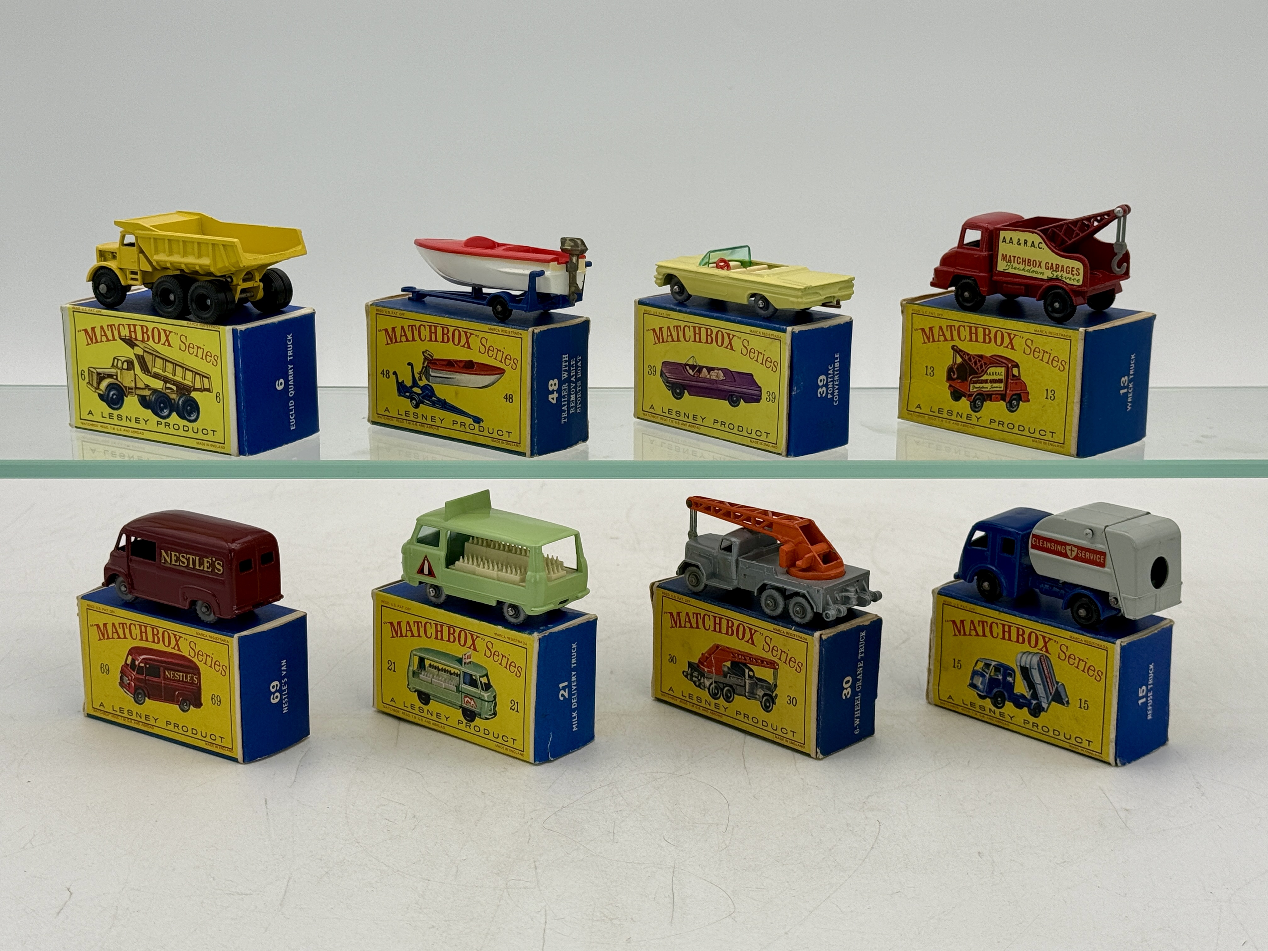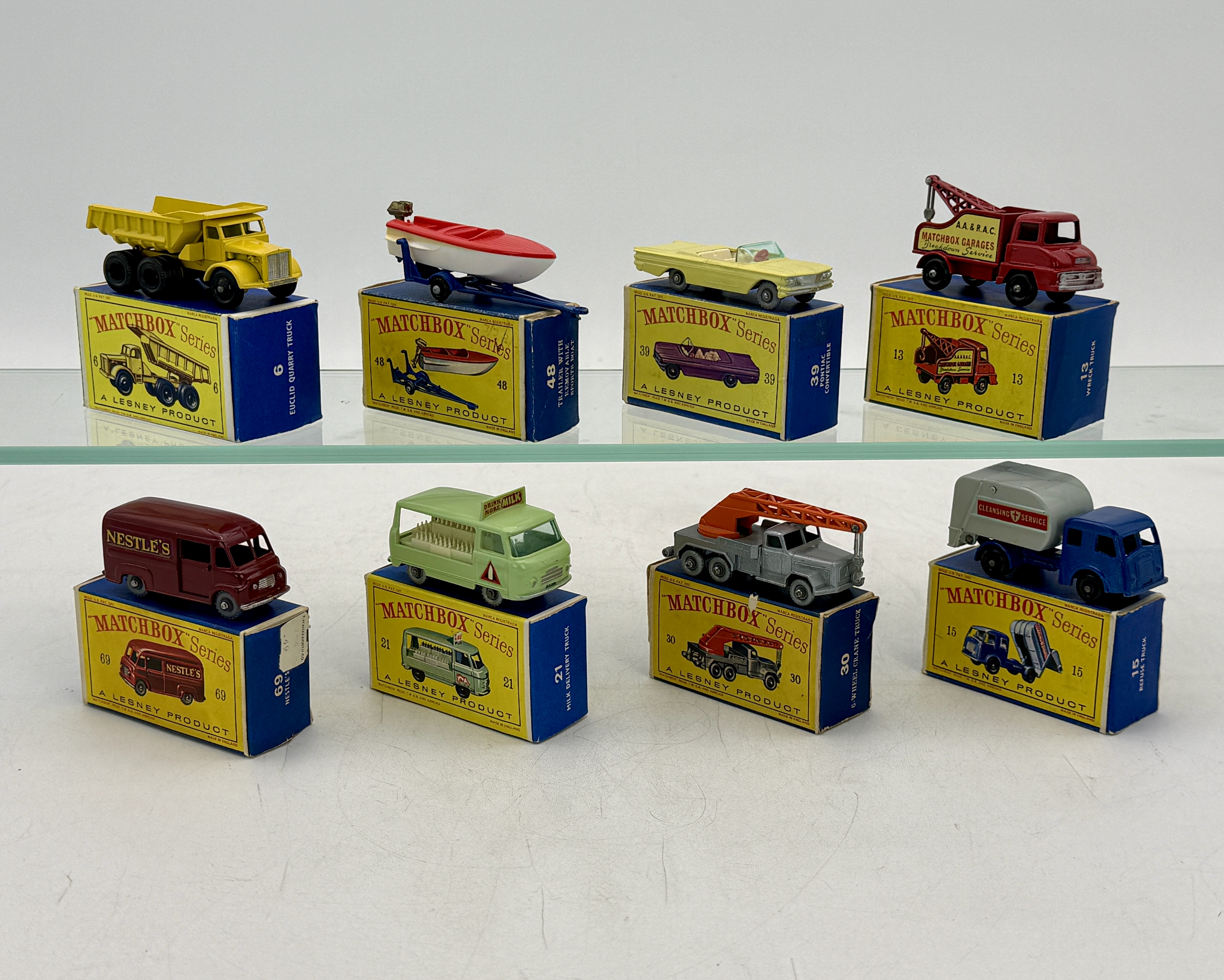 Eight matchbox vehicles, 6C2 quarry truck, 48B6 speedboat, 39B4 Pontiac, 13C4 recorder, 69A1 Nestlé’s van, 15C2 refuse truck, 21C4 milk truck, 30B5 crane truck. D style boxes minor wear C 8–9.