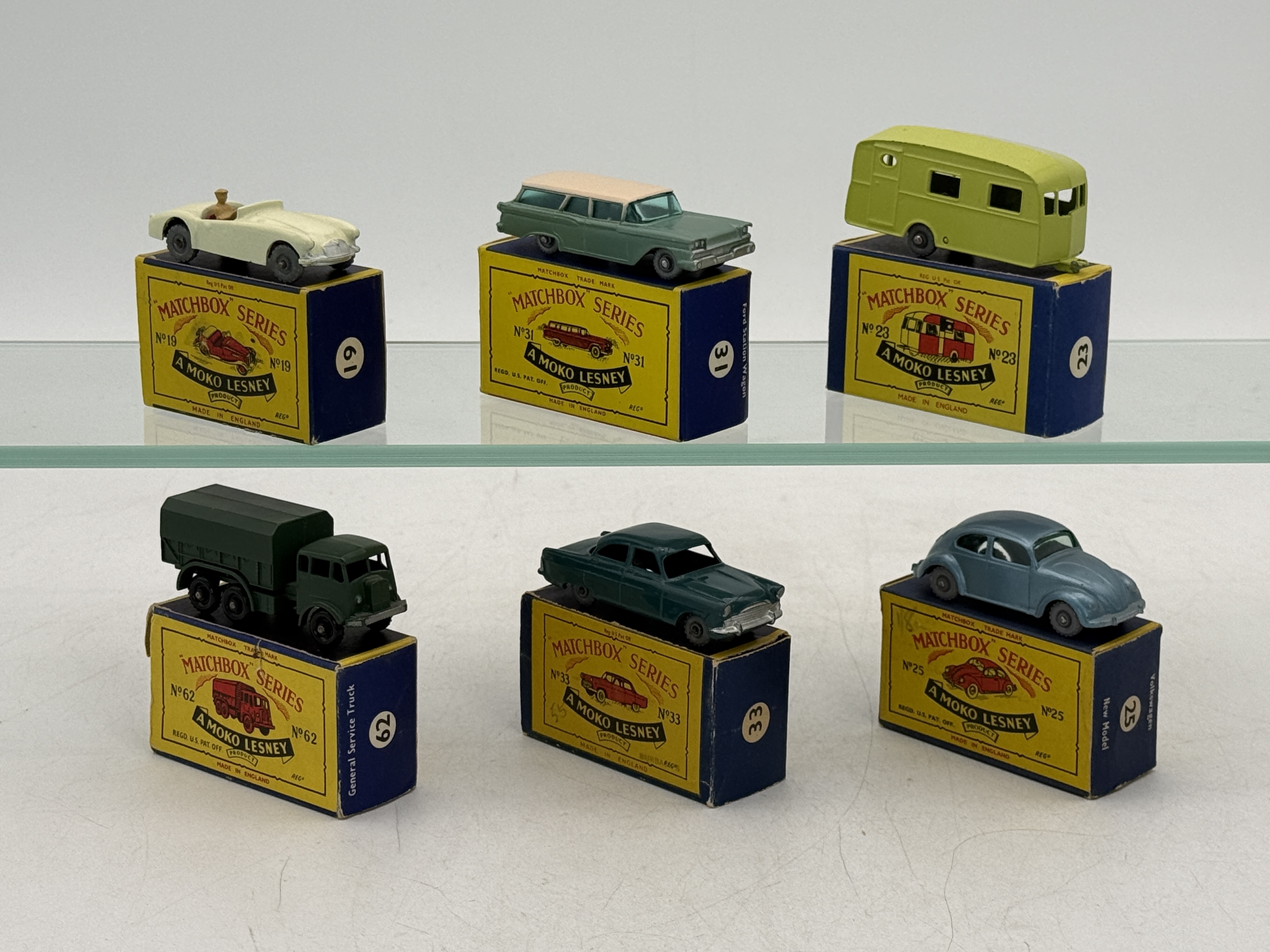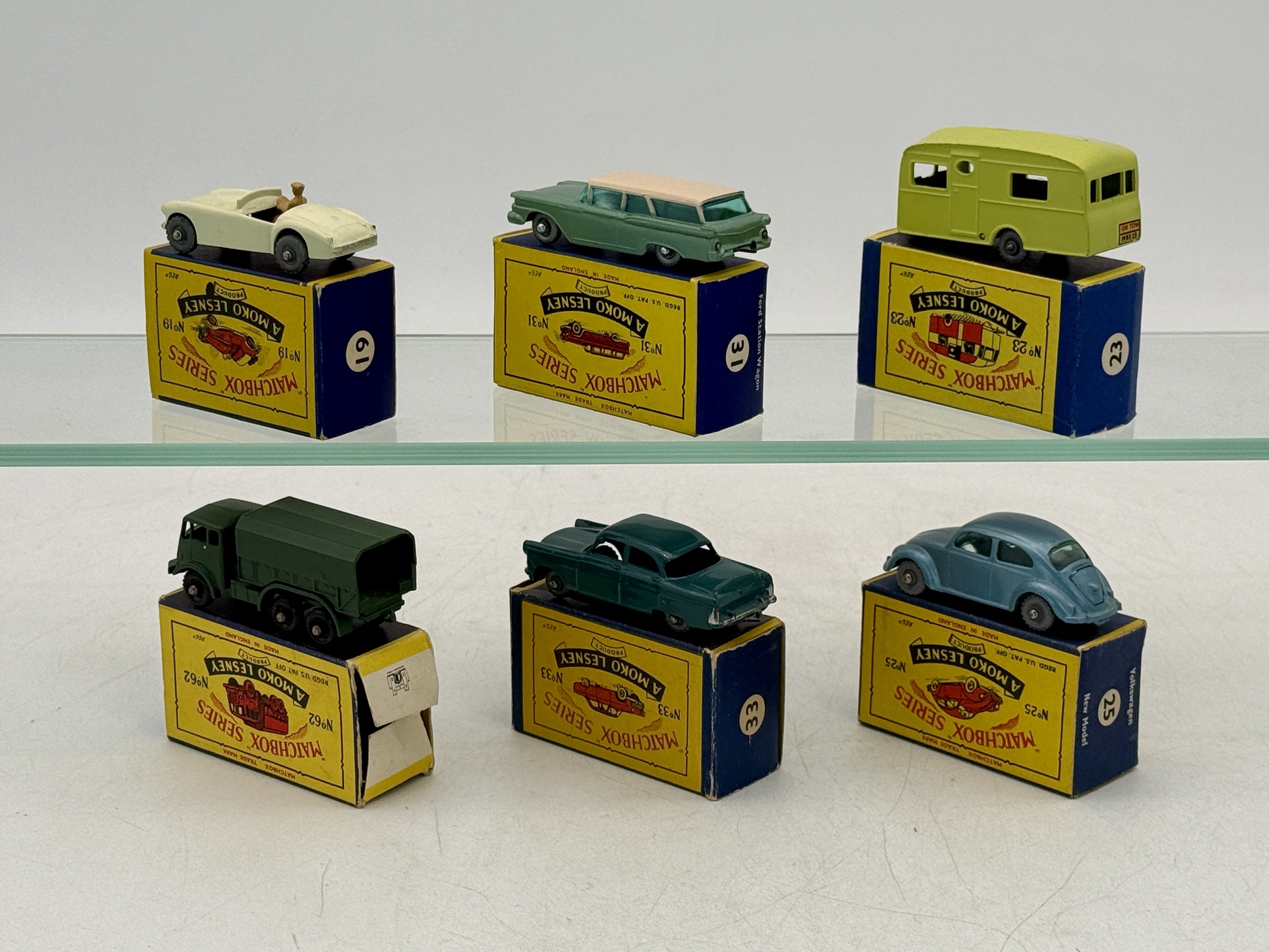Six matchbox Moko’s, 19 B2 MG sports car, 31B9 Ford wagon, 30 385 Ford Zephyr, 62 A1 pressure refuser, 25 B1 Volkswagen, 23 B3 caravan, OB’s MW one is incomplete, C 8–9